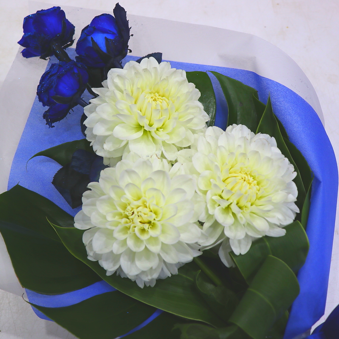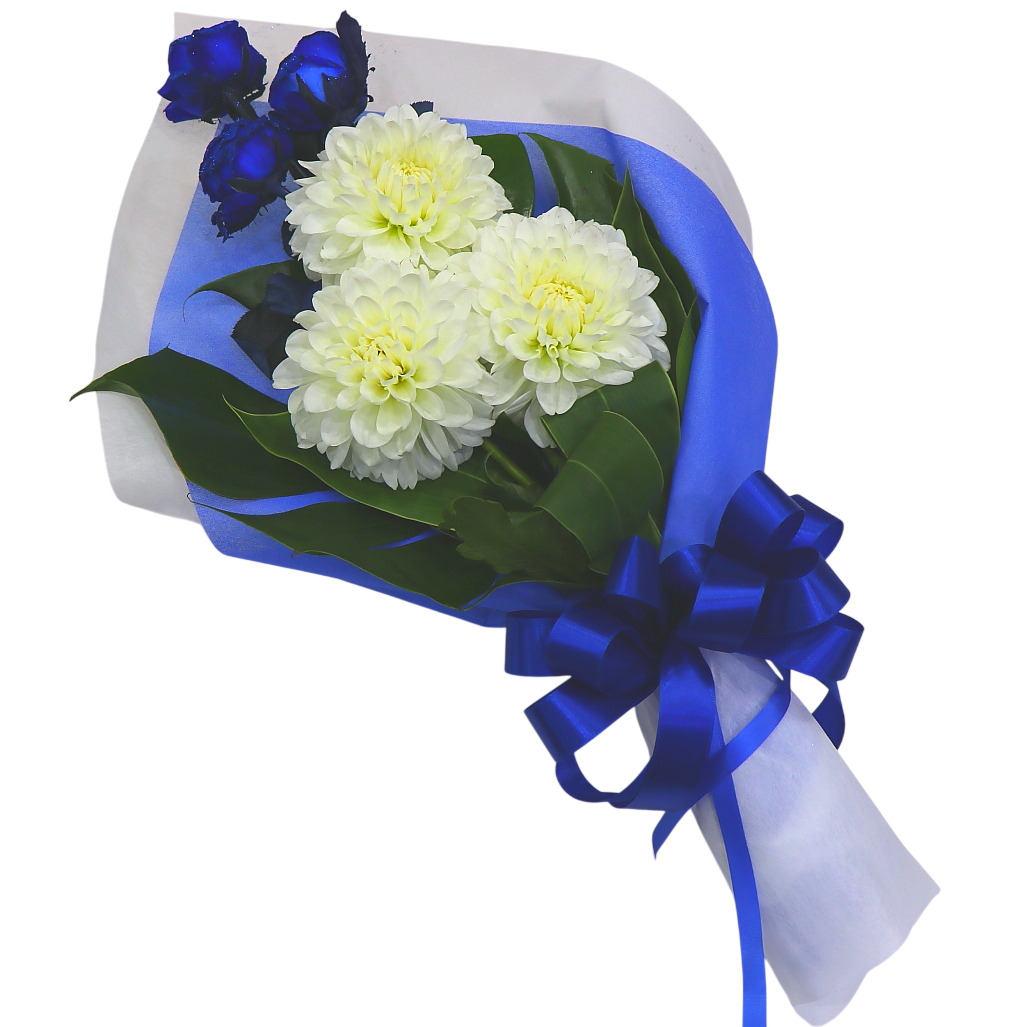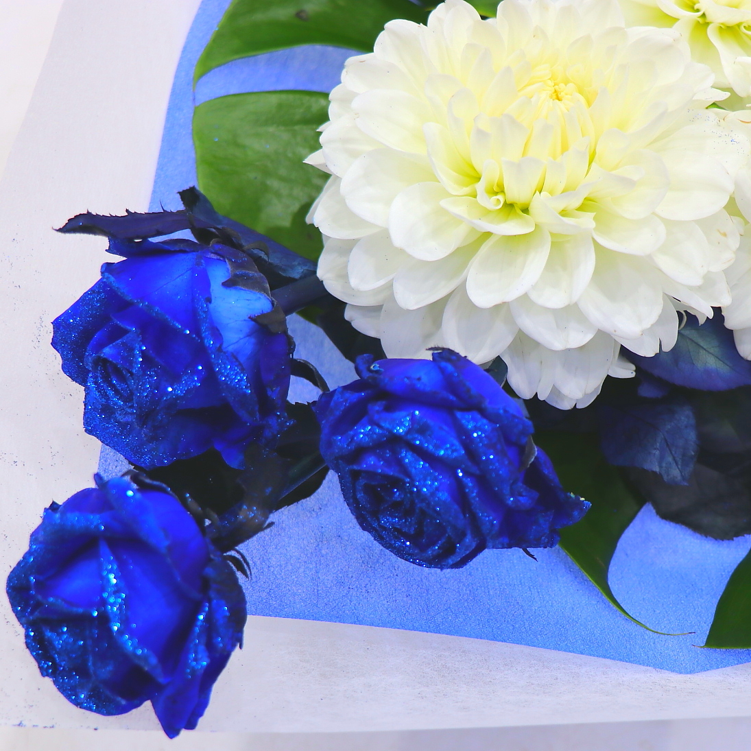 青いラメを付けた当店オリジナルで染めた青いバラと居大輪のダリアと合わせた個性的な花束。いつもとは違う贈り物におススメです。※こちらの商品についてのご相談、ご質問等ございましたら(メール)または(お電話)にて承ります。