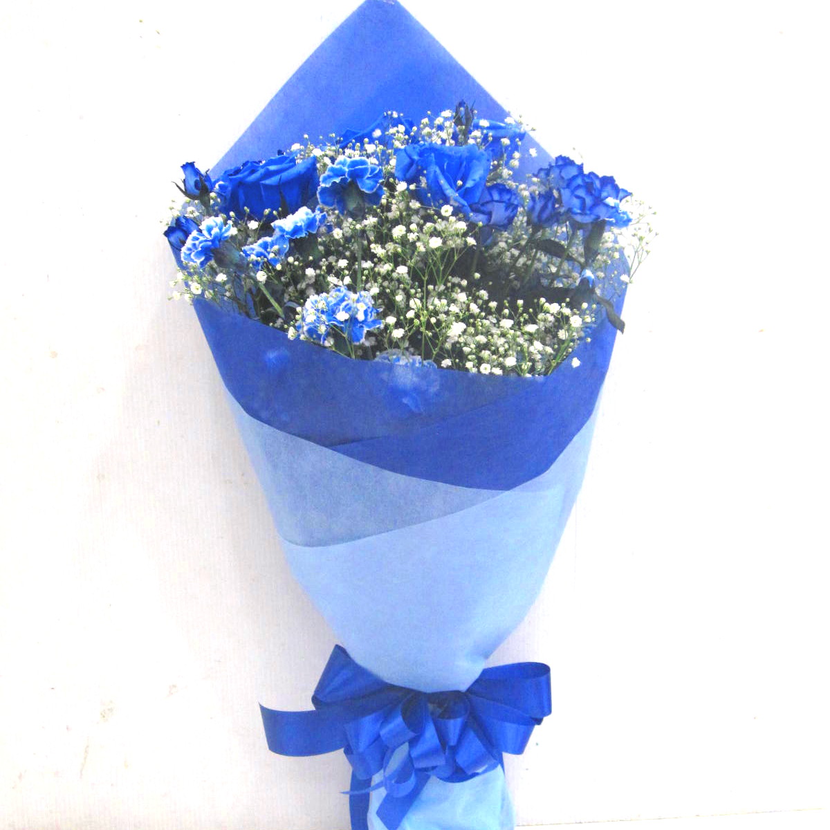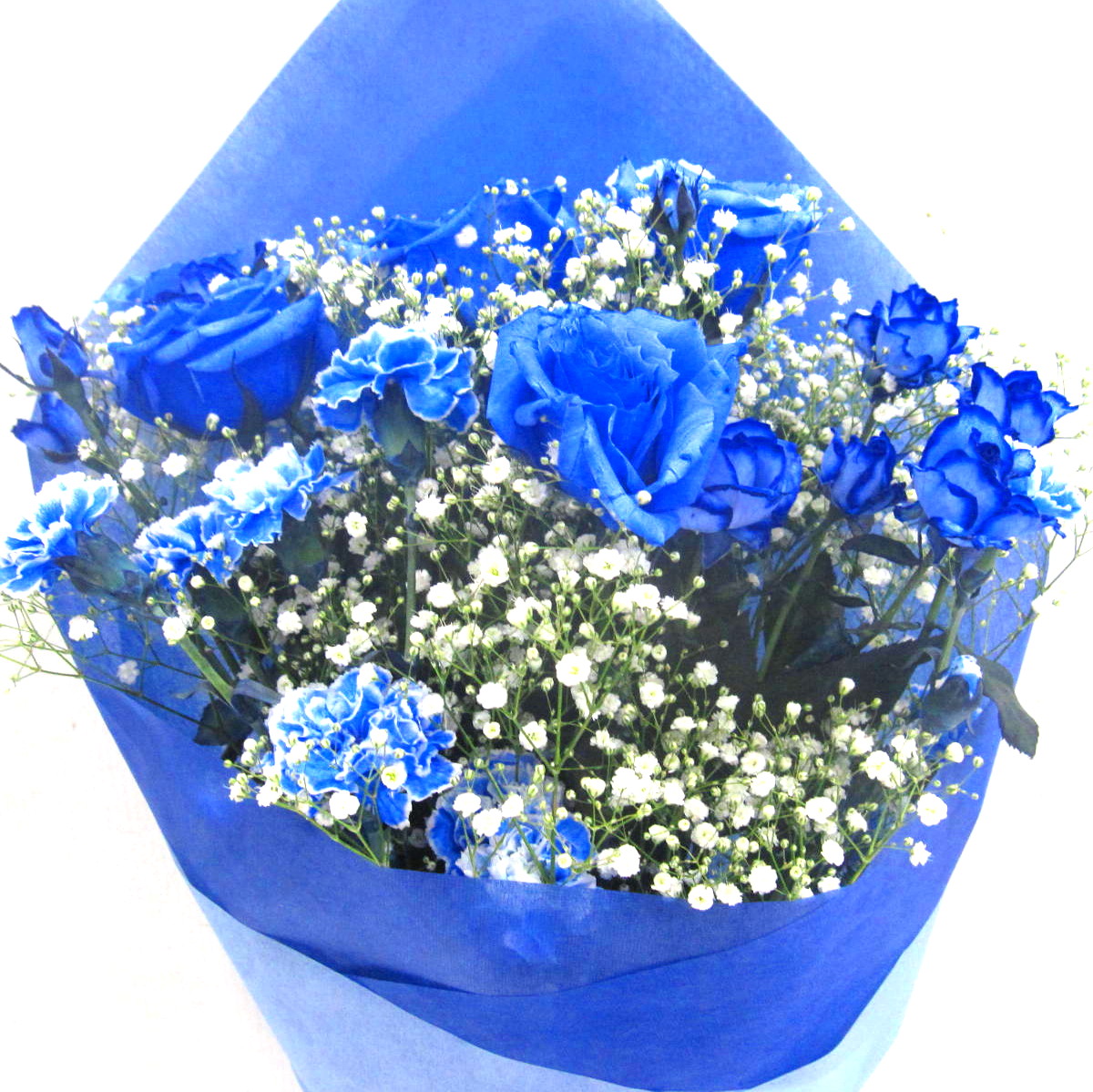 花材: メイン 【オリジナル染色】青いバラ、カーネーション、カスミソウなど その他 葉物類など