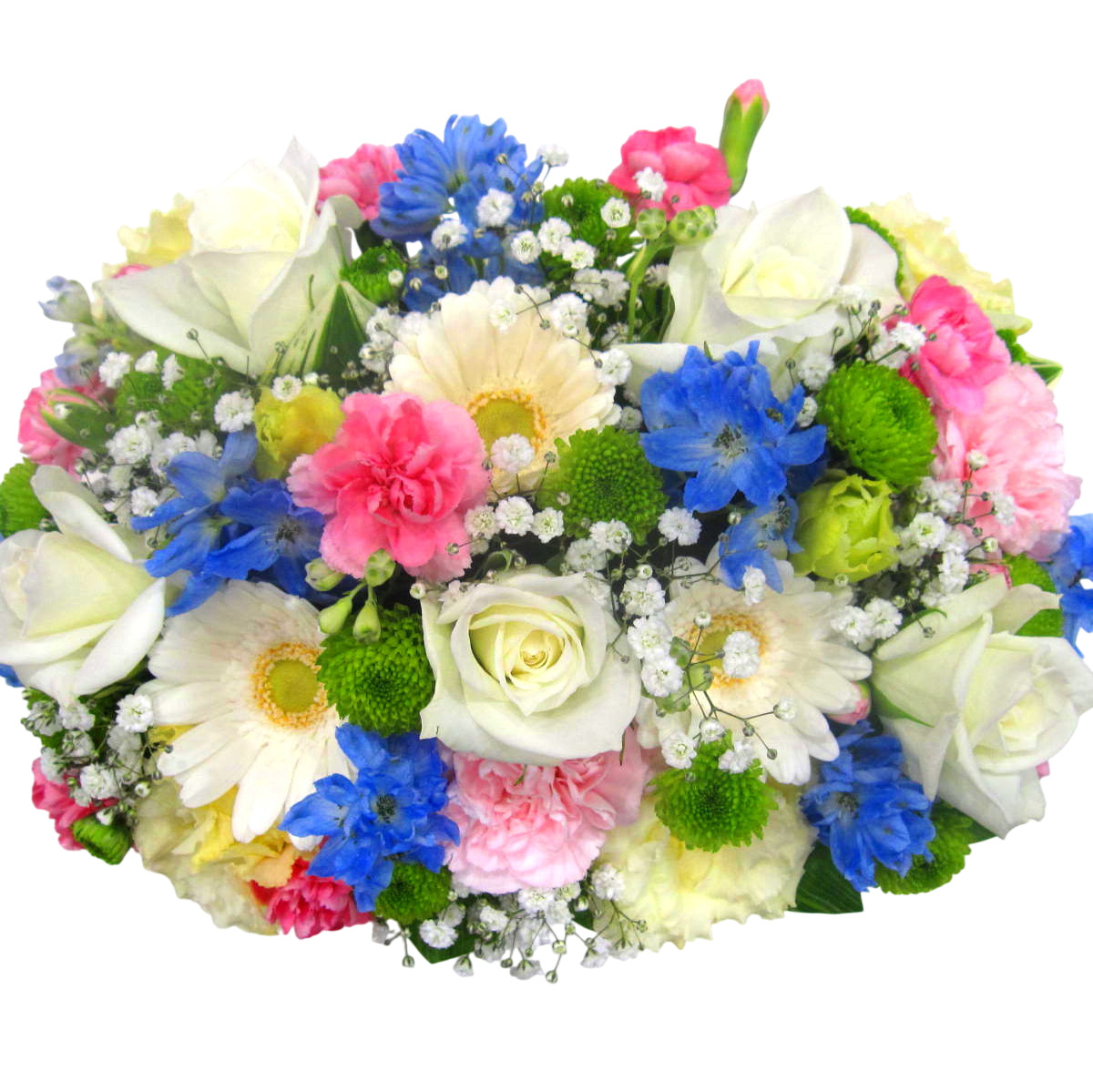 花材: メイン バラ、SPマム、トルコギキョウ、ガーベラ、カーネーション、SPデルフィニュームなど その他 カスミソウ、葉物類など