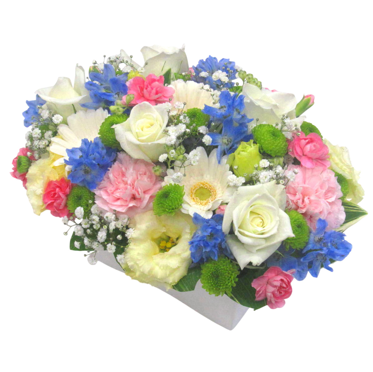 人気のあるお花「バラ」「ガーベラ」「トルコギキョウ」などでまとめた「ギュッ」としたミックス系アレンジメント。【15時迄のご注文で翌日届きます】※こちらの商品についてのご相談、ご質問等ございましたら(メール)または(お電話)にて承ります。