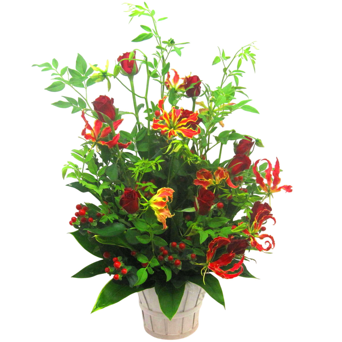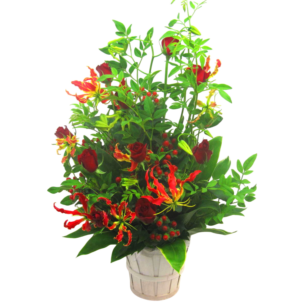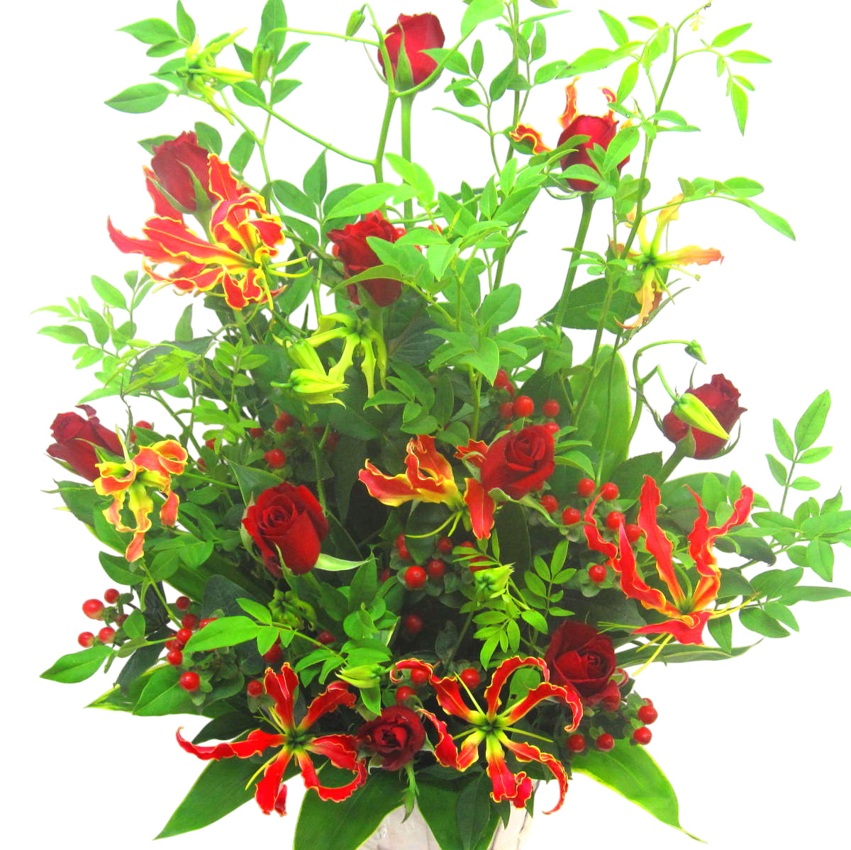 花材: メイン バラ、グロリオサ、葉物類など その他 ギフト用に綺麗に美しくラッピング致します。