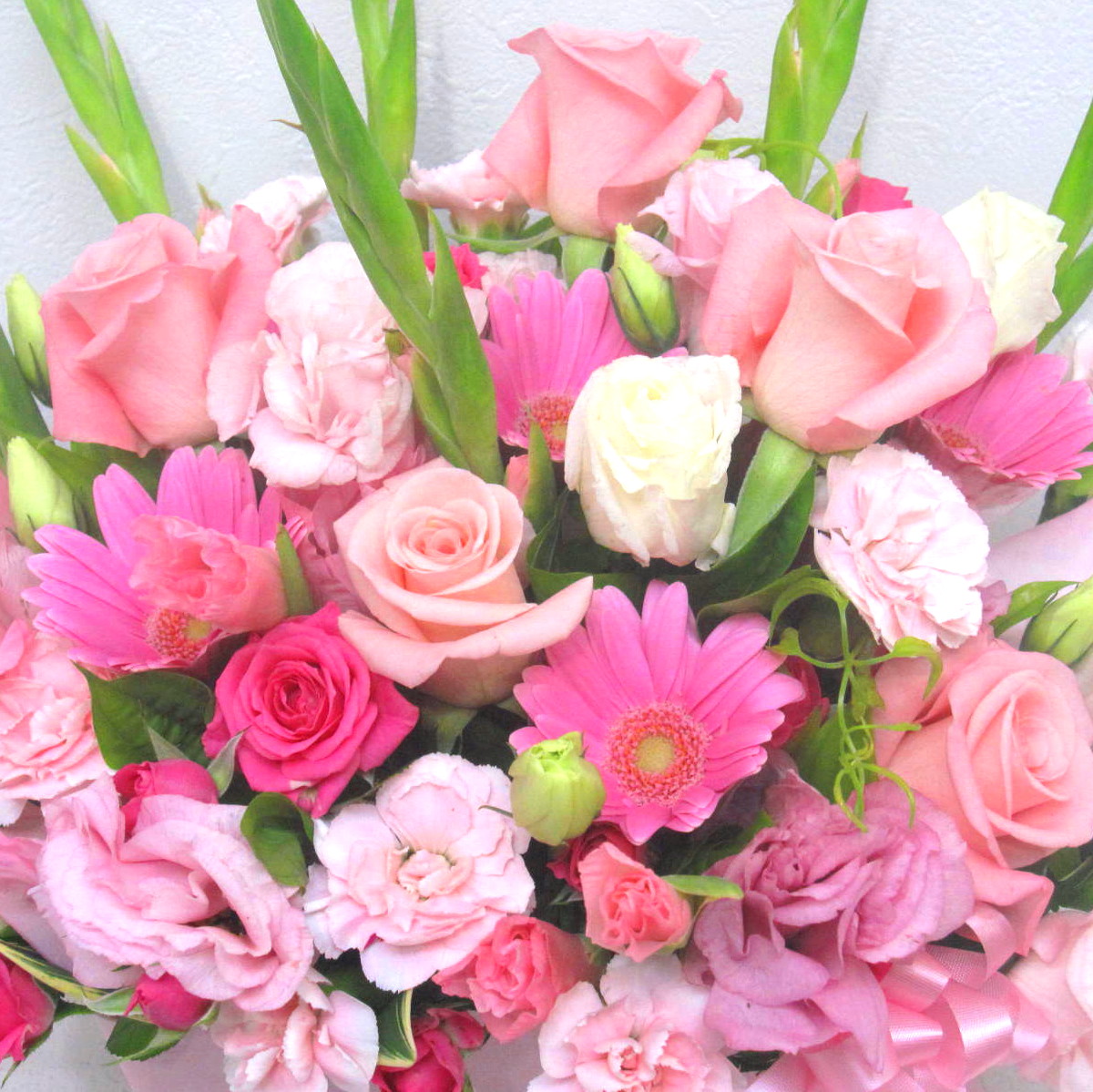 花材: メイン グラジオラス、バラ、カーネーション、トルコギキョウ、ガーベラなど その他 葉物類など