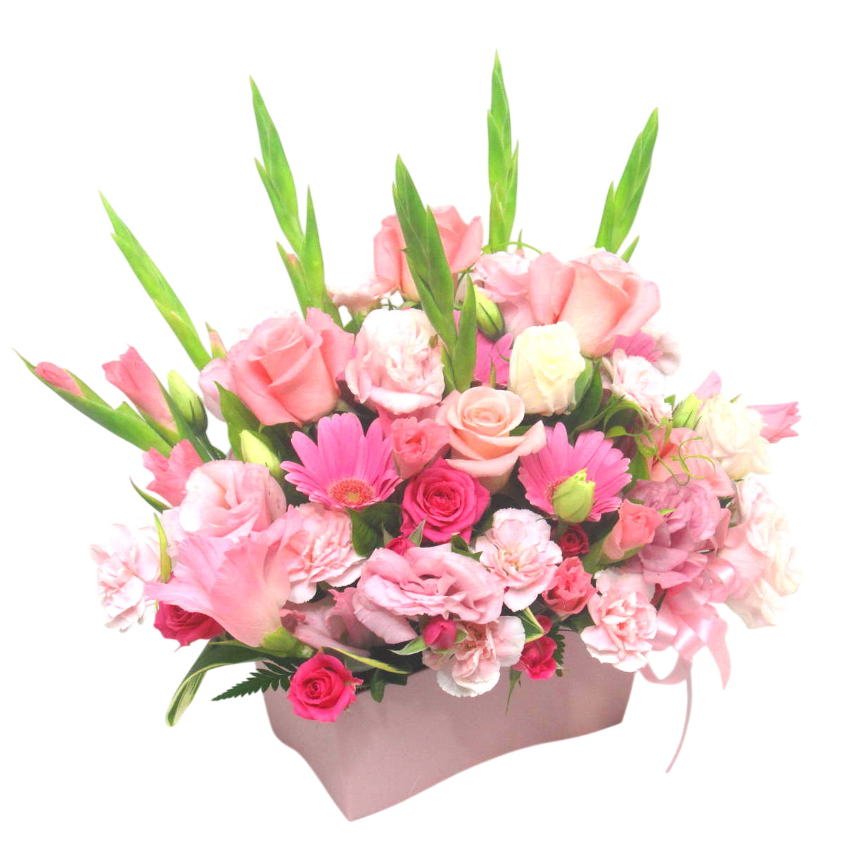 ピンク系のお花を主体とした華やかなアレンジメント。さまざまなお祝いの贈り物にオススメです。【15時迄のご注文で翌日届きます】※こちらの商品についてのご相談、ご質問等ございましたら(メール)または(お電話)にて承ります。