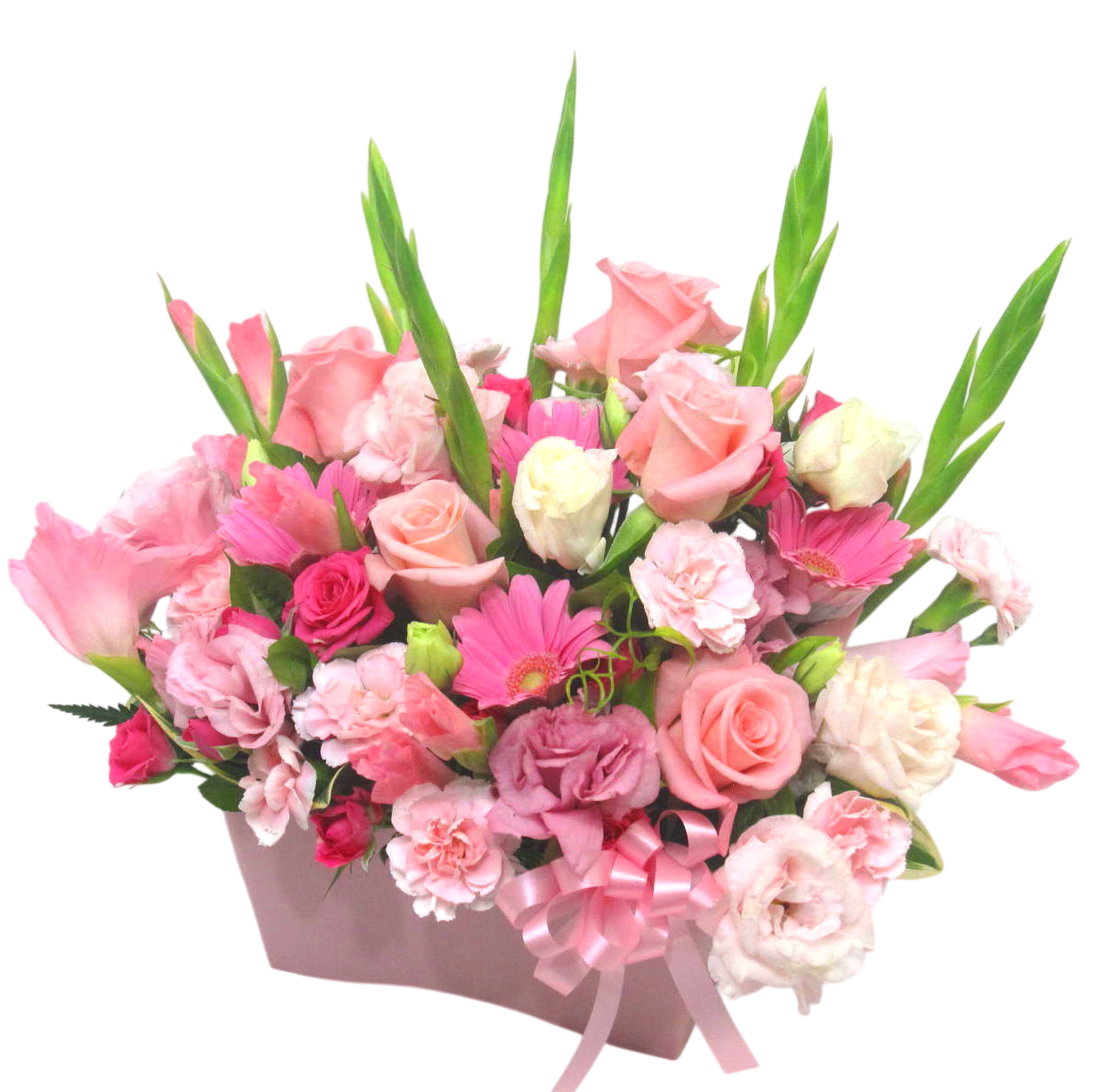 ピンク系のお花を中心とした華やかなお祝いアレンジメントです。バラやトルコギキョウ、カーネーションなど花持ちも良いお花を中心に上品な雰囲気でお作り致します。また、ご利用されたお客様から「大変花持ちが良い」と好評をいただいております。静岡県長泉町から日本全国【真心】込めてお届けいたします。さまざまなご用途に贈る贈り物としてオススメです。大切な方へ贈るフラワーギフトやプレゼントなら「花樹園オンラインドットコム」に是非、お任せ下さいませ。