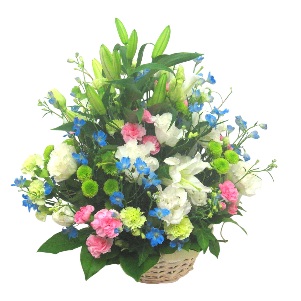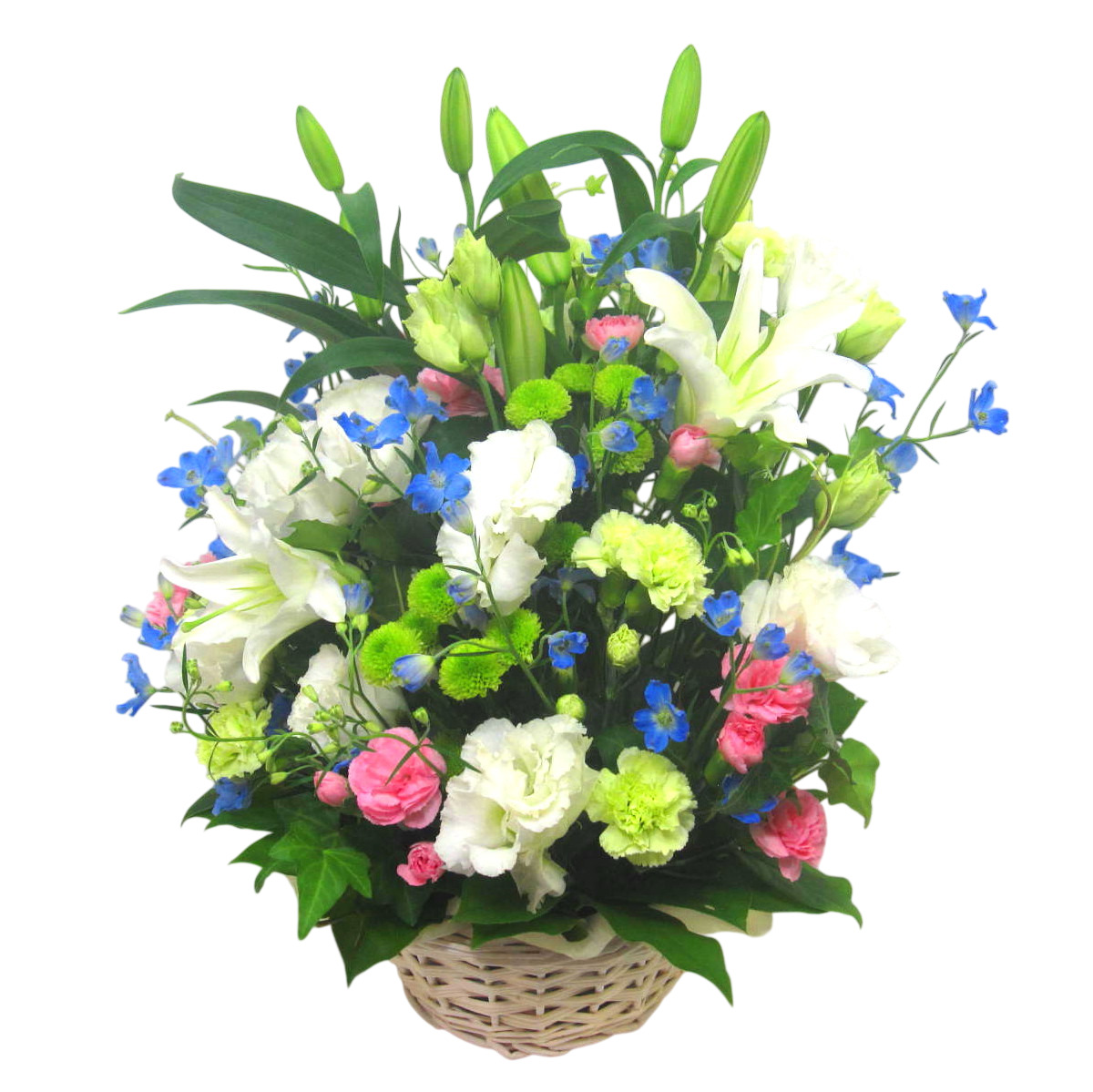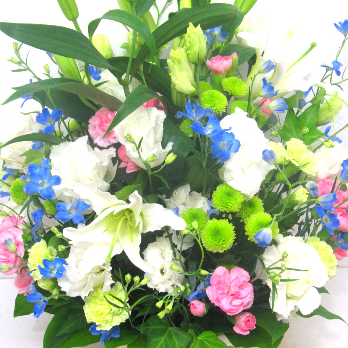 花材: メイン ユリ、SPデルフィニューム、カーネーション、SPマム、トルコギキョウなど その他 葉物類など