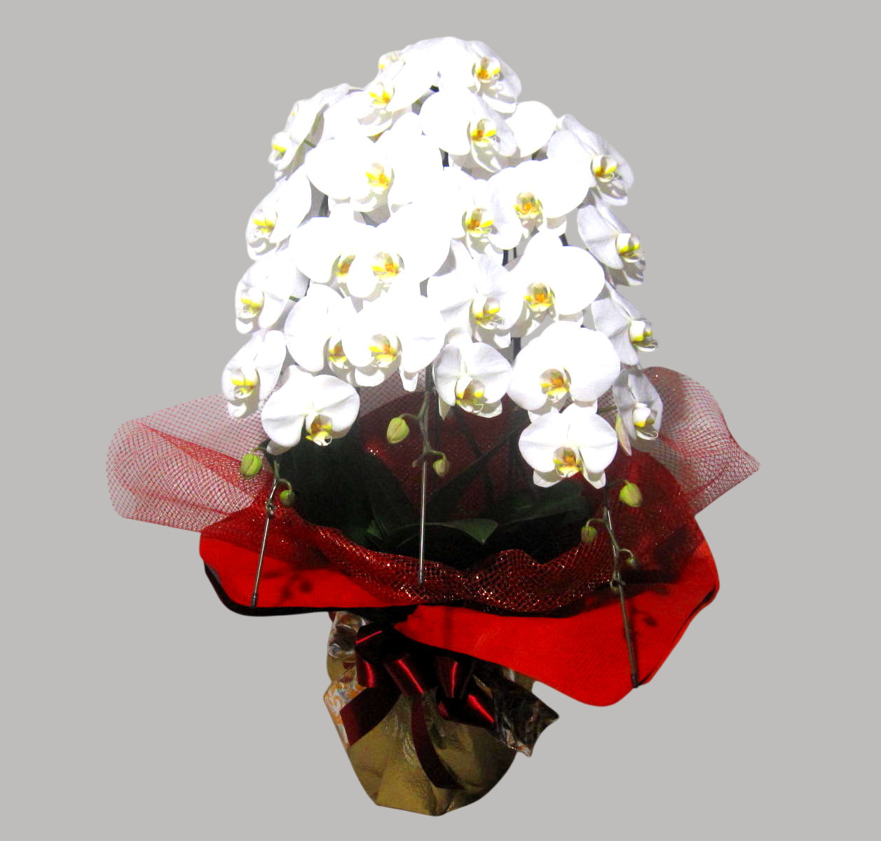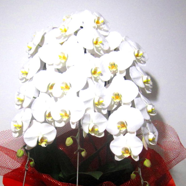 大輪の白色が美しい上品な花びらとズッシリトした佇まい、そしてだれにも真似できない煌びやかな最高級のエレガントラッピングがまさにプレミア級の胡蝶蘭。輪数は38輪以上となります。ちょっぴりいつもと違うお祝いギフトにオススメです。※こちらの商品についてのご相談、ご質問等ございましたら(メール)または(お電話)にて承ります。
