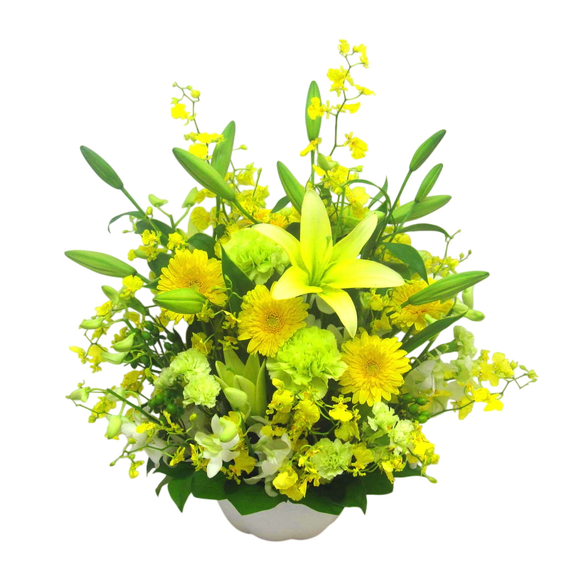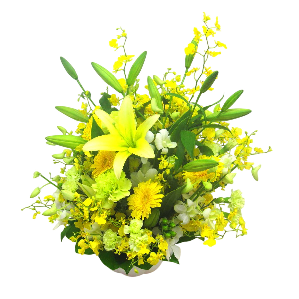 存在感のある「ユリ」や上品な「オンシジューム」を中心に黄色系のお花を入れてボリュームよく制作いたします。また、その日、市場から入荷した鮮度の良いお花でお作りしますので花持ちが良く、ご利用いただいたお客様から「大変花持ちが良い」と高い評価をいただいております。目を閉じて心の中にいる故人への想いをそっと呼び起こします。当店では、お客様のその想いをしっかりと受け止め、心を込めて制作致します。静岡県から全国へお届けします。春の故人を偲ぶ色々なシーンで是非、ご利用下さい。