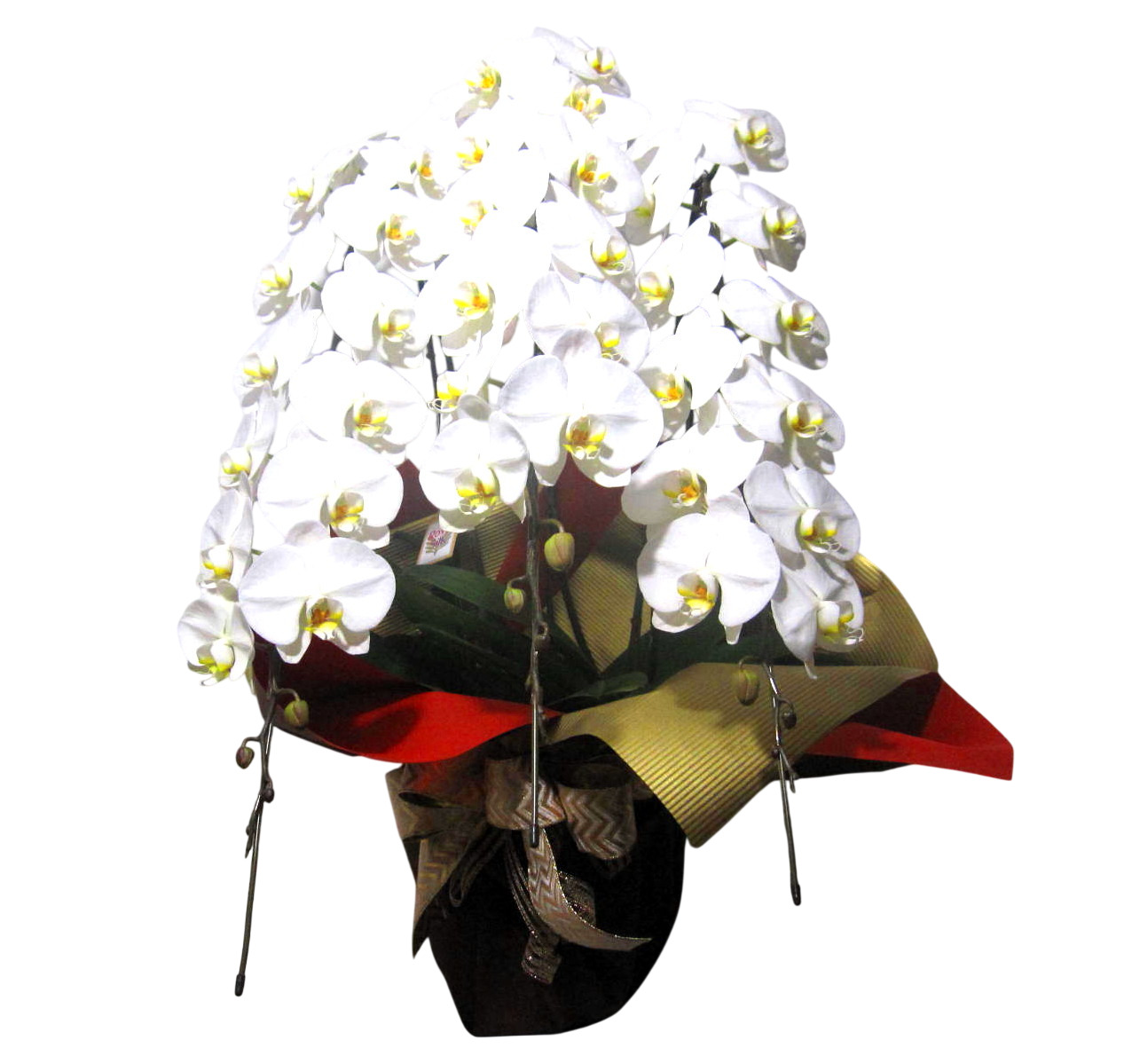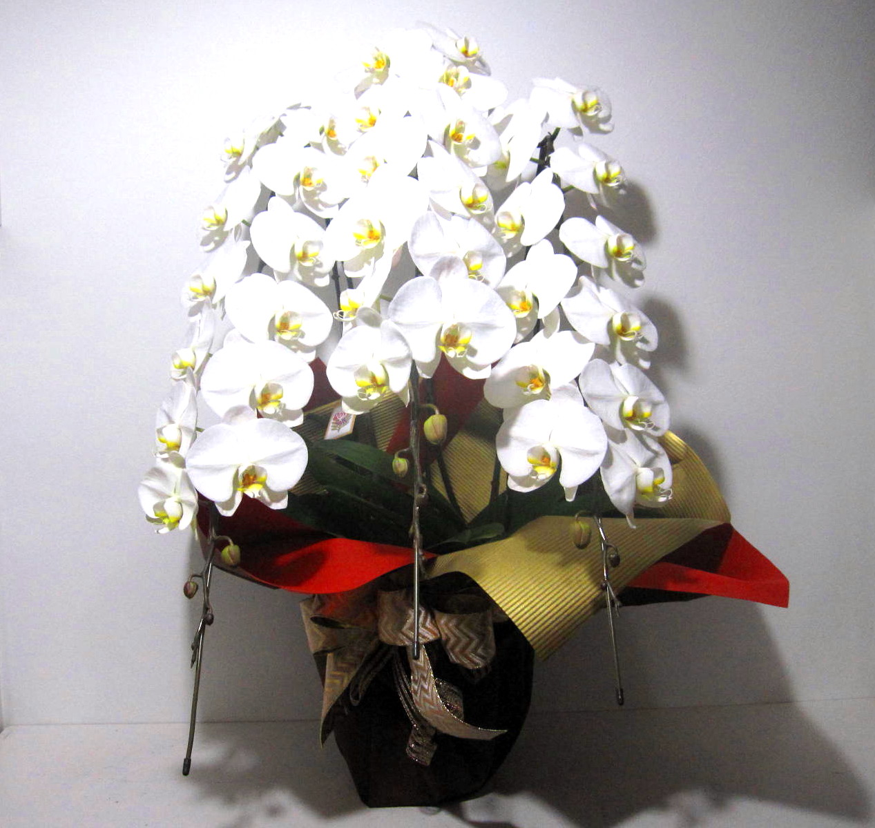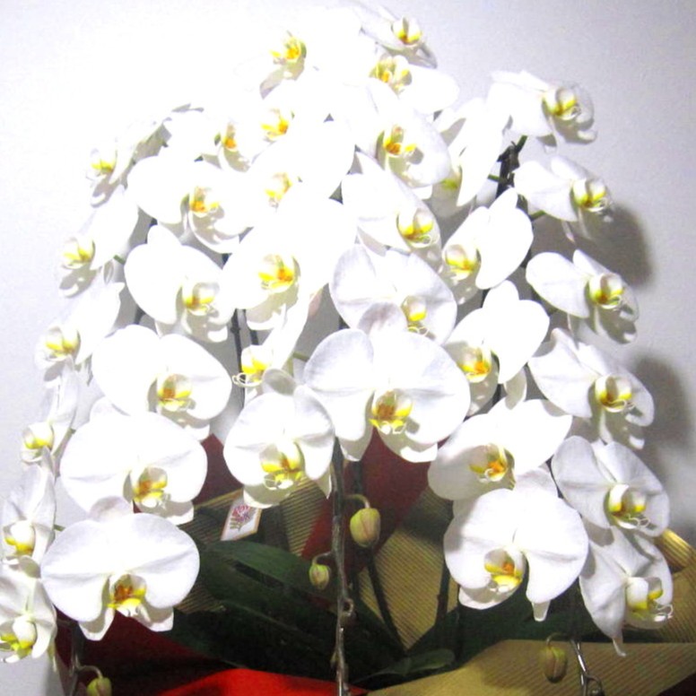 大輪の白色が美しい上品な花びらとズッシリトした佇まい、そしてだれにも真似できない煌びやかな最高級のエレガントラッピングがまさにプレミア級の胡蝶蘭。輪数は44輪以上となります。ちょっぴりいつもと違うお祝いギフトにオススメです。※こちらの商品についてのご相談、ご質問等ございましたら(メール)または(お電話)にて承ります。