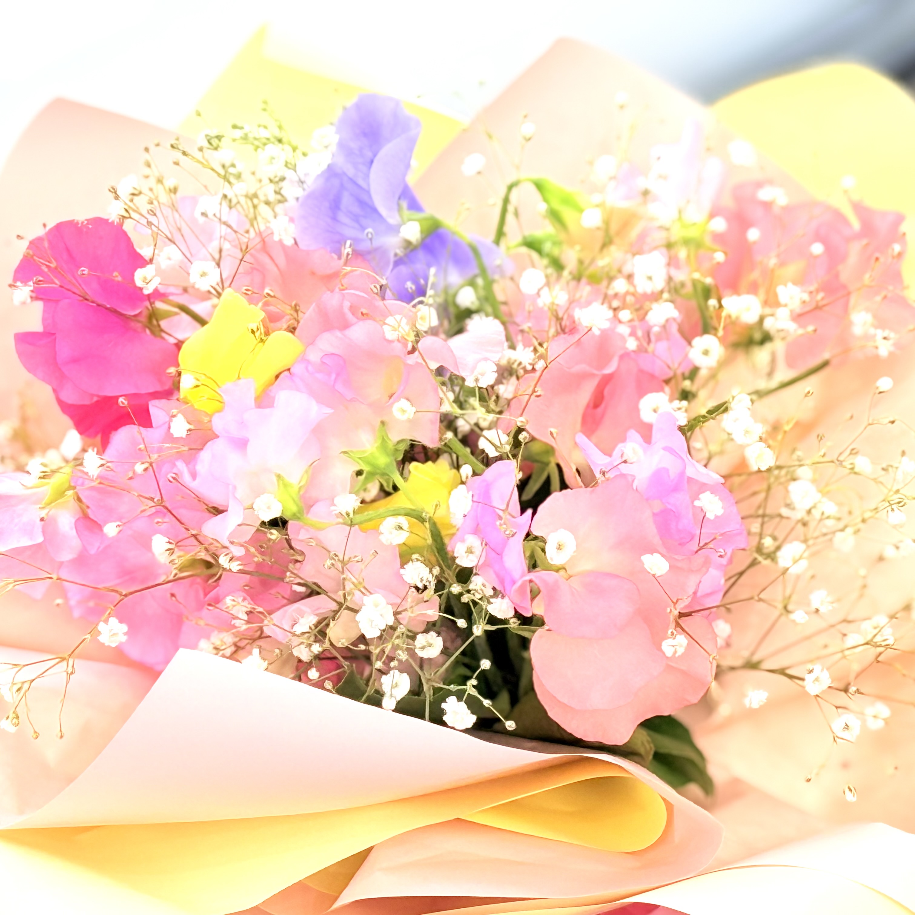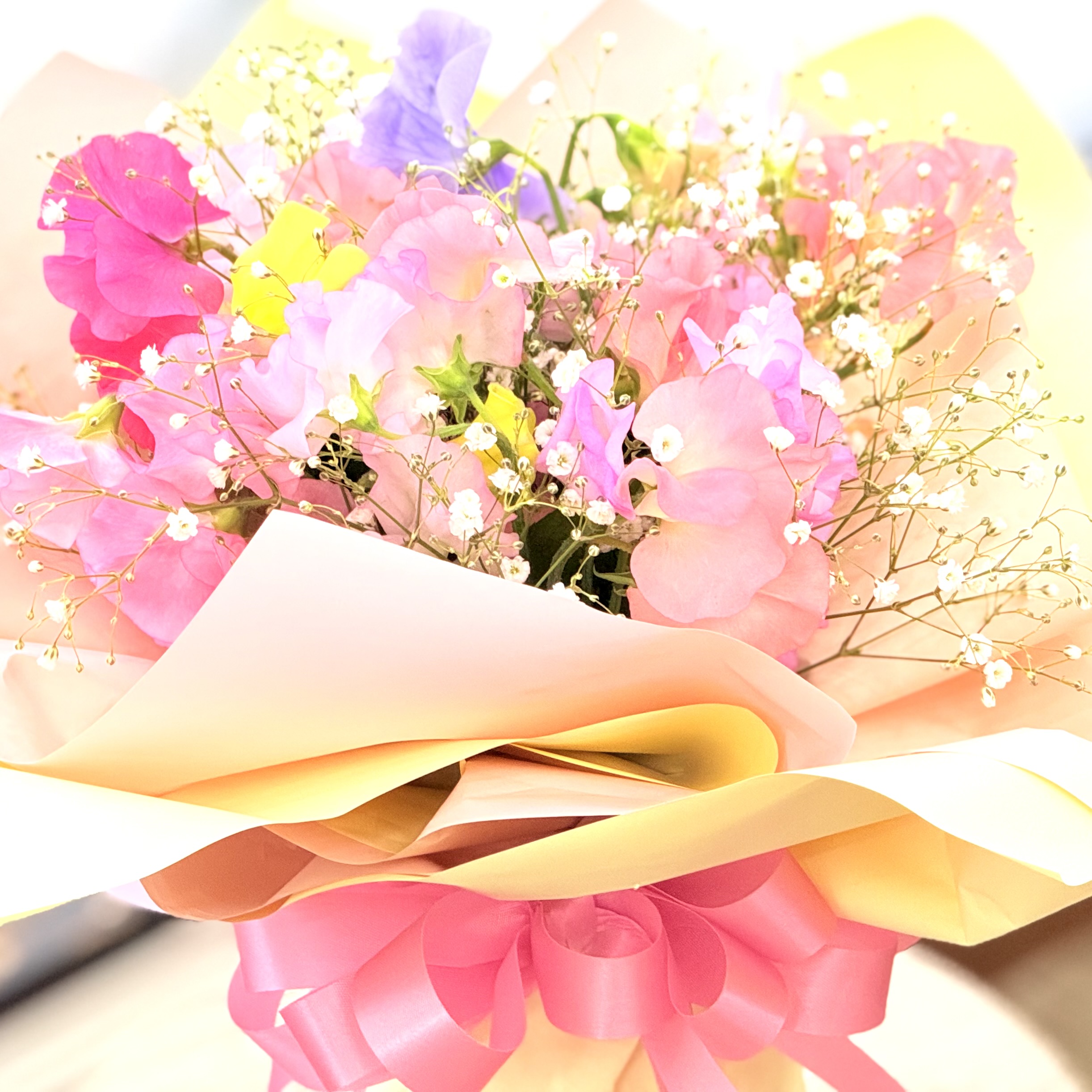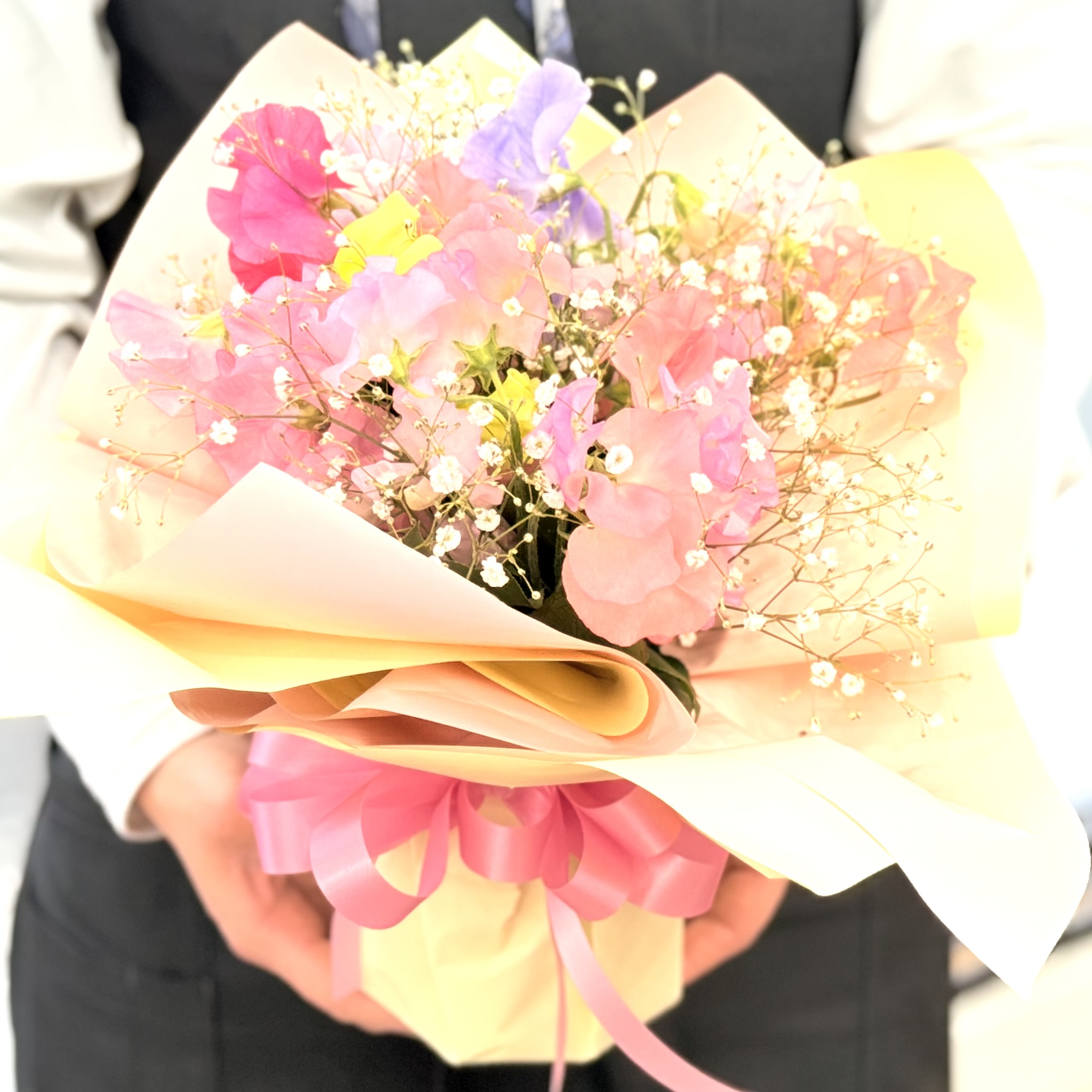 春のこの季節しかない花「スイートピー」のみと「かすみ草」を入れたそのまま飾れる花束、さまざまなご用途におすすめです!【15時迄のご注文で翌日届きます】※こちらの商品についてのご相談、ご質問等ございましたら(メール)または(お電話)にて承ります。