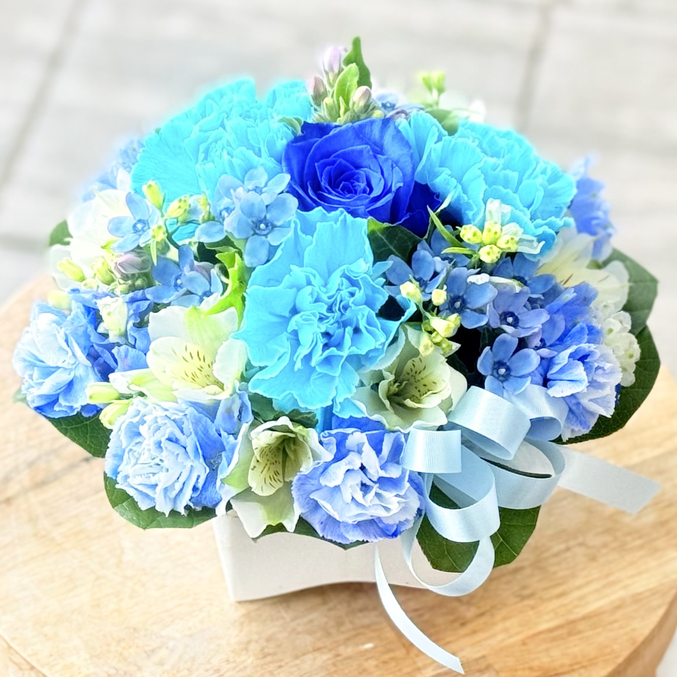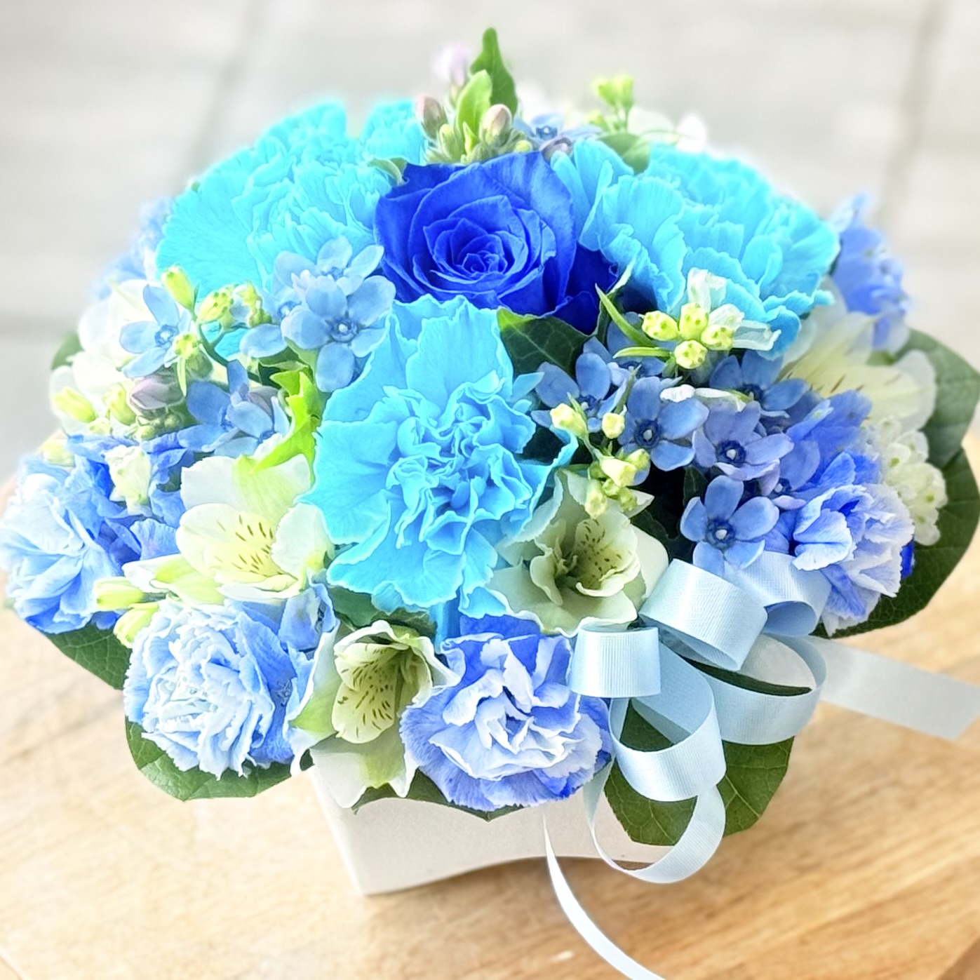 水色のカーネーションメインにした「コロン」としたアレンジメントです。水色系のさわやかな色合いなのでどんな贈り物にもきっと喜ばれるでしょう。飾る場所にも困らずに、リビングのテーブルなどに飾って楽しめます。また、ご利用されたお客様から「大変花持ちが良い」と好評をいただいております。静岡県長泉町から日本全国【真心】込めてお届けいたします。さまざまなご用途に贈る贈り物としてオススメです。大切な方へ贈るフラワーギフトやプレゼントなら「花樹園オンラインドットコム」に是非、お任せ下さいませ。