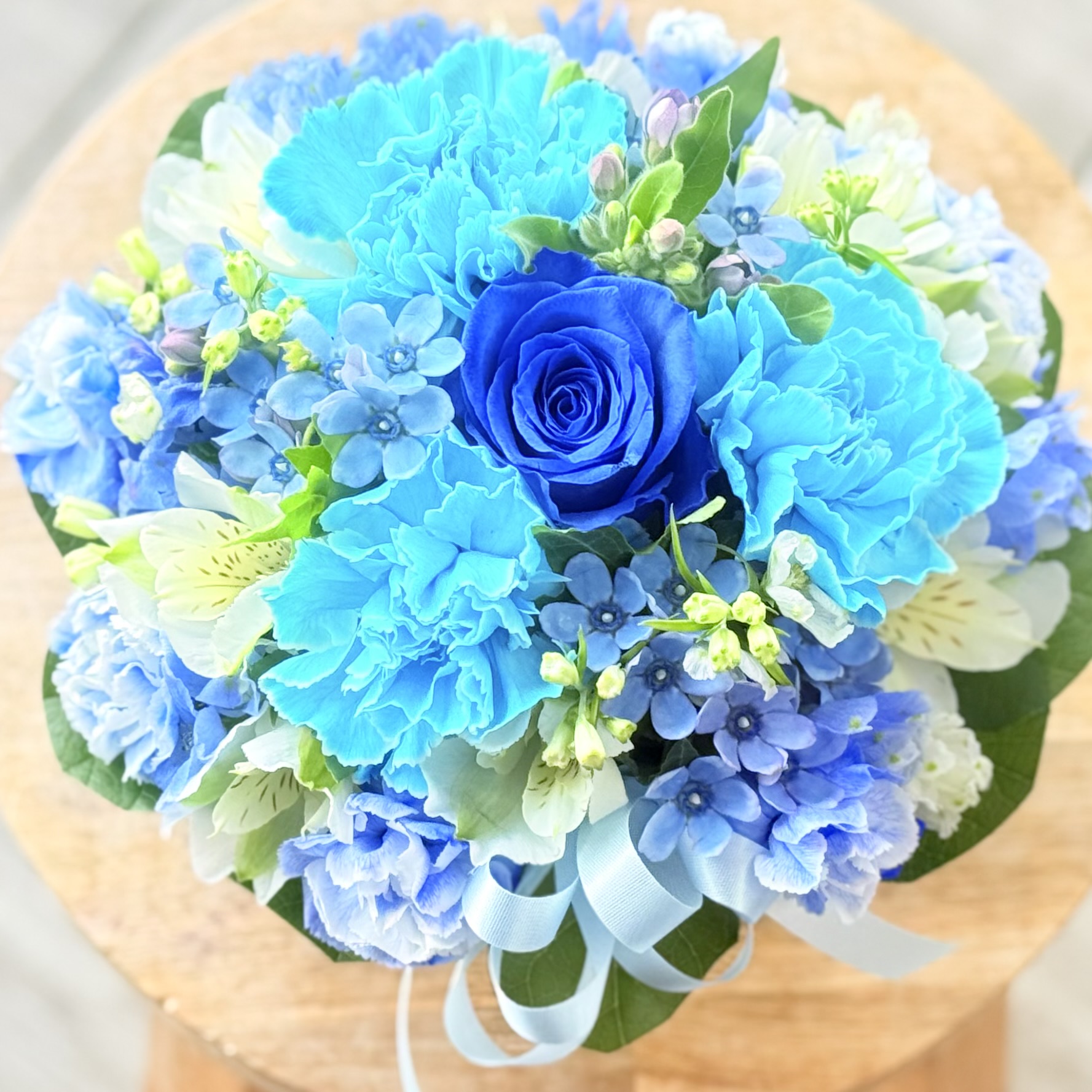 水色系の爽やかな色合いのアレンジメント。コロンとした雰囲気がとっても可愛らしいですよ。【15時迄のご注文で翌日届きます】※こちらの商品についてのご相談、ご質問等ございましたら(メール)または(お電話)にて承ります。