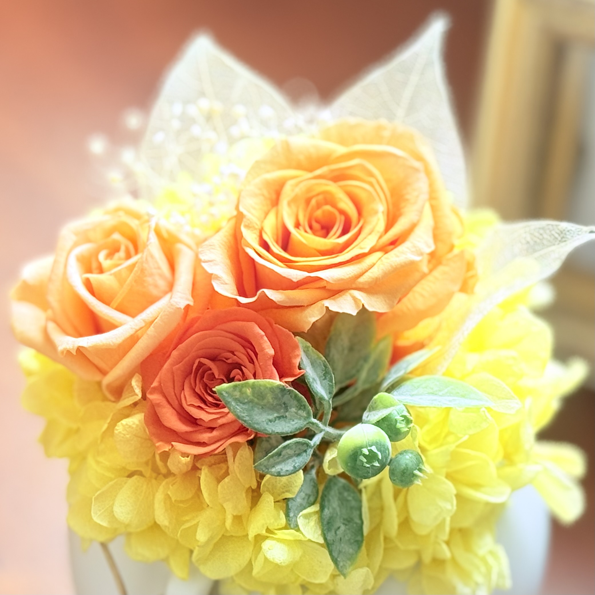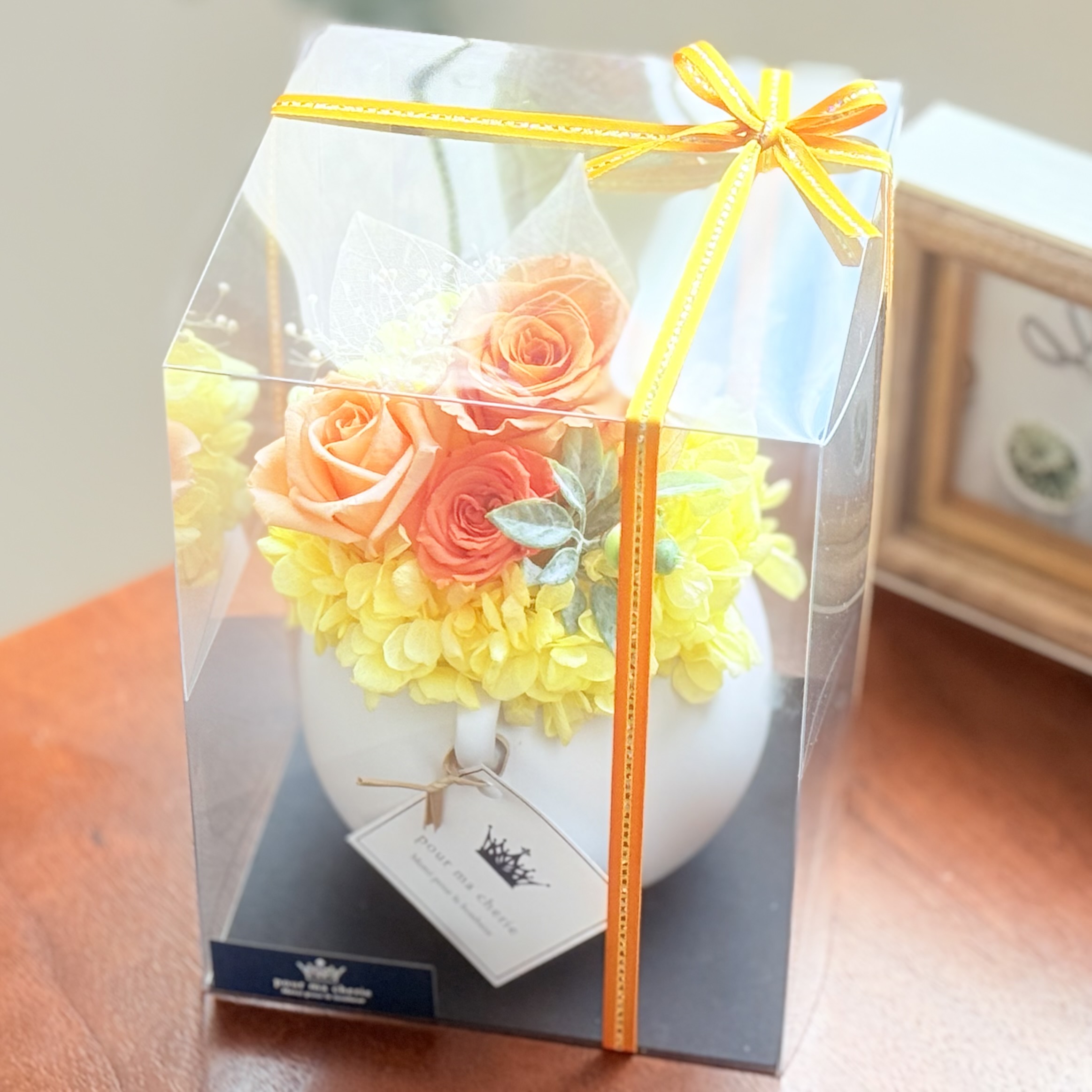 プリザーブドフラワーのバラを主体としたオレンジ系のプリザーブドフラワーです。ボリューム感もありおすすめです。また、どんなお部屋に飾っても映えるのでご自宅用にインテリアとしても長く楽しめますよ。是非、想いを込めたフラワーギフトにいかがですか!?※プリザーブドフラワーとは、生花に特殊加工を施した、長期間楽しめるお花です。【クリアケース時サイズ:高さ16cm×幅12cm×奥行12cm】