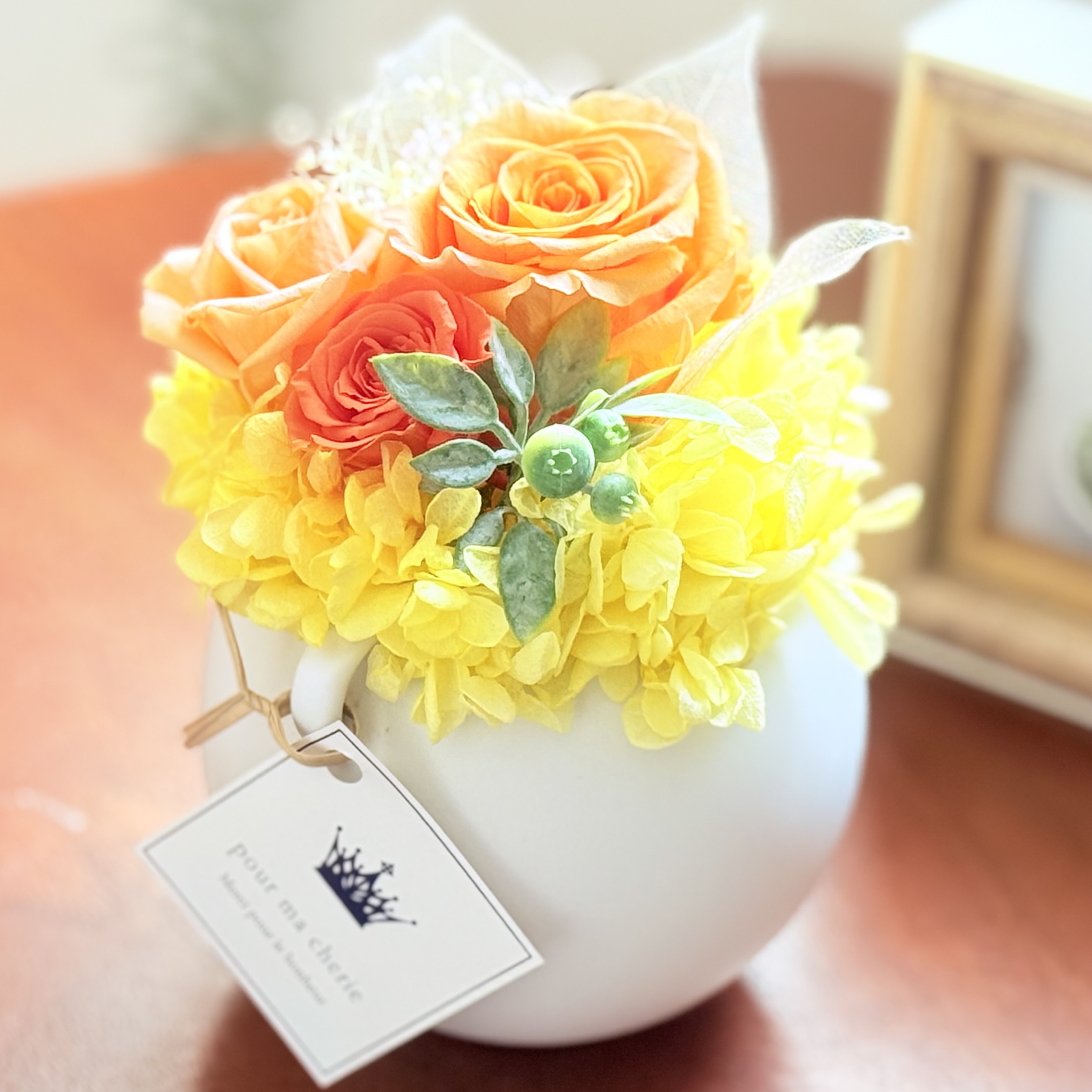 資材・ラッピング: 丸型ラウンド花器(ホワイト)、モニメントピック類、リボン、ドライフォーム、ギフト用クリアケース付き、フラワーケアカード(取扱説明書)