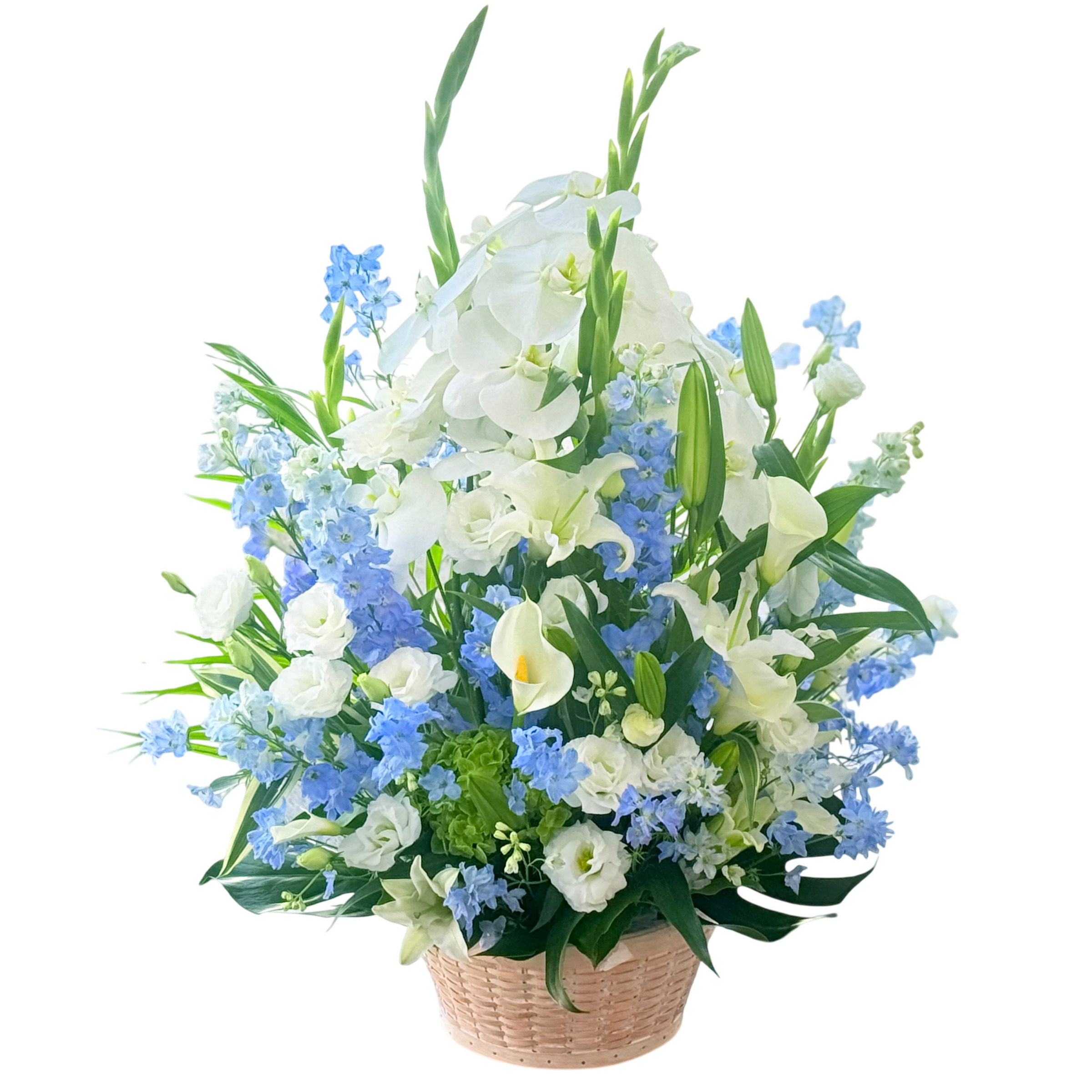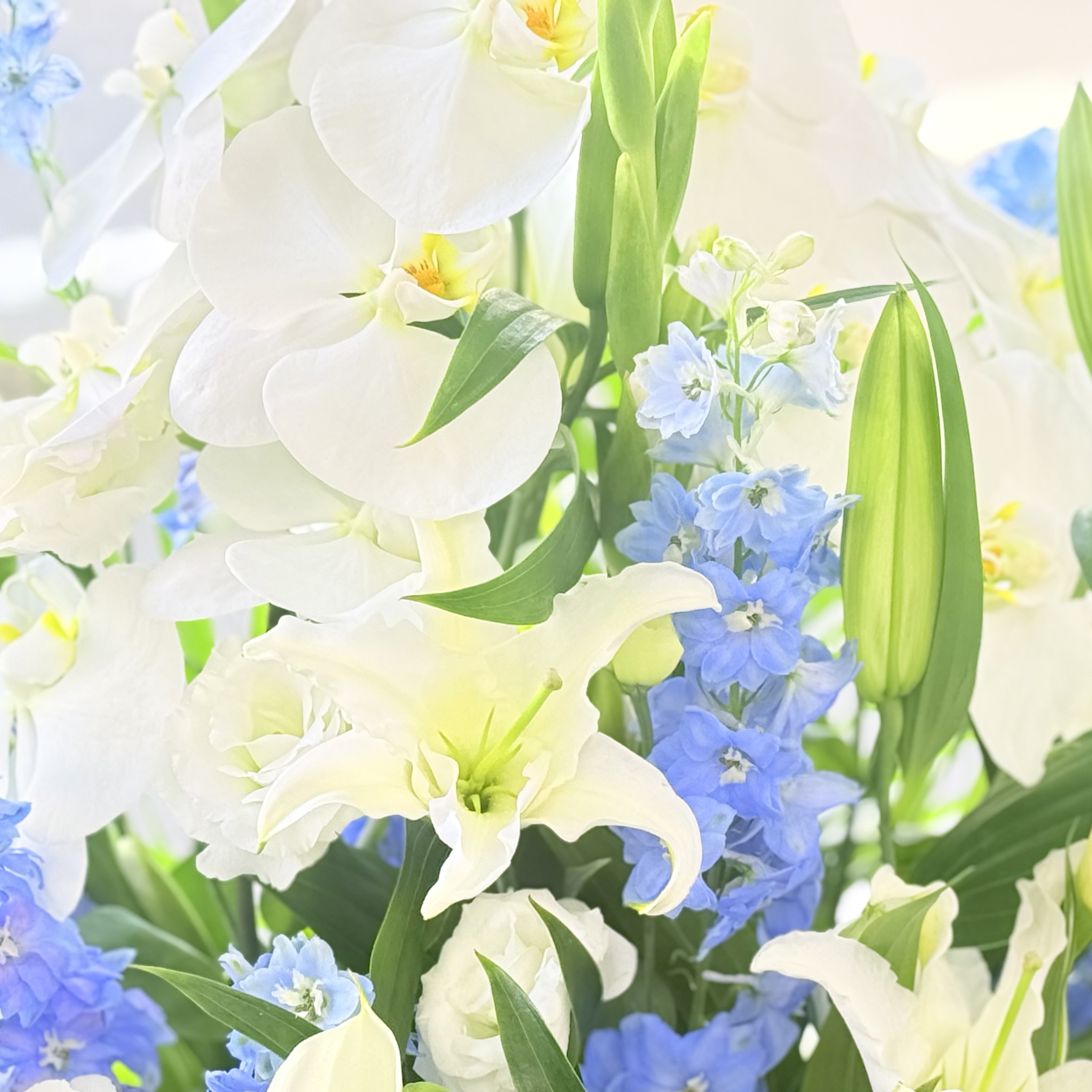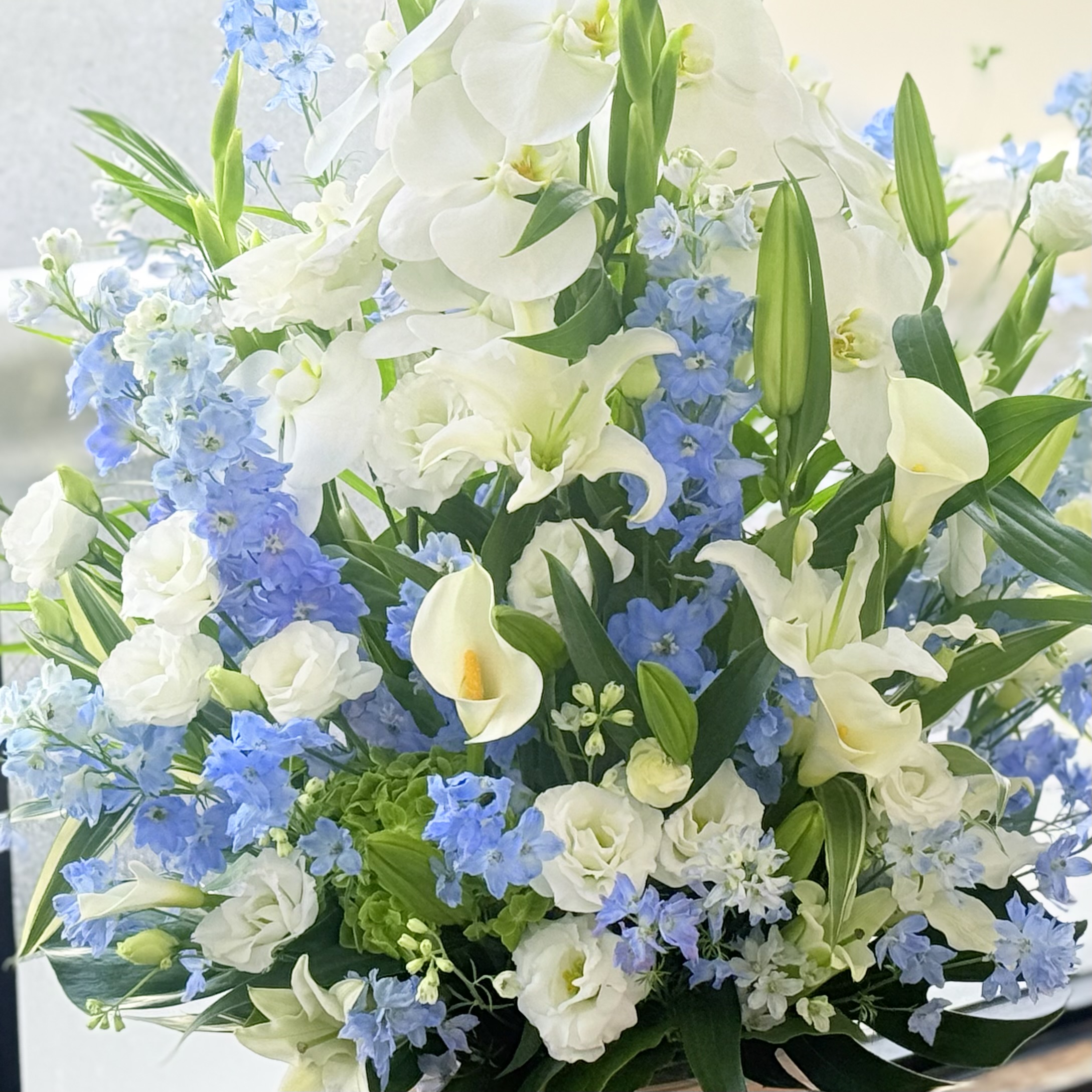 白とブルーを基調に、凛とした美しさを感じる上質なお供えアレンジです。清らかな白い花々に、静けさを添えるブルーのアクセントを加え、故人を偲ぶ気持ちを丁寧に表現しました。高さと広がりのあるデザインは祭壇やご自宅にも調和し、品格ある佇まいで空間を優しく包み込みます。大切な方への想いを形にする、特別なお供え花としておすすめの一品です。当店では、お客様のその想いをしっかりと受け止め、心を込めて制作致します。故人を偲ぶ色々なシーンで是非、ご利用下さい。