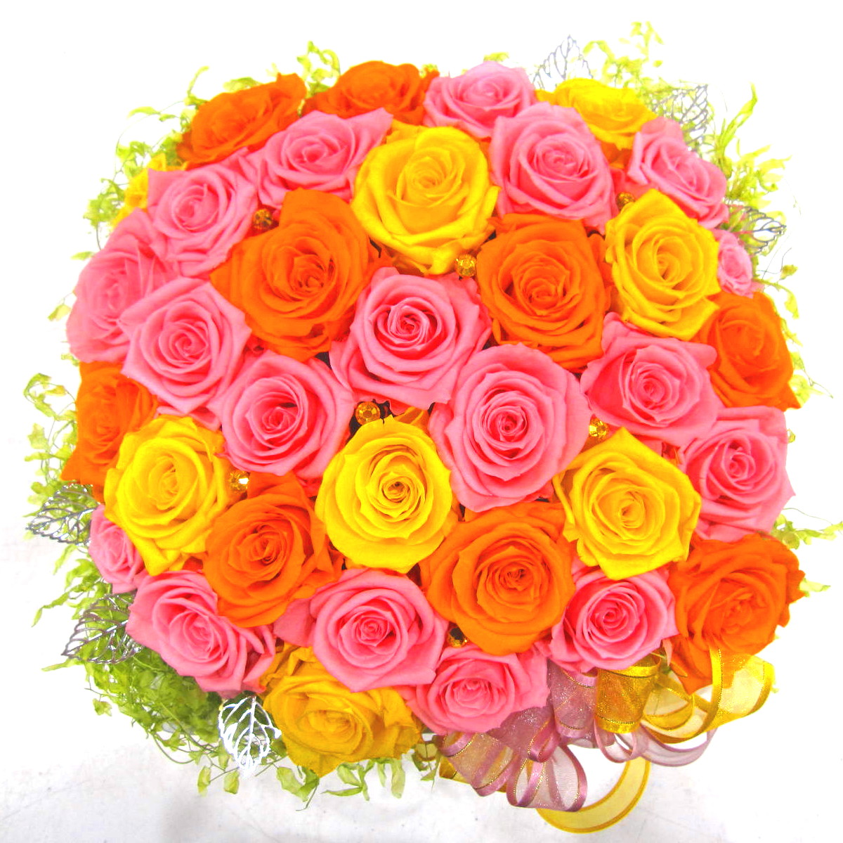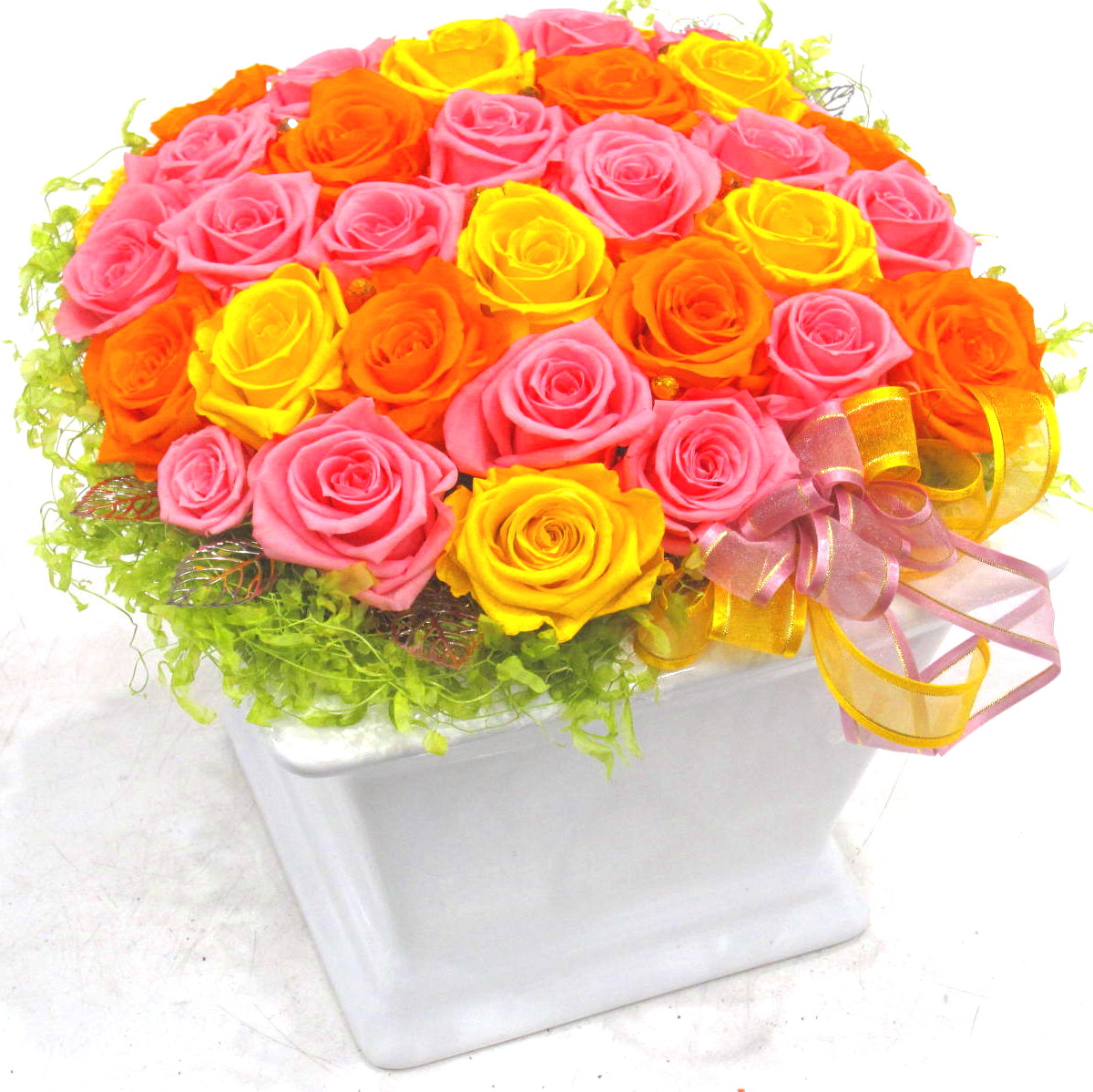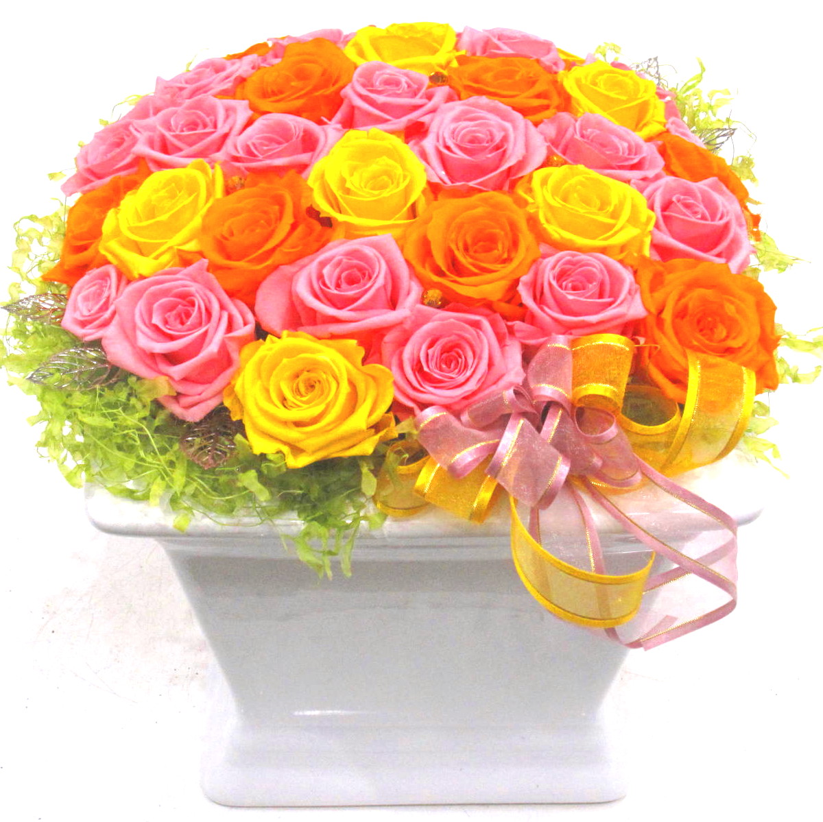 お花畑のようなバラだけの明るいプリザーブドフラワーです。