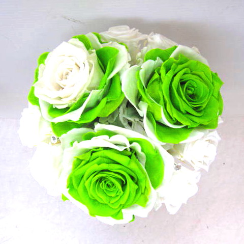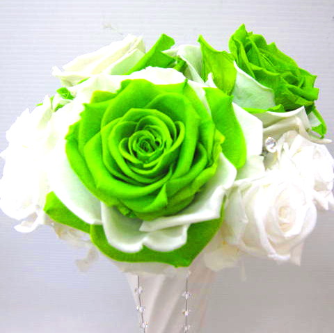 巨大輪のバラを縦長の素敵な花器に可愛らしくアレンジしました。淡いグリーンと白の優しい色合いでグリーンと白のバラの花弁を1枚1枚丁寧に貼り付けメリア状に仕立て巨大輪に、下には光り輝くクリスタルガーランドを垂れ下げより一層の高級感溢れるアレンジにしました。どこから見ても綺麗に見えます。お誕生日、開店・開業祝い、展示会などさまざまな贈り物にオススメです。当店ではお客様の想いを大切に【こころを込めて】お作りいたします。静岡県長泉町から手渡しお届けまたは、宅急便で全国にお届けします。是非、さまざまな贈り物に。