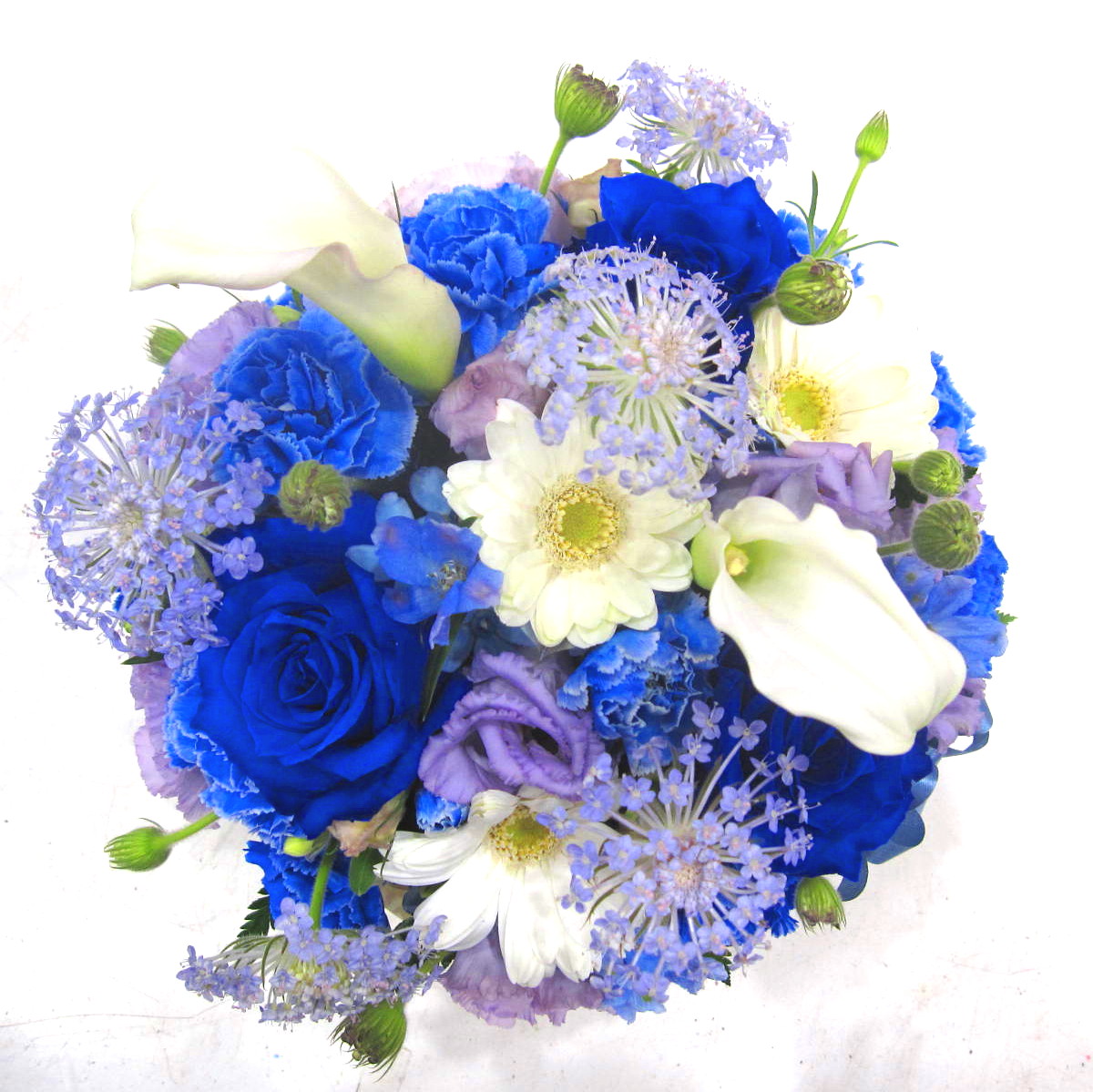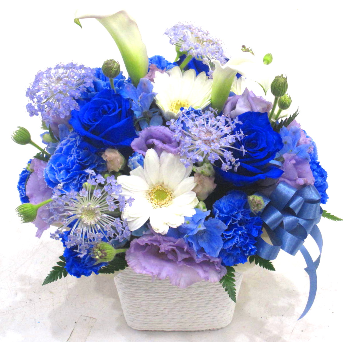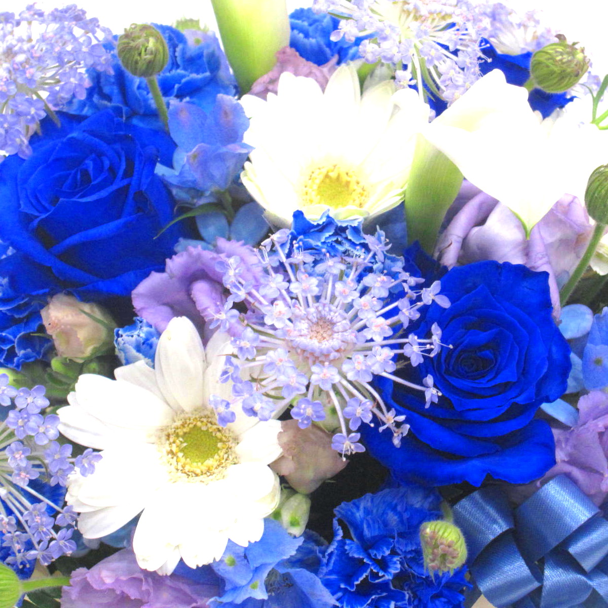 花材: メイン 【オリジナル染色】青いバラ、ガーベラ、トルコギキョウなど その他 葉物類など