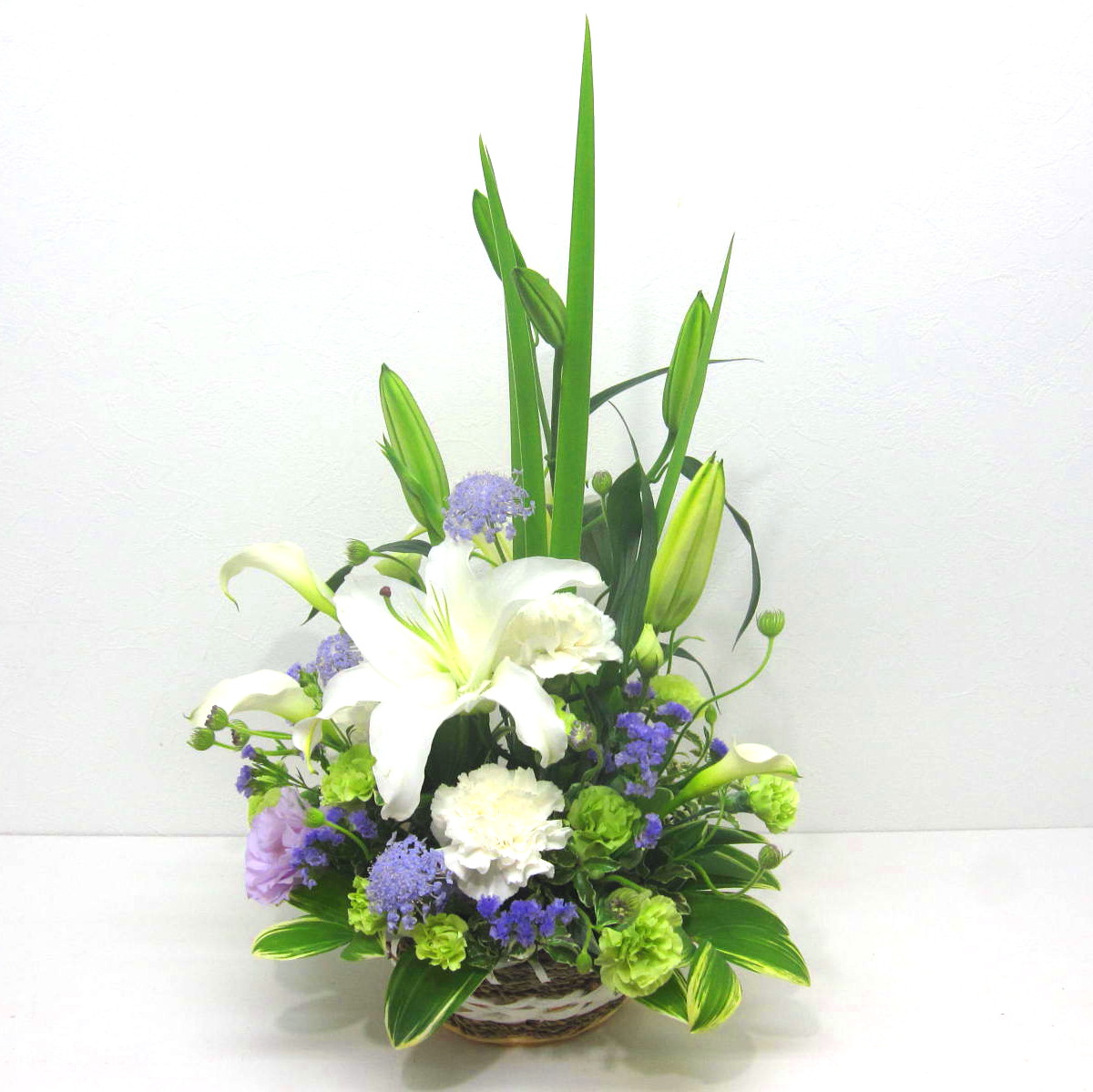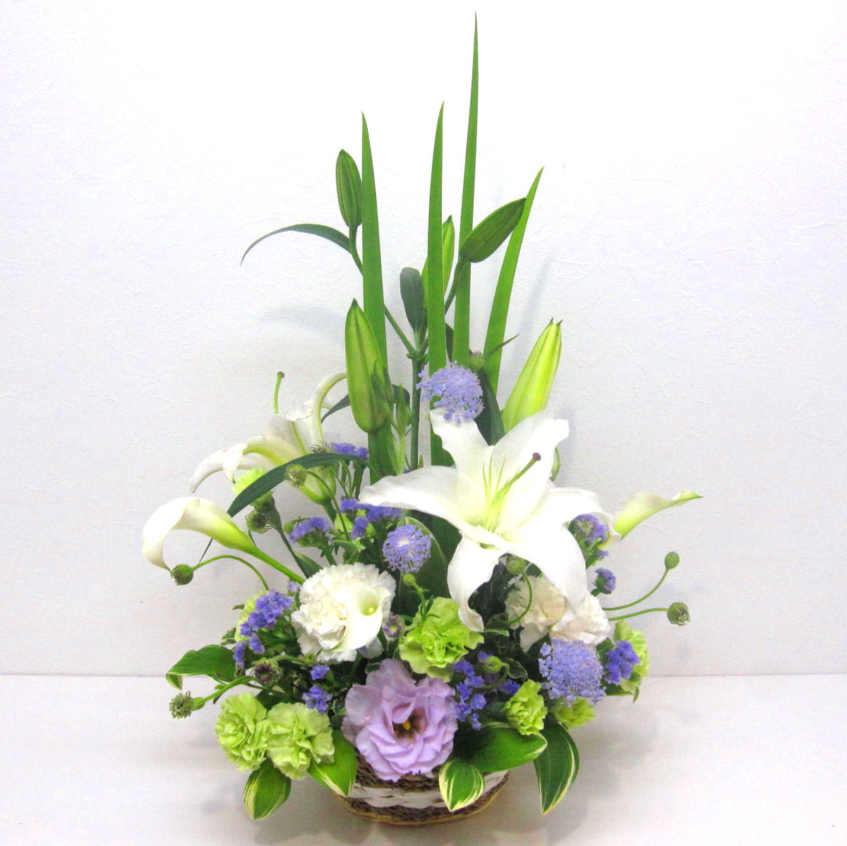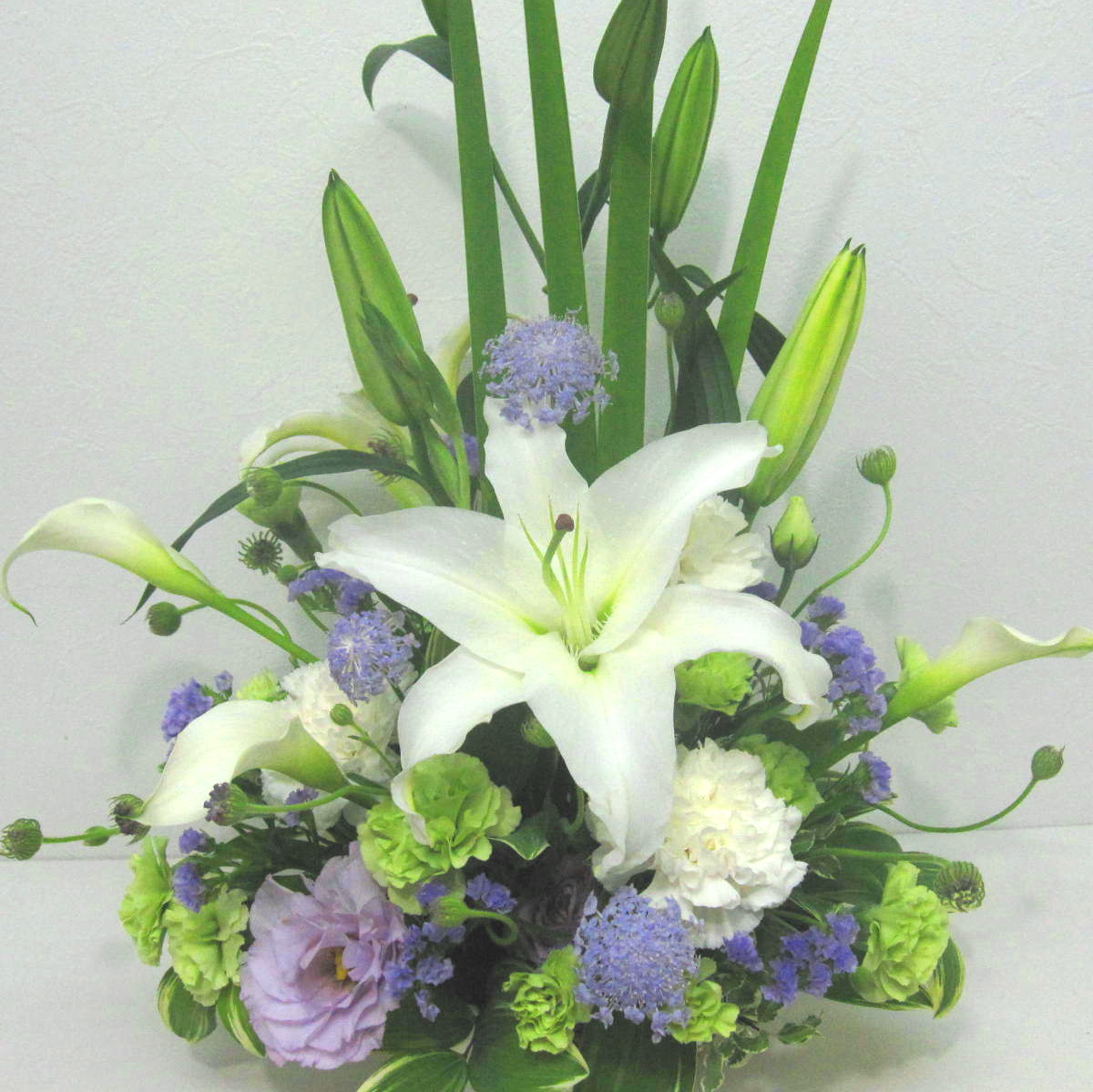 あの人を偲んで…。白上がりで淡い紫を入れた御供え用アレンジです。ユリを入れて洋花で上品にお作りします。当店ではお客様の想い大切に【こころを込めて】お作りいたします。静岡県長泉町から手渡しお届けまたは宅急便で全国にお届けします。故人を偲ぶさまざまなシーンでお使い頂けます。