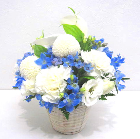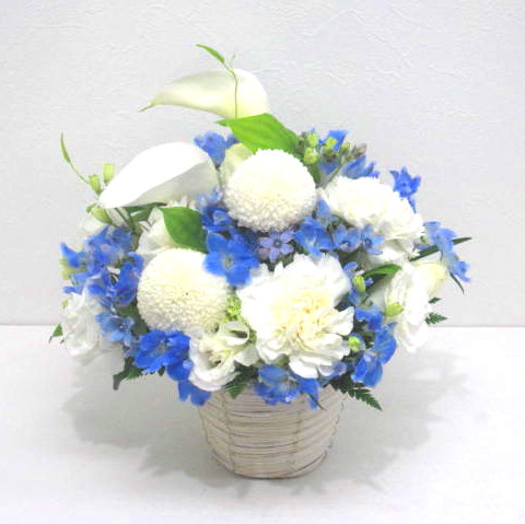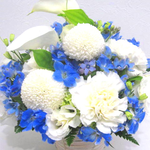 あの人を偲んで…。白&ブルー系で爽やかな御供え用アレンジです。上品にお作りします。当店ではお客様の想い大切に【こころを込めて】お作りいたします。静岡県長泉町から手渡しお届けまたは宅急便で全国にお届けします。故人を偲ぶさまざまなシーンでお使い頂けます。