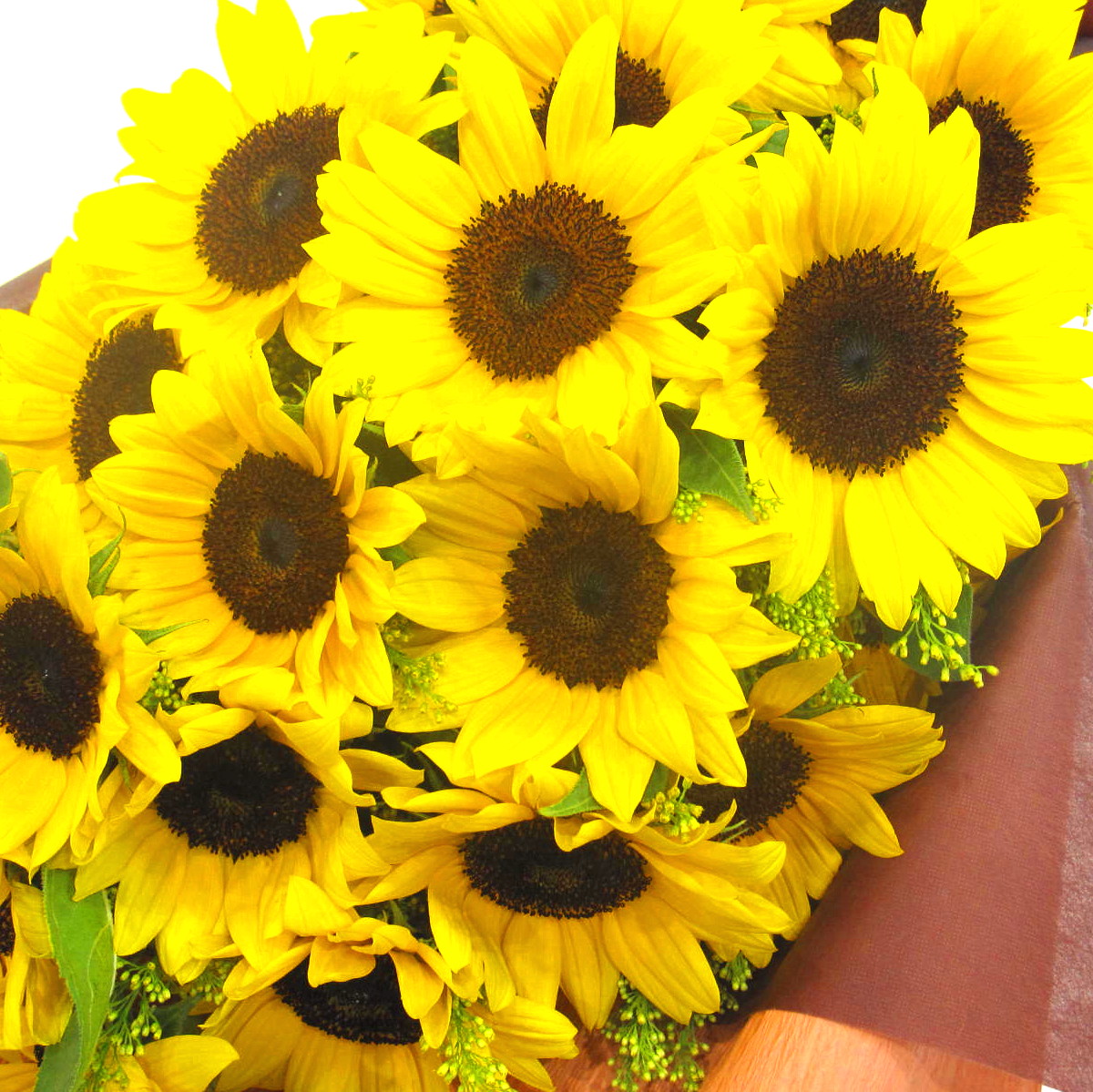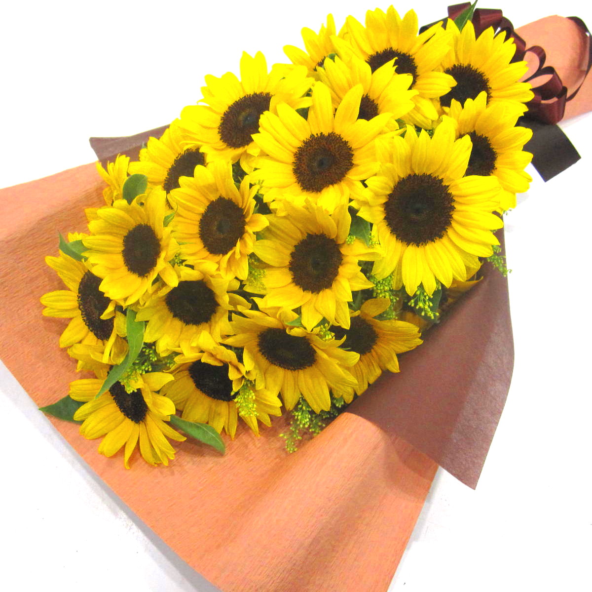 私達花のプロが販売する厳しい基準をクリアした国産ヒマワリを使用した花束になります。茎も太く、花も大きいです。もちろん花持ちにも自信があります。ラッピングは落ち着いた雰囲気をイメージし、ベージュ、アクセントに茶色を入れてモダンな感じです。ご購入されたお客様から高い評価を頂いております。静岡県長泉町から日本全国【真心】込めてお届けいたします。さまざまなご用途に贈る贈り物としてオススメです。大切な方へ贈るフラワーギフトやプレゼントなら「花樹園オンラインドットコム」に是非、お任せ下さいませ。