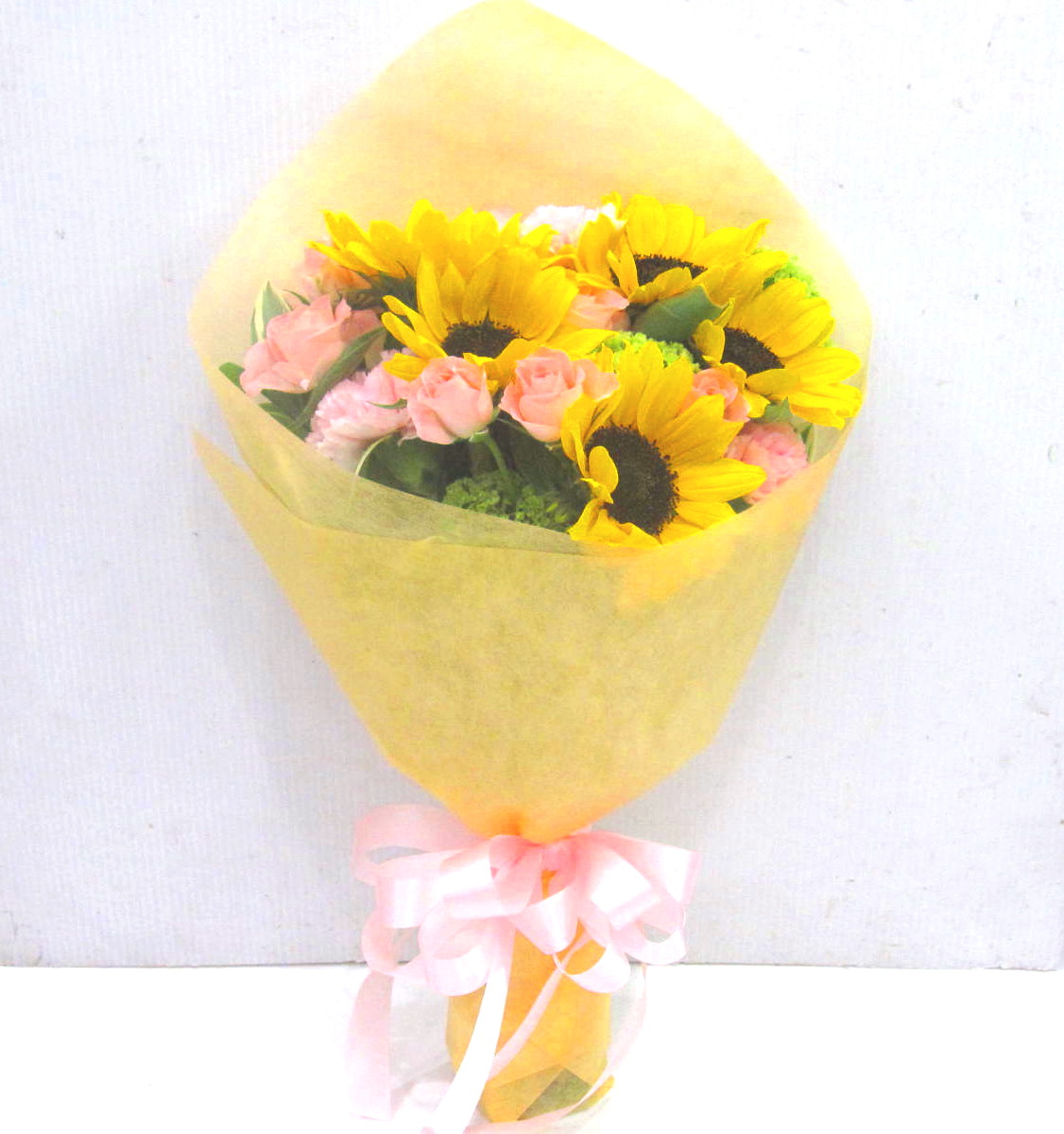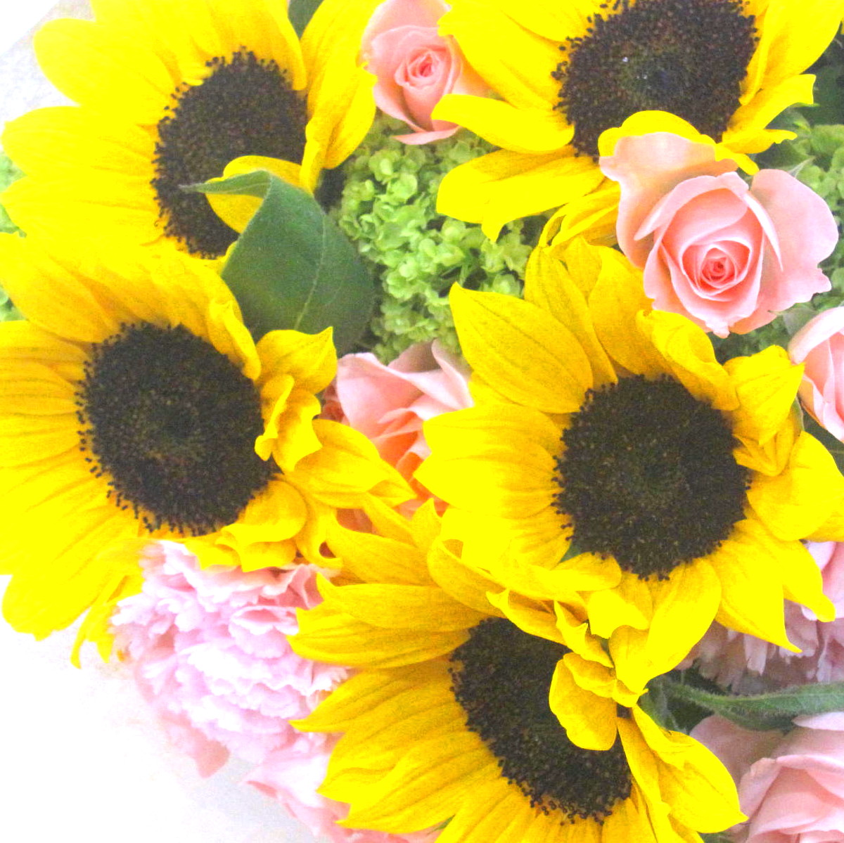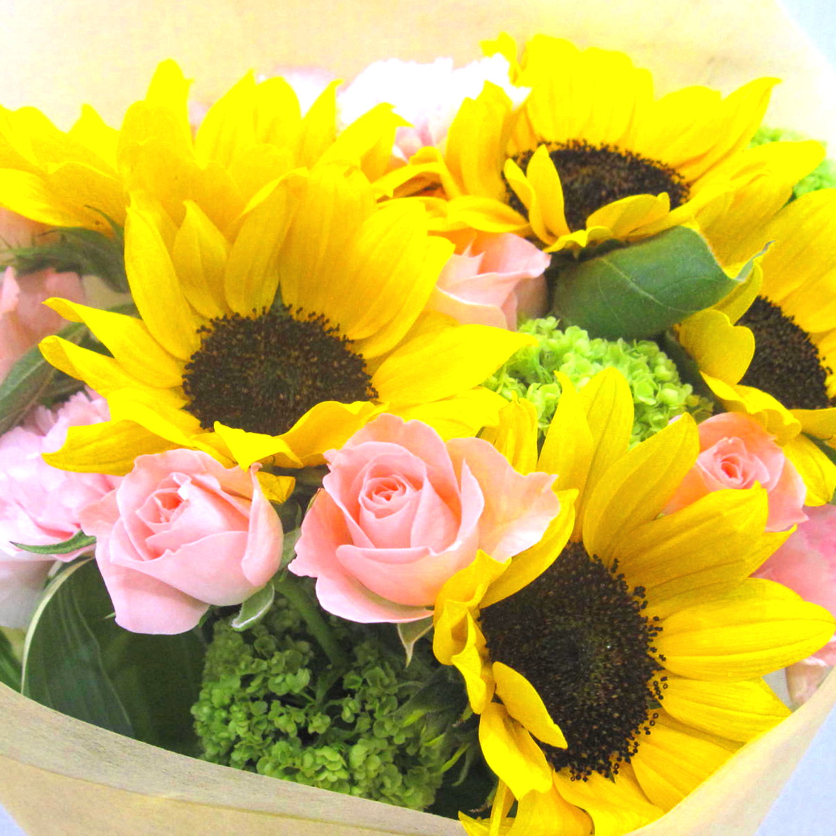 ギフトに、プレゼントにピッタリなヒマワリを入れた花束。【15時迄のご注文で翌日届きます】※こちらの商品についてのご相談、ご質問等ございましたら(メール)または(お電話)にて承ります。