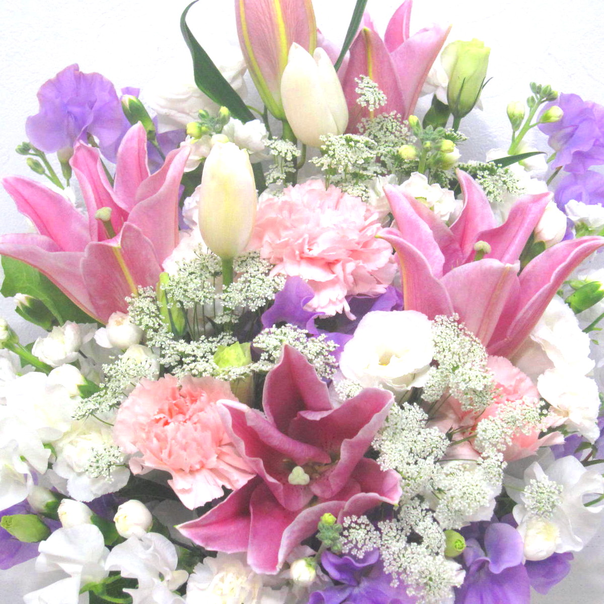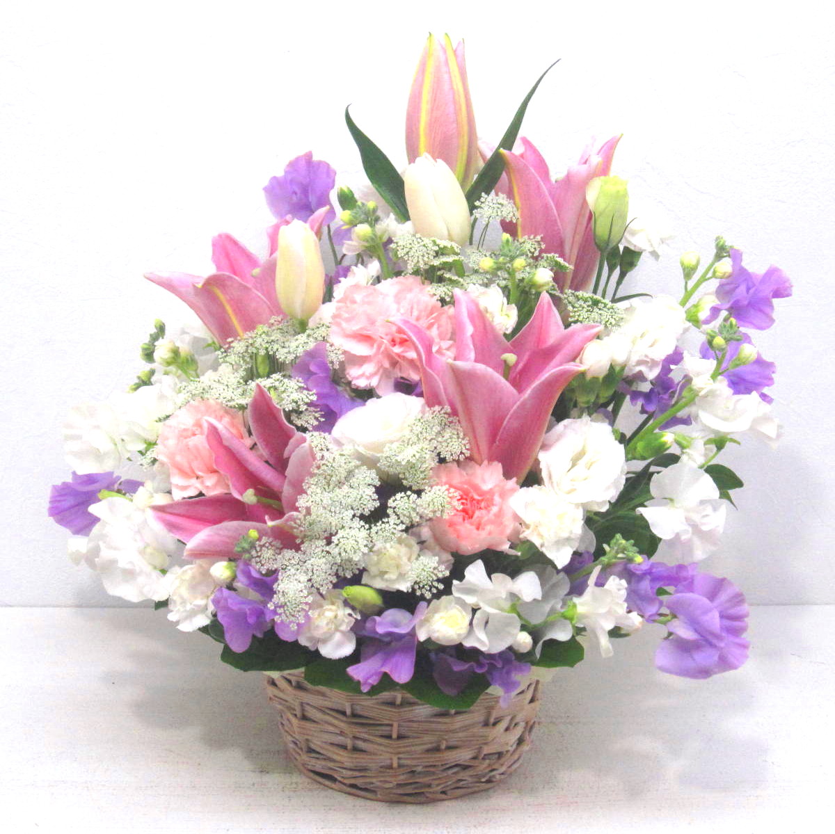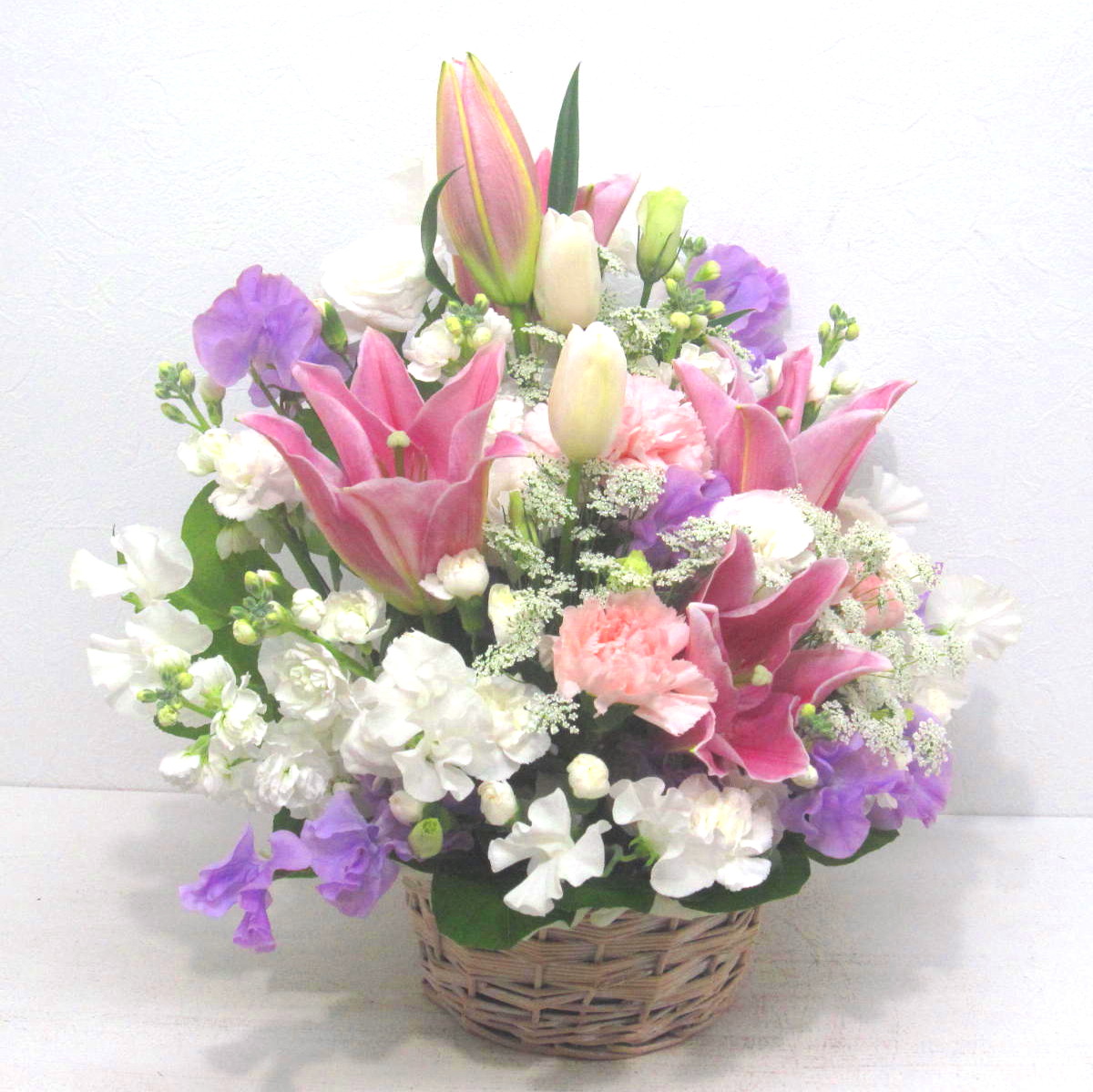 花材: メイン ユリ、カーネーション、トルコギキョウ、スイートピー、チューリップなど その他 葉物類など