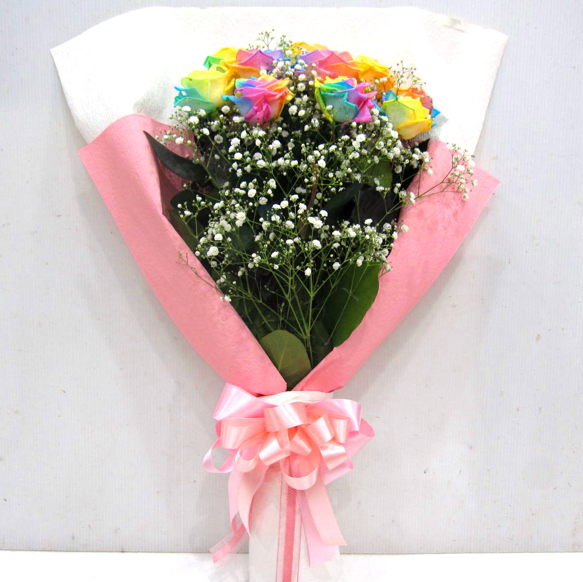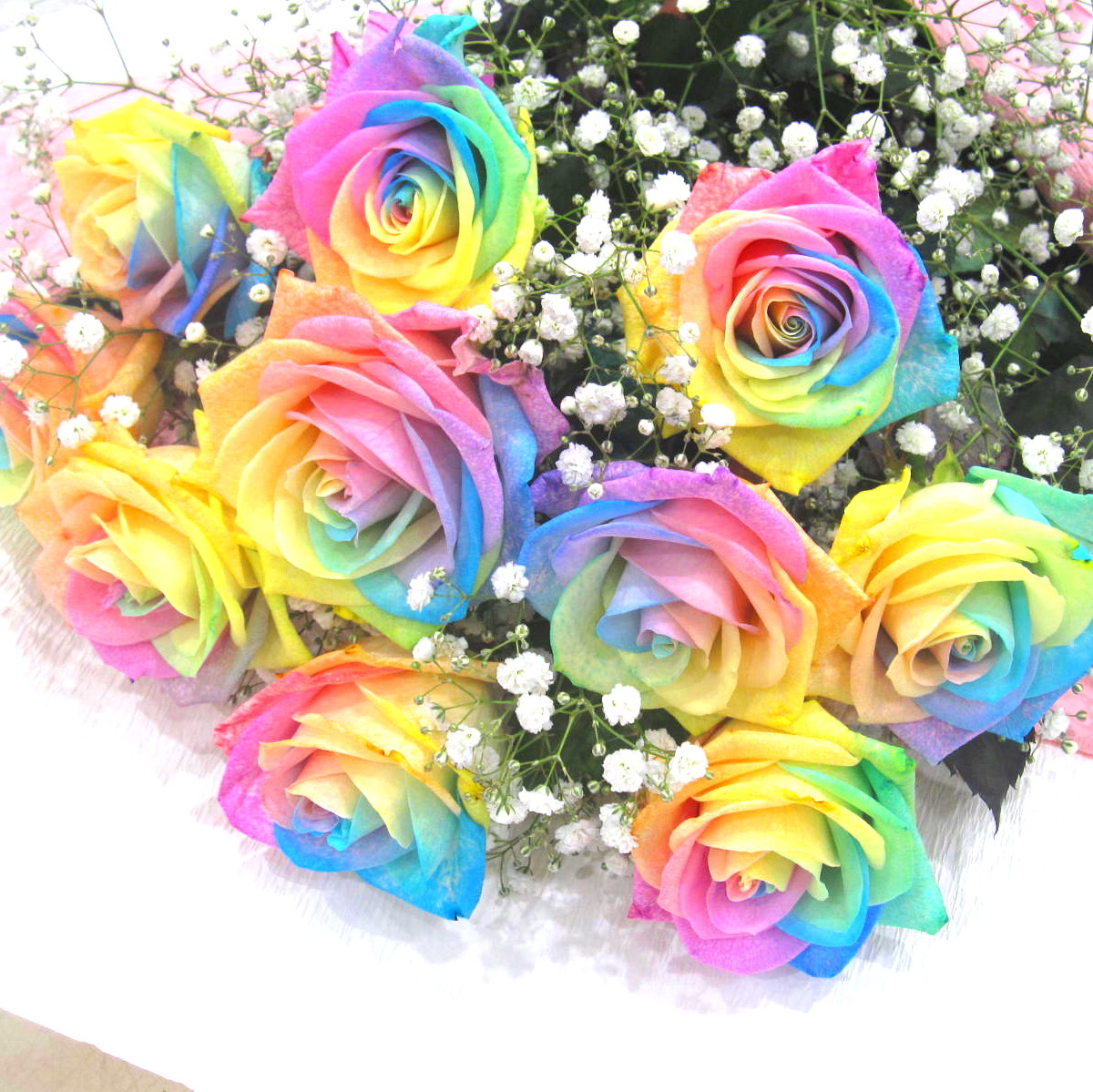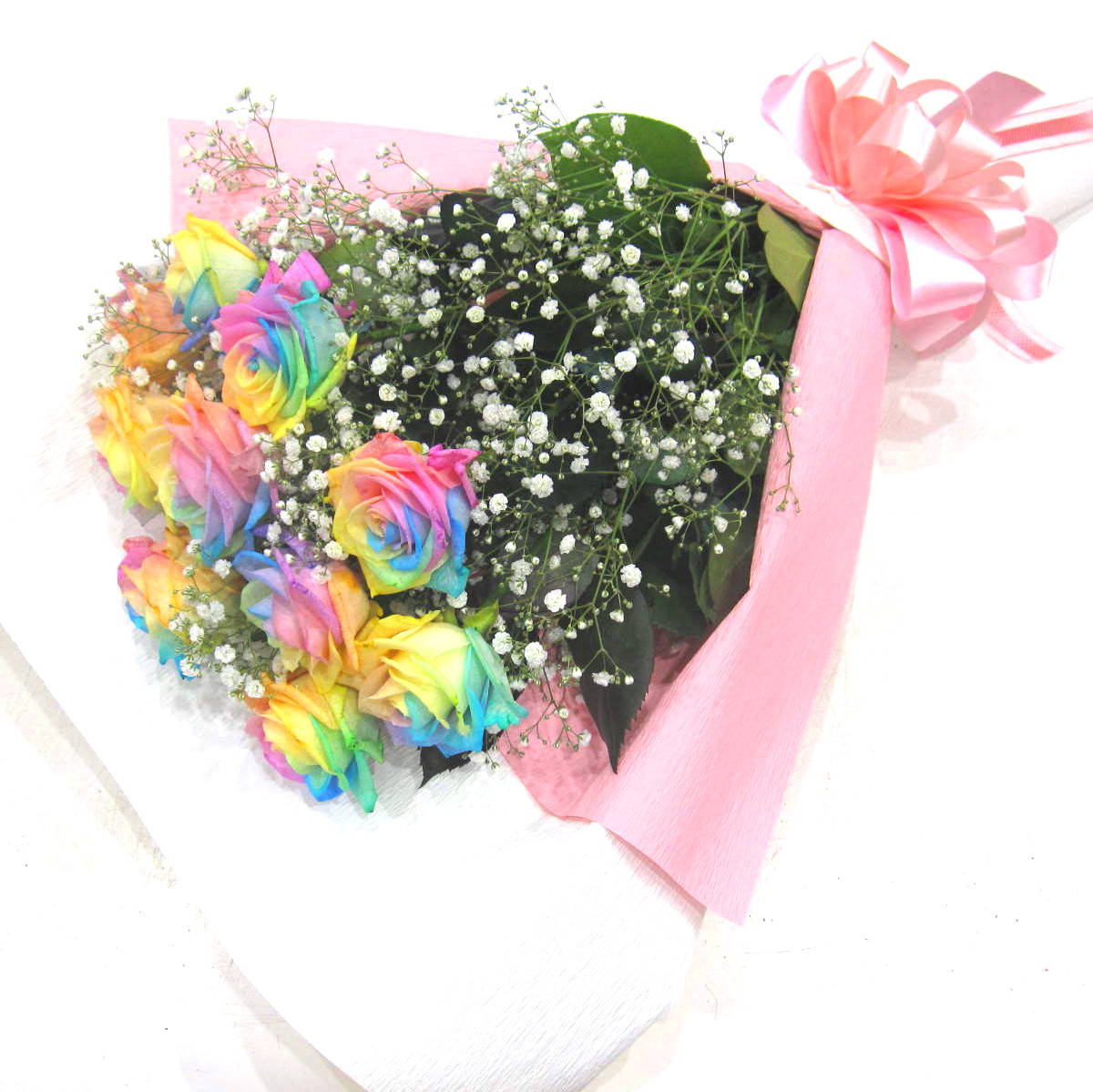 淡い7色の希少なバラ【パステルレインボーローズ】を10本とかすみ草を入れた花束です。この花束を贈ればきっと喜ばれるはずです。ラッピングもこだわっており上品にお包みします。レインボーローズの花言葉は「奇跡」あなたと出会えたこと、そして、今このバラと出会えたことも「奇跡」なのかも知れません。言葉では照れくさい想いをきっと届けてくれる花束です。当店ではお客様の想い大切に【こころを込めて】お作りいたします。静岡県長泉町から手渡しお届けまたは、宅急便で全国にお届けします。是非、さまざまな贈り物に。