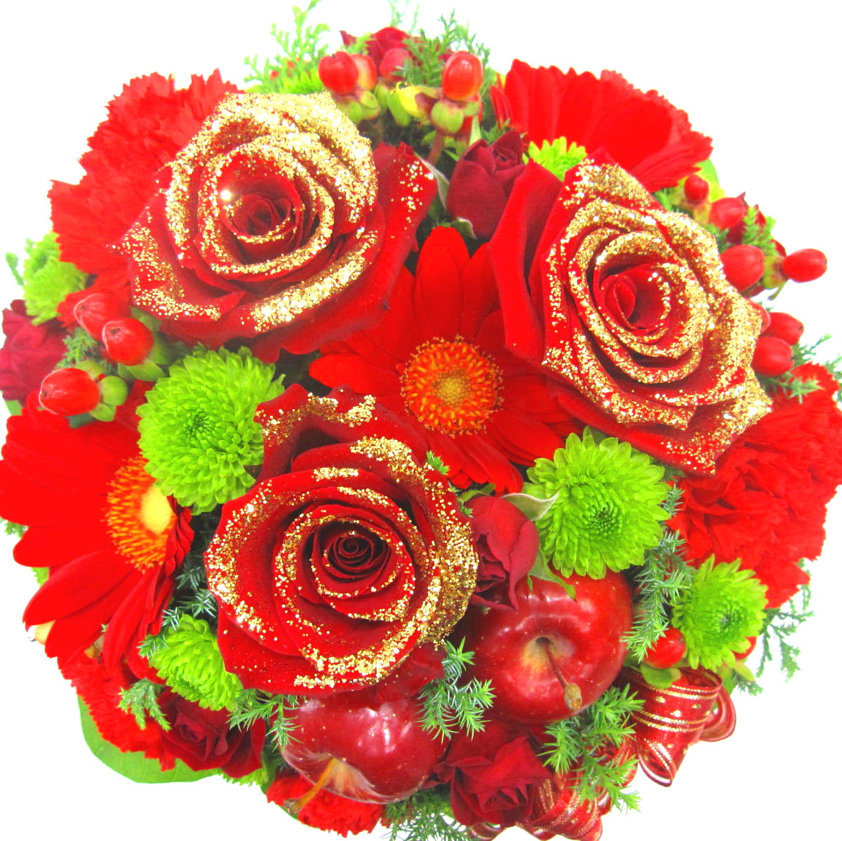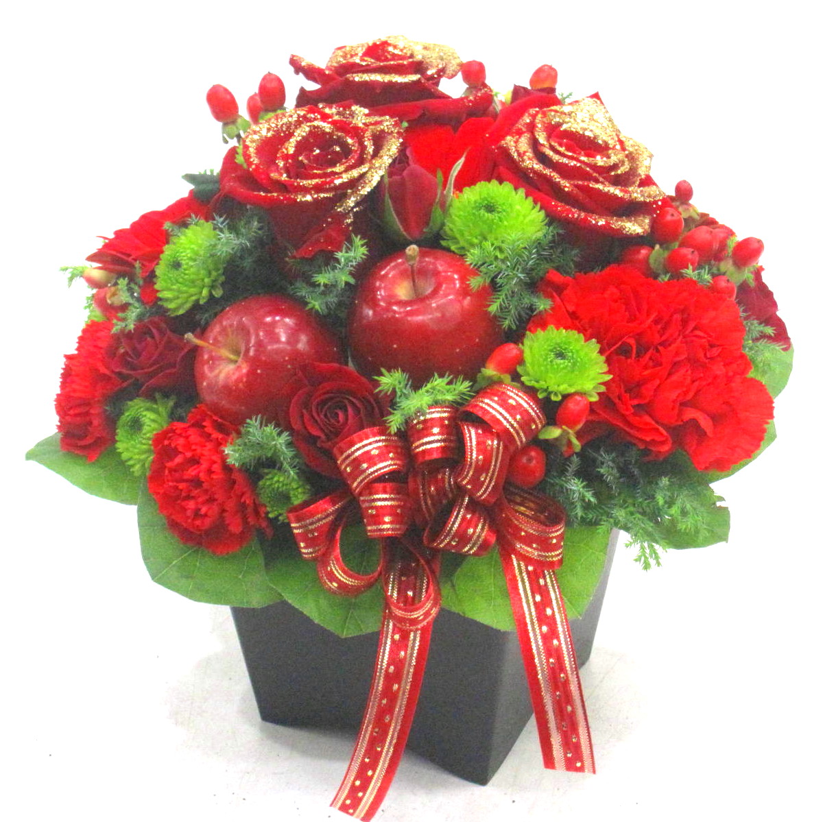 赤いバラに【オリジナルゴールドラメ】を付けたレッド系アレンジメント。【15時迄のご注文で翌日届きます】※こちらの商品についてのご相談、ご質問等ございましたら(メール)または(お電話)にて承ります。