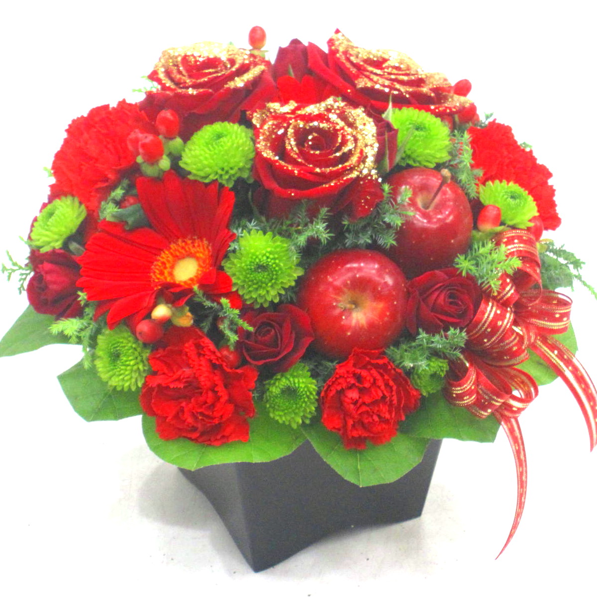 花材: メイン 赤いバラ(ゴールドラメ)、ガーベラ、カーネーションなど その他 実物類、葉物類など