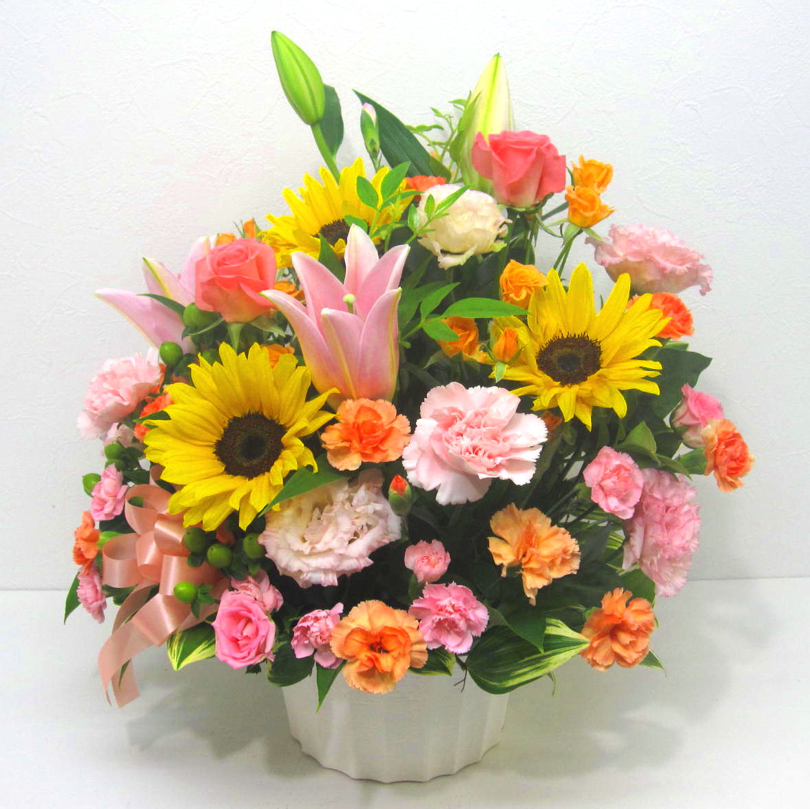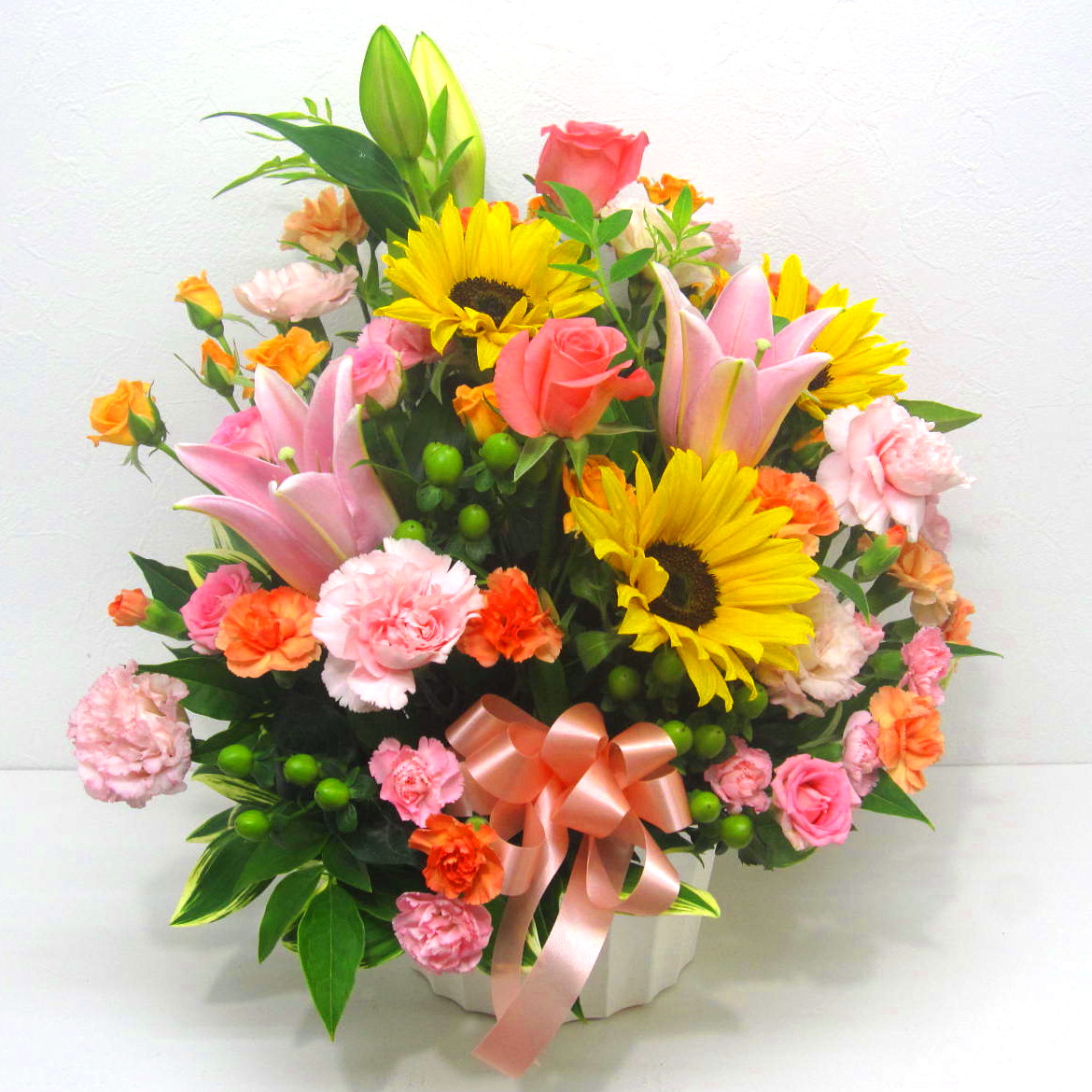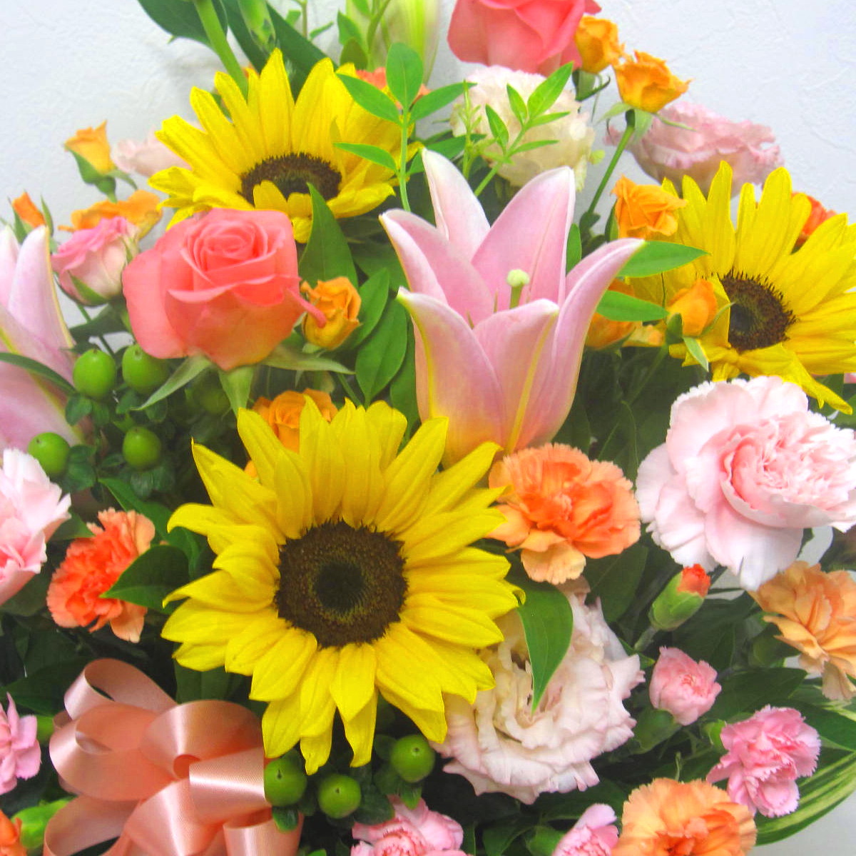 花材: メイン ひまわり、ユリ、バラ、ミニカーネーションなど その他 葉物類など