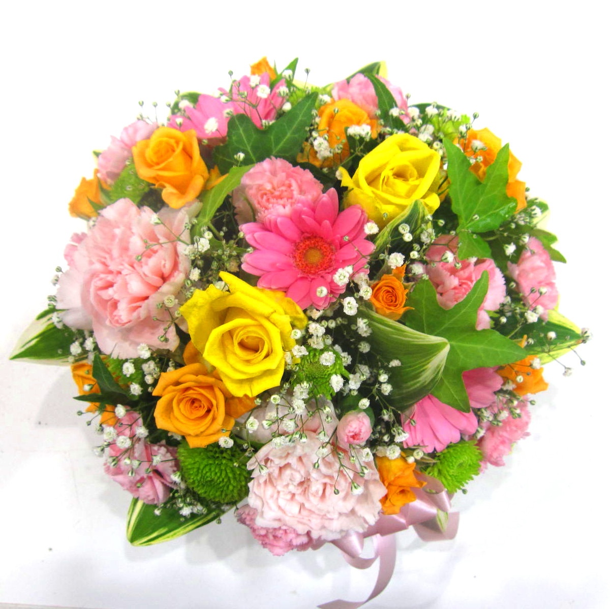 花材: メイン バラ、ガーベラ、ミニカーネーションなど その他 かすみ草、葉物類など