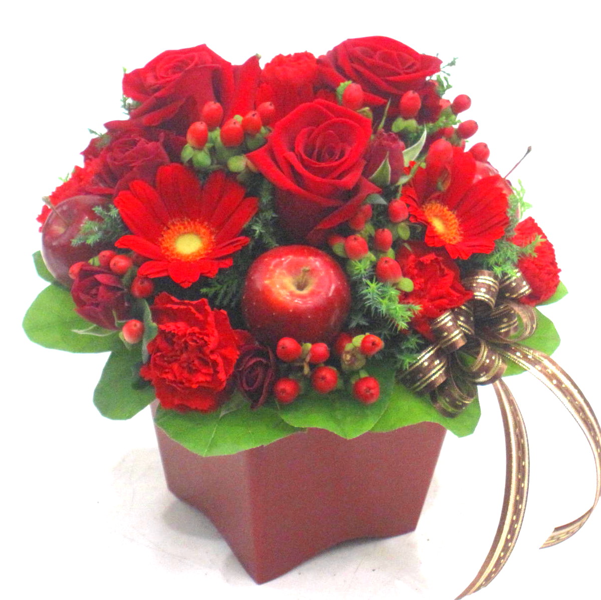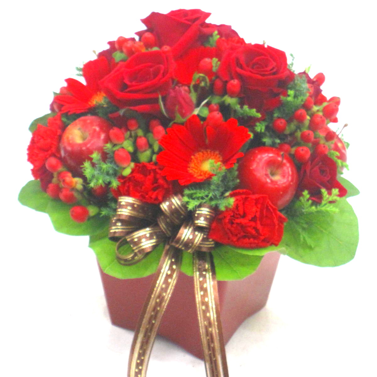 赤系のお花中心のアレンジメントです。赤いバラを入れてオールラウンドで製作。どこからみても綺麗に見えます。きっととびっきりに喜んでいたただけると思います。当店ではお客様の想いを大切に【こころを込めて】お作りいたします。静岡県長泉町から手渡しお届けまたは宅急便で全国にお届けします。是非、さまざまな贈り物に。