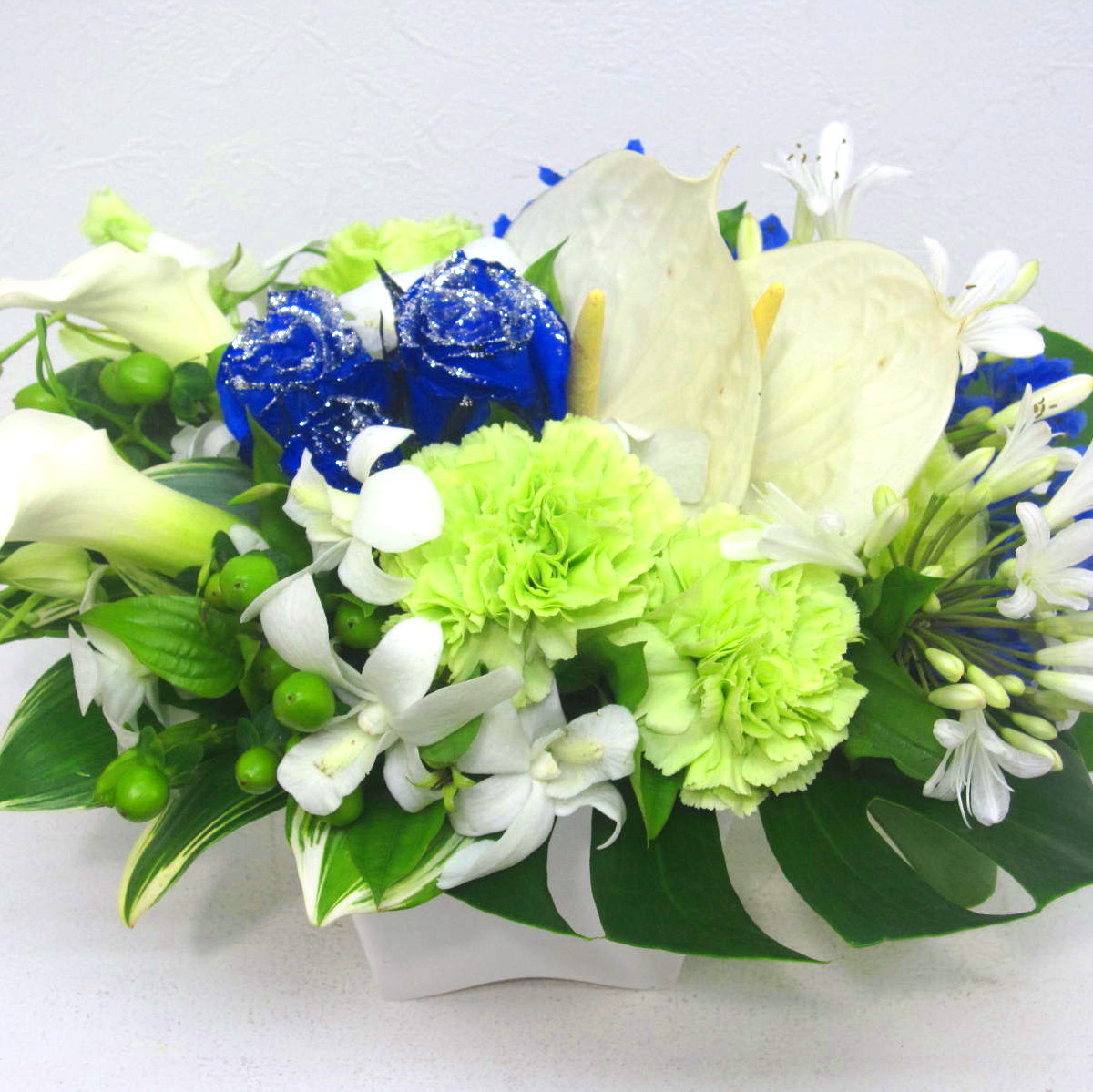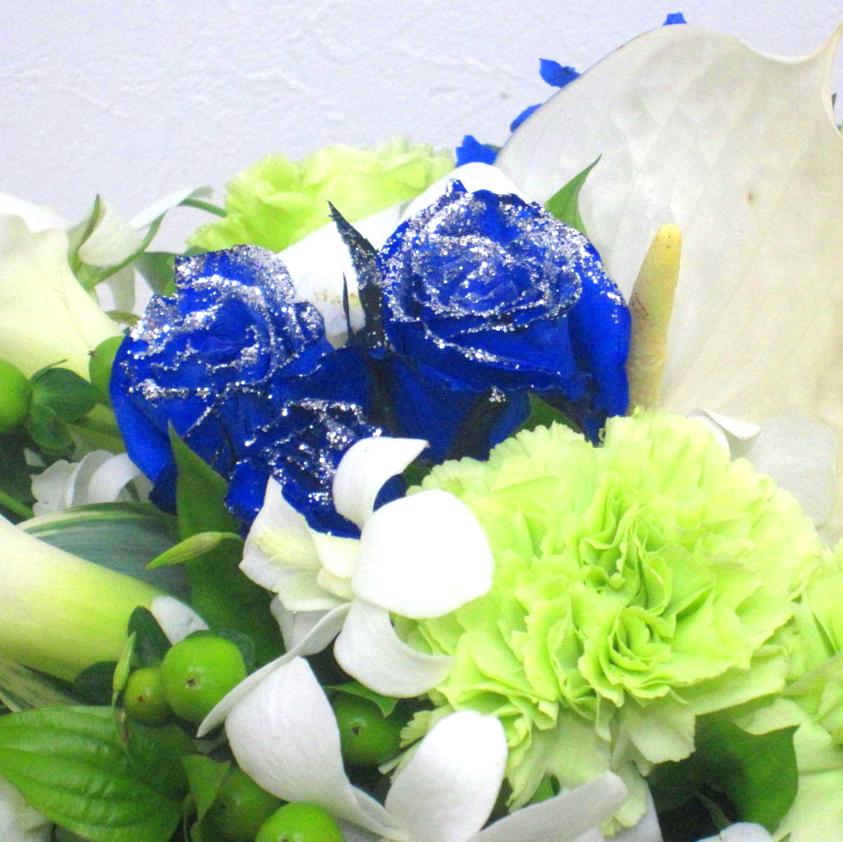 花材: メイン 【オリジナル染色】ラメ入り青いバラ、カラー、カーネーション、季節の小花など その他 実物類、葉物類など