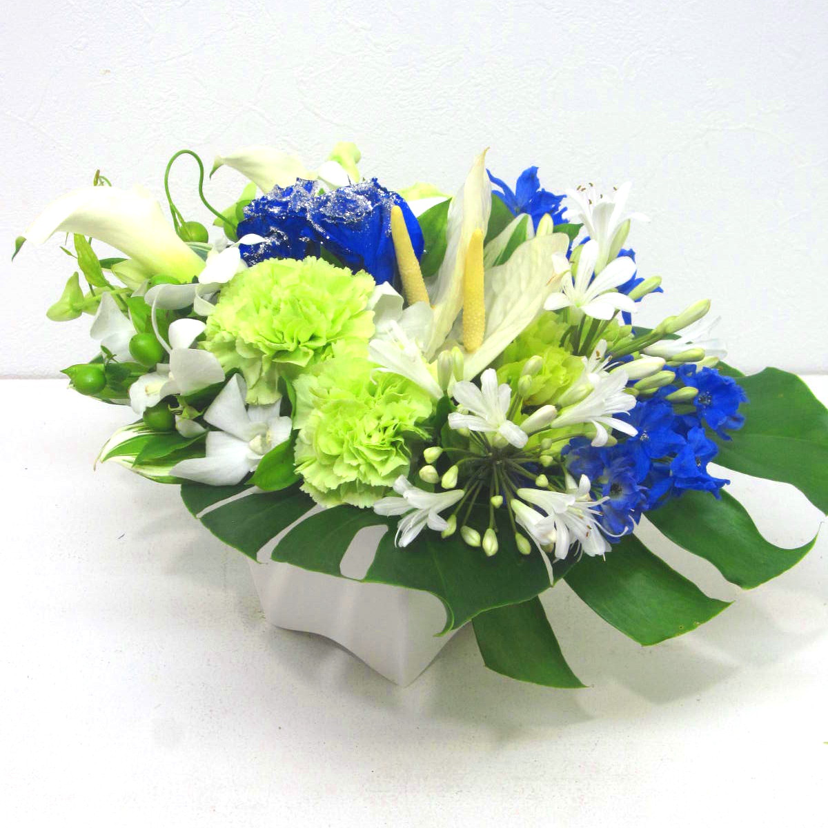 お洒落で個性的な雰囲気のアレンジメントです。オリジナル染色シルバーラメ入りの青いバラをアクセントに上品に少し横広がりのオールラウンドで制作。どこから見ても綺麗に見えます。いつもとは違うプレゼントにおすすめです。きっととびっきりに喜んでいたただけると思います。当店ではお客様の想い大切に【こころを込めて】お作りいたします。静岡県長泉町から手渡しお届けまたは宅急便で全国にお届けします。是非、さまざまな贈り物に。