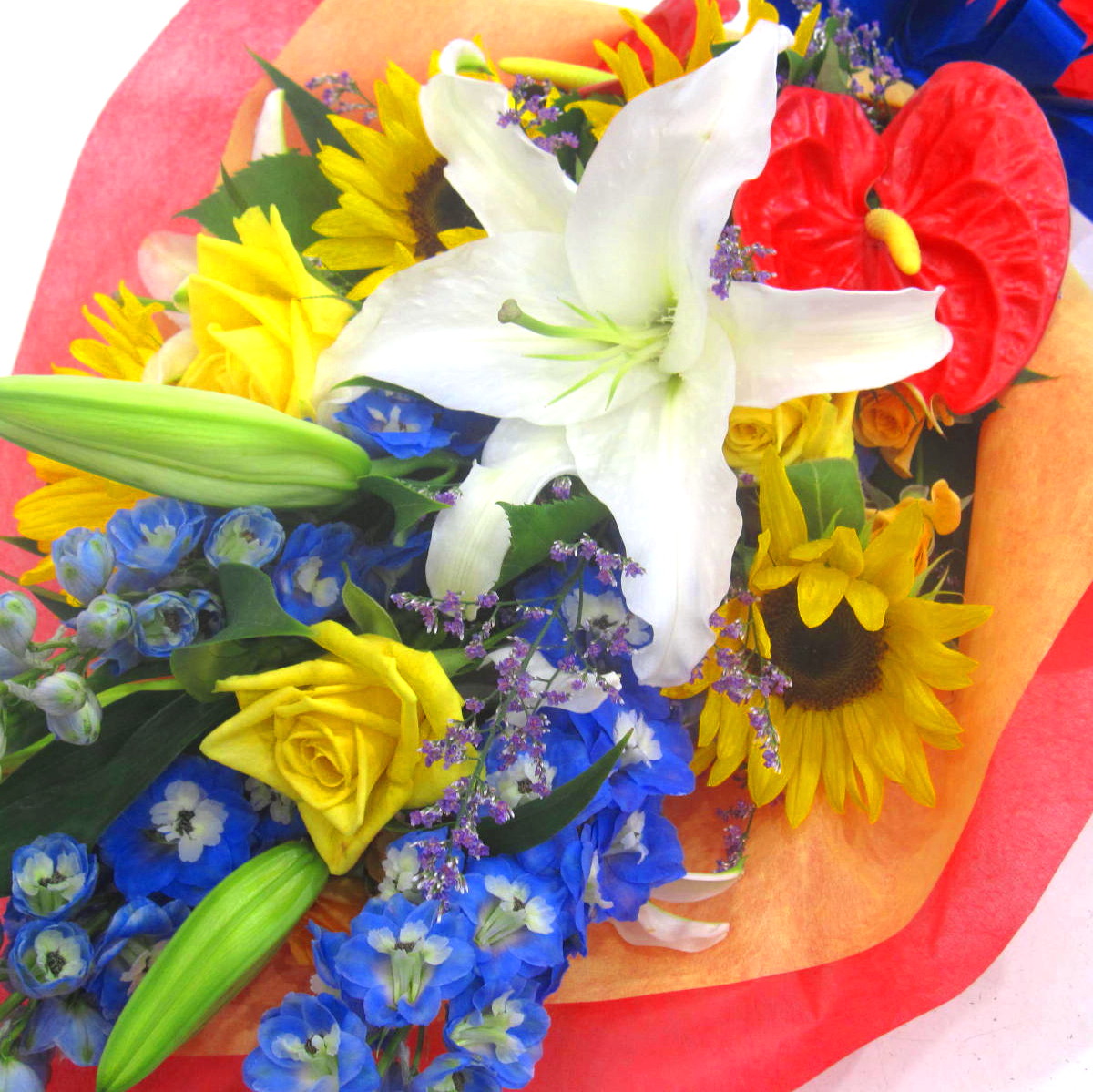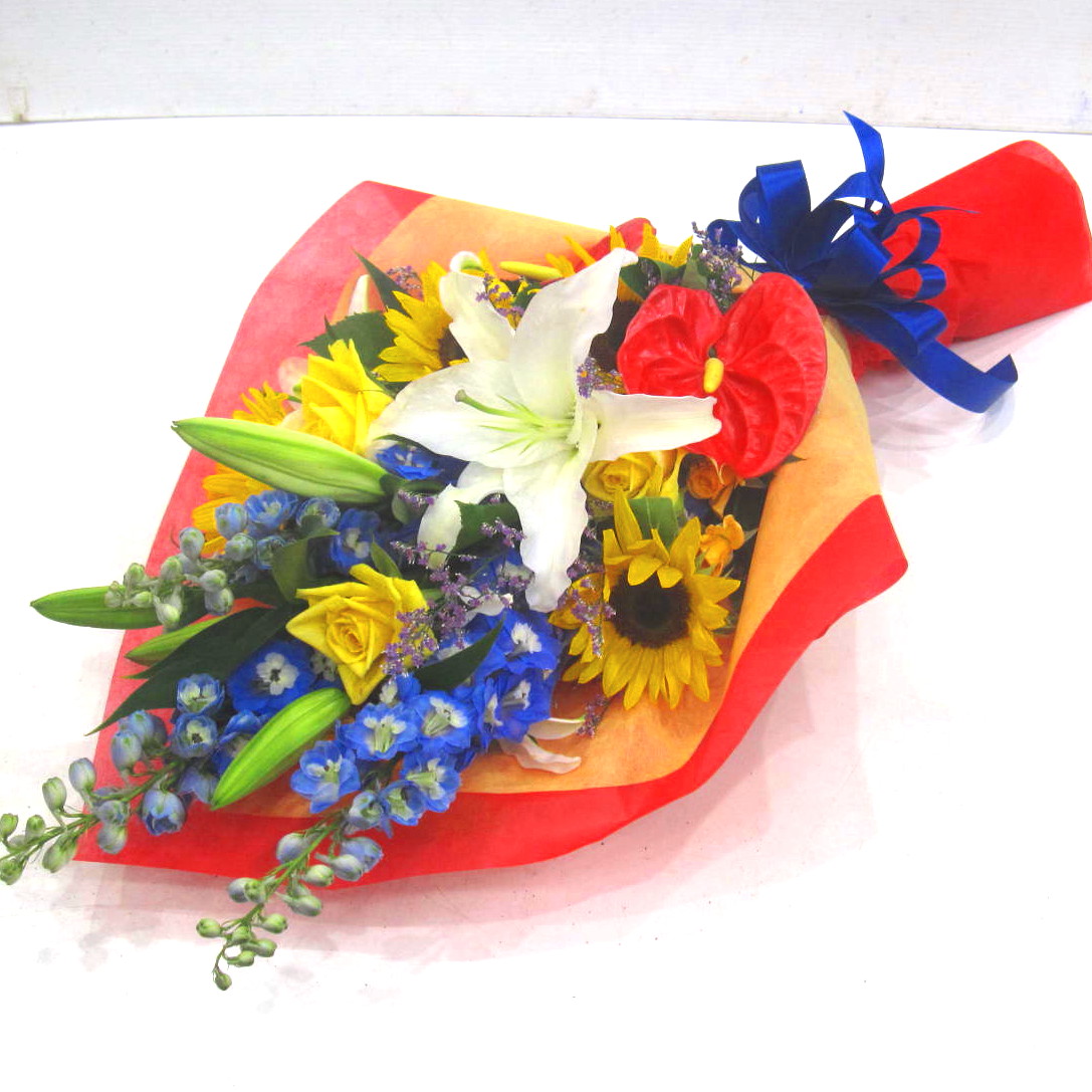 ユリとひまわりの存在感が季節を感じますよ。【15時迄のご注文で翌日届きます】※こちらの商品についてのご相談、ご質問等ございましたら(メール)または(お電話)にて承ります。
