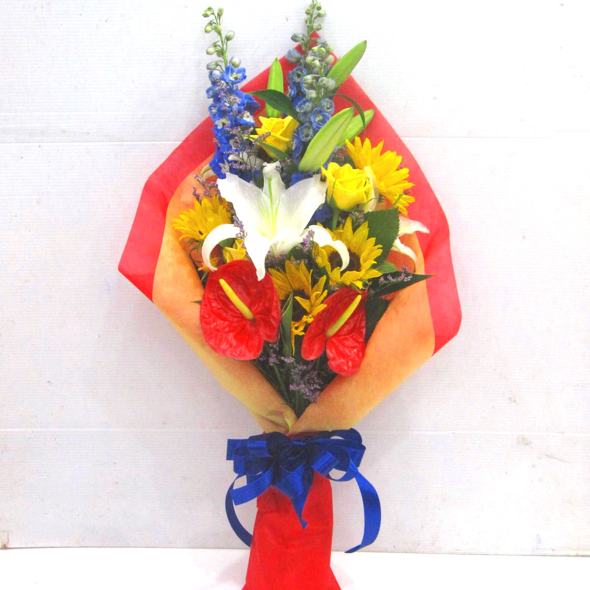 花材: メイン ユリ、バラ、ひまわり、アンスリュームなど その他 葉物類など