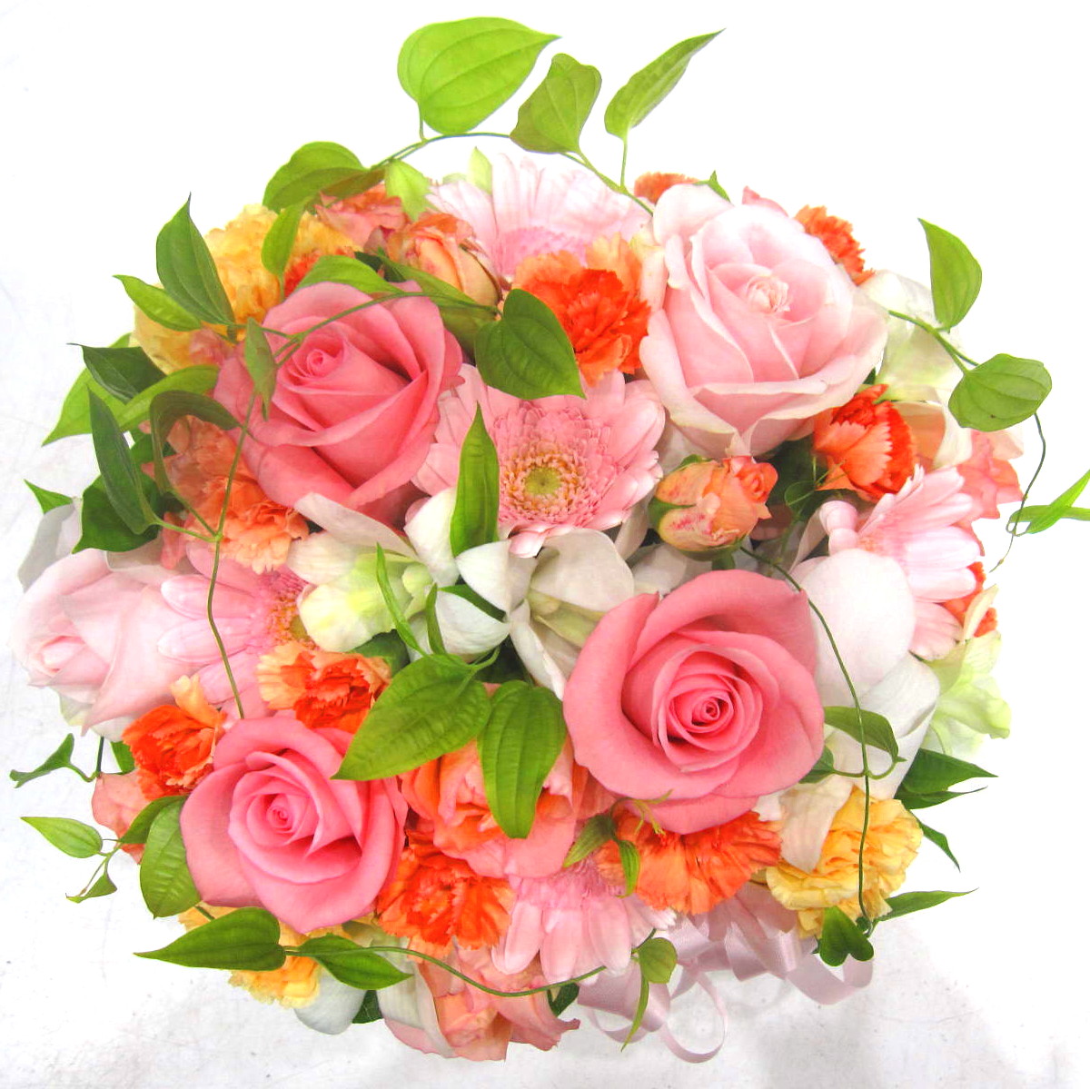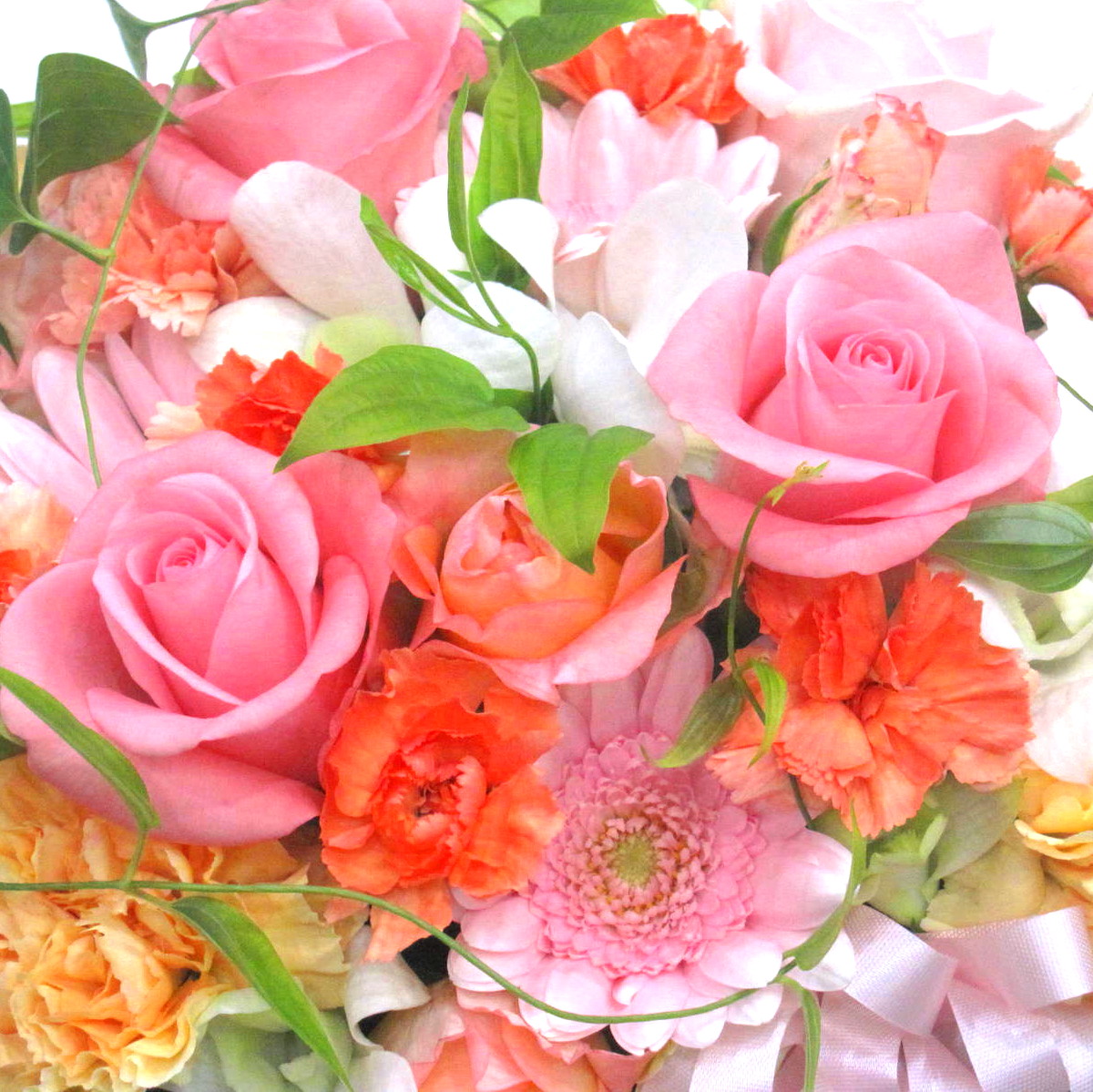 色とりどりのお花が入ったピーチ系アレンジメント。【15時迄のご注文で翌日届きます】※こちらの商品についてのご相談、ご質問等ございましたら(メール)または(お電話)にて承ります。