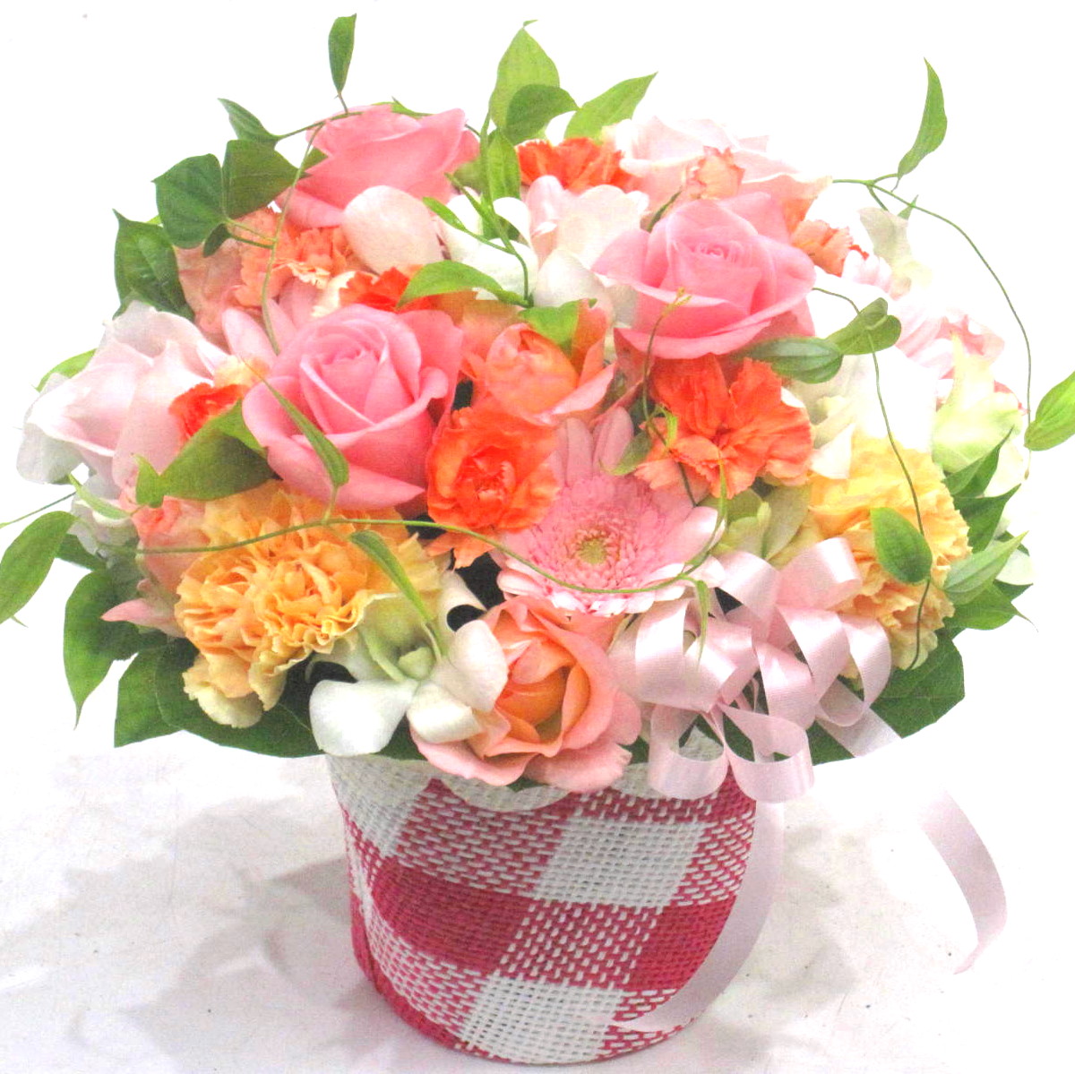 資材・ラッピング: チェック柄バスケット(変更になる可能性があります)、リボン、吸水性スポンジ、取扱説明書