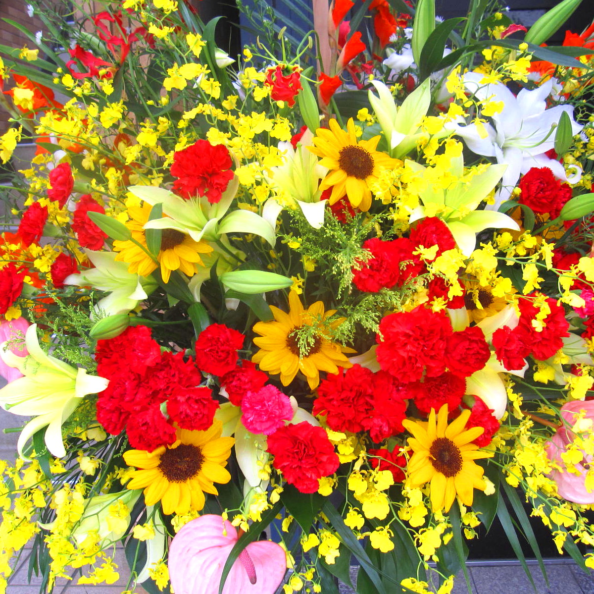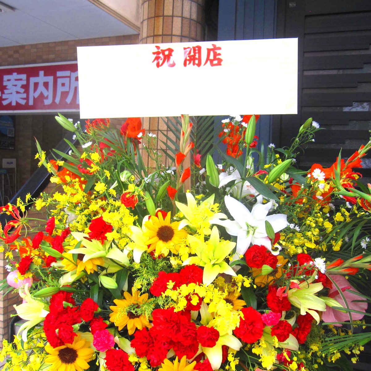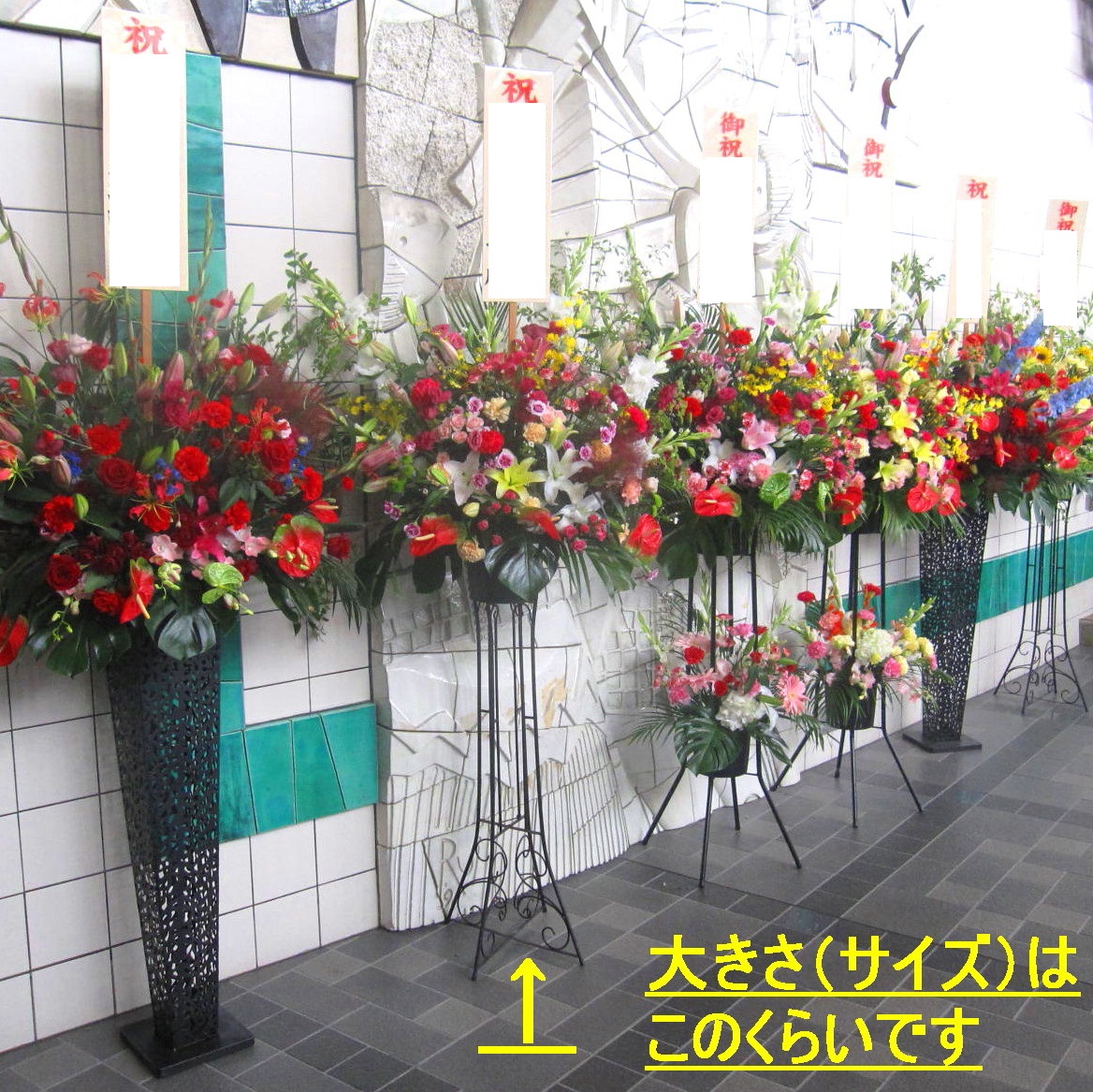 御祝いスタンド花1段になります。開店祝・発表会・個展・イベントなどパッと目を惹く花のオブジェそれぞれのシーンに合わせてお作り致します。どんな場所にもシンプルに飾れて、それぞれのシーンを華やかに彩ります。また、ご利用されたお客様から「大変花持ちが良い」と好評をいただいております。静岡県長泉町から日本全国【真心】込めてお届けいたします。さまざまなご用途に贈る贈り物としてオススメです。大切な方へ贈るフラワーギフトやプレゼントなら「花樹園オンラインドットコム」に是非、お任せ下さいませ。「当日配達可能地域」北海道・青森県・秋田県・岩手県・宮城県・山形県・福島県・茨城県・栃木県・群馬県・埼玉県・千葉県・東京都・神奈川県・山梨県・新潟県・長野県・富山県・石川県・福井県・岐阜県・静岡県・愛知県・三重県・滋賀県・京都府・大阪府・兵庫県・奈良県・和歌山県・鳥取県・島根県・岡山県・広島県・山口県・徳島県・香川県・愛媛県・高知県・福岡県・佐賀県・長崎県・熊本県・大分県・宮崎県・鹿児島県・沖縄県 ※イベントが無事終わりましたら、スタンドの台と立て札を無料で回収に伺います。ご安心下さい。