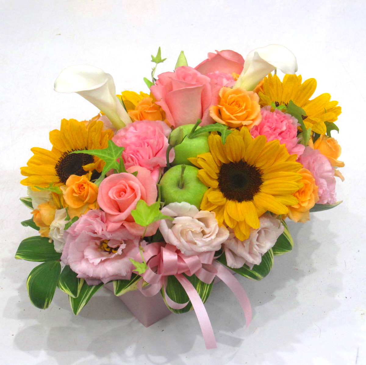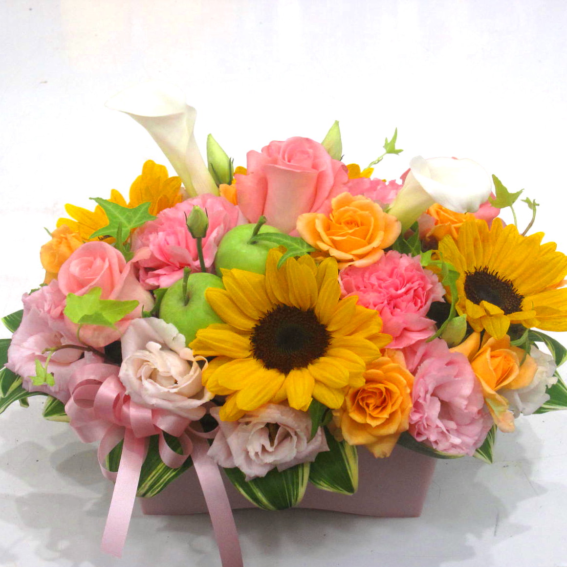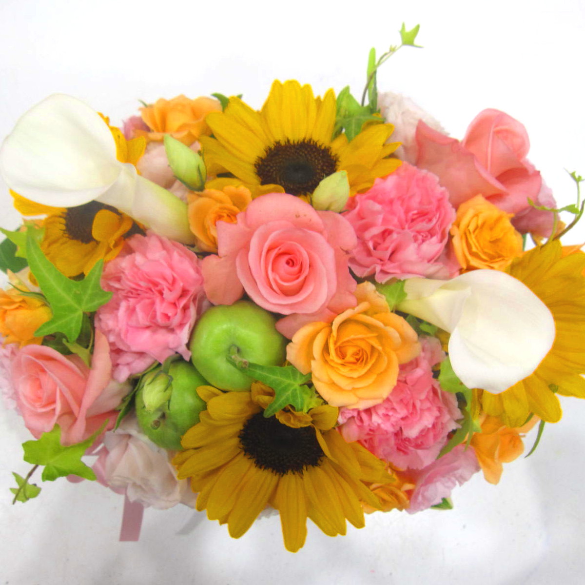 花材: メイン ひまわり、バラ、カーネーション、トルコギキョウなど その他 実物類、葉物類など