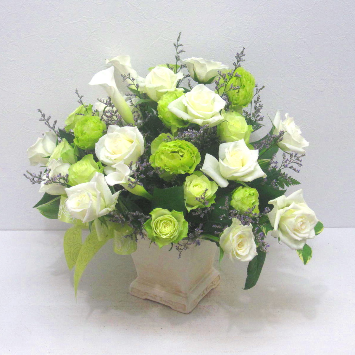アンティークなお洒落な花器に、清楚で素敵な白いバラやトルコギキョウをアレンジしました。シンプルなスタイルでお洒落にアレンジ、ボリューム感もあります。いつもとは違う贈り物でしたらこちらの商品をプレゼントしてみては如何でしょうか!?きっととびっきりに喜んでいたただけると思います。当店ではお客様の想い大切に【こころを込めて】お作りいたします。静岡県長泉町から手渡しお届けまたは宅急便で全国にお届けします。是非、さまざまな贈り物に。