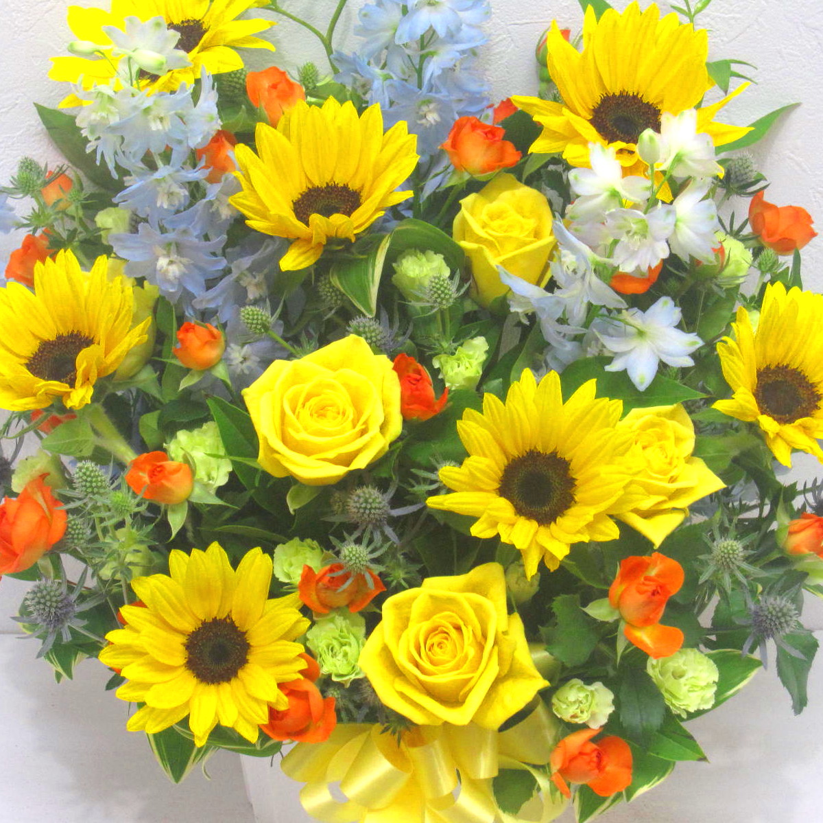 花材: メイン ヒマワリ、バラ、ミニカーネーション、デルフィニュームなど その他 葉物類など
