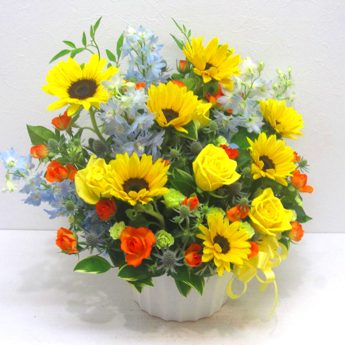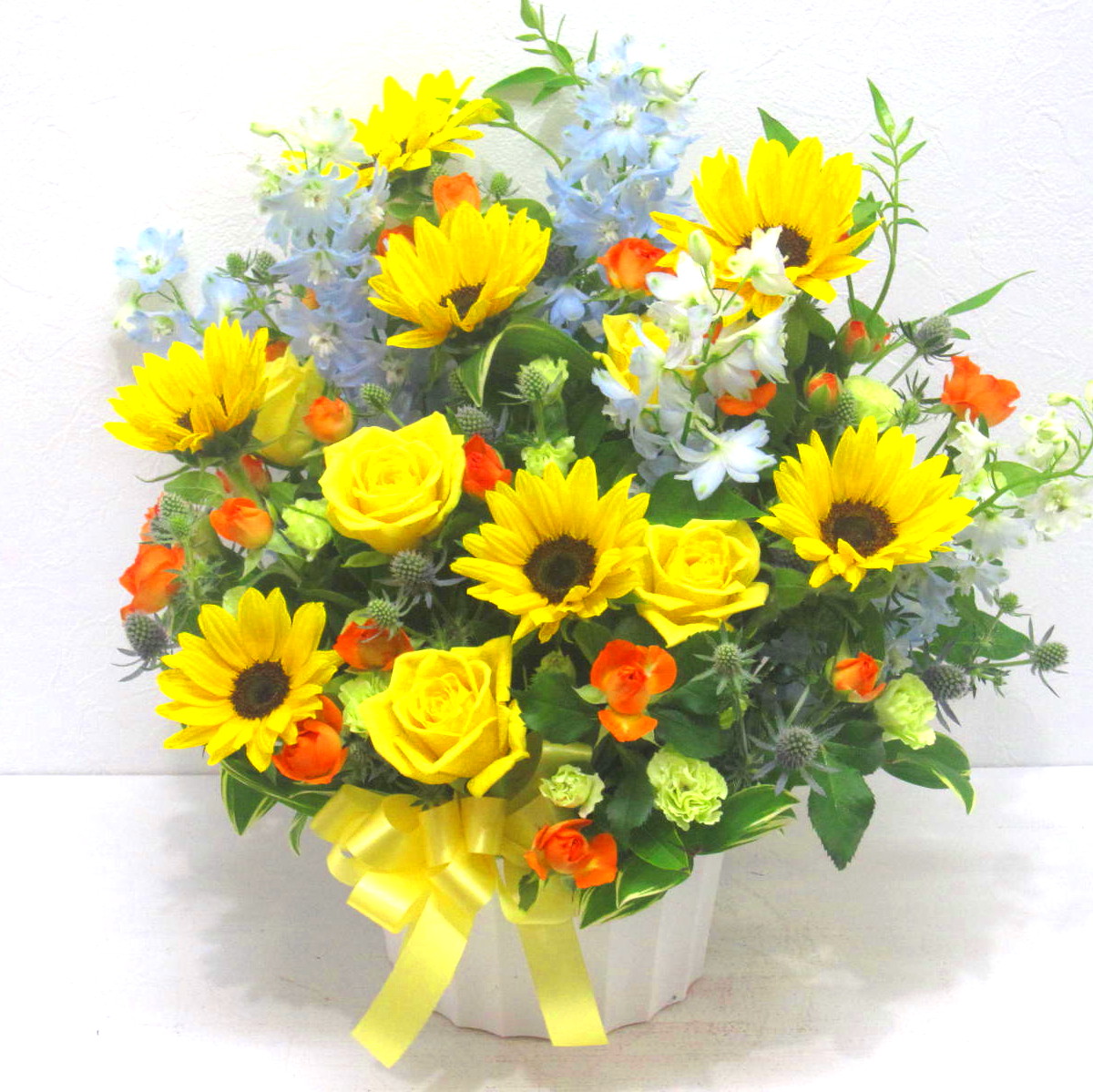 大人気【ひまわり】を入れたイエロー&オレンジ&ブルー系のアレンジメントです。上品な雰囲気で爽やかにボリュームよく作っておりますので華やかですよ。きっととびっきりに喜んでいたただけると思います。また、持ちの良いお花を中心に使っておりますので花持ちも良いでしょう。ご購入されたお客様から高い評価を頂いております。静岡県長泉町から日本全国【真心】込めてお届けいたします。さまざまなご用途に贈る贈り物としてオススメです。大切な方へ贈るフラワーギフトやプレゼントなら「花樹園オンラインドットコム」に是非、お任せ下さいませ。