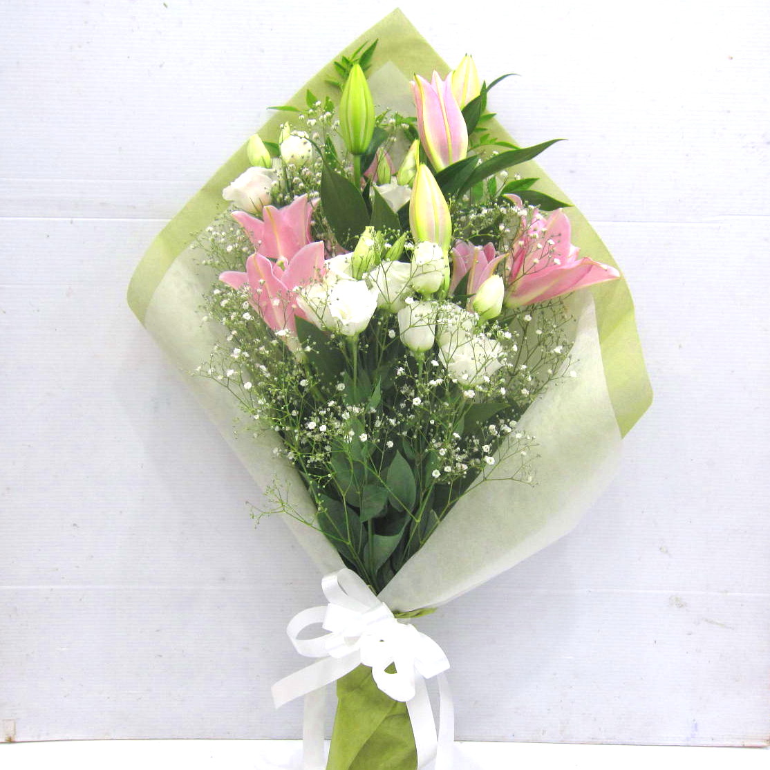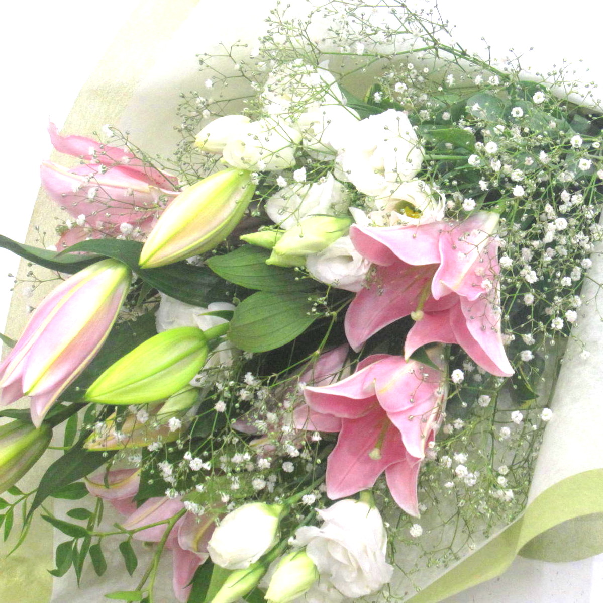 花材: メイン ユリ、トルコギキョウなど その他 かすみ草、葉物類など