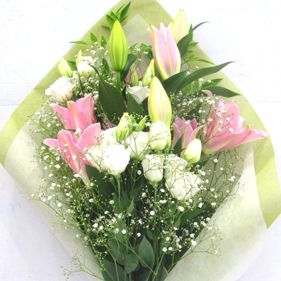 故人を偲ぶ御供用の花束です。ピンクユリを入れて洋花で白系のお花を入れて上品にお作りします。当店ではお客様の想い大切に【こころを込めて】お作りいたします。静岡県長泉町から手渡しお届けまたは宅急便で全国にお届けします。故人を偲ぶさまざまなシーンでお使い頂けます。