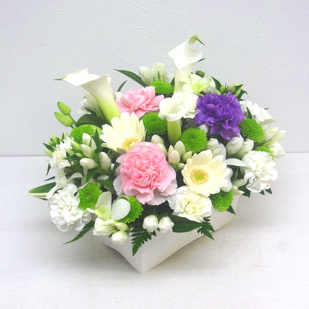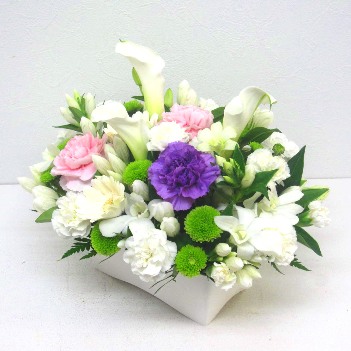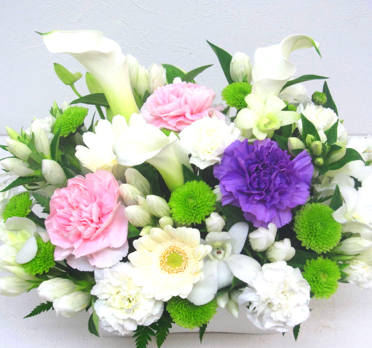 あの人を偲んで…。白系主体にポイントに淡い色を入れた御供え用アレンジです。洋花で上品にお作りします。わりと横に長いアレンジですのでご仏壇にも上を気にせず飾れると思います。当店ではお客様の想い大切に【こころを込めて】お作りいたします。静岡県長泉町から手渡しお届けまたは宅急便で全国にお届けします。故人を偲ぶさまざまなシーンでお使い頂けます。