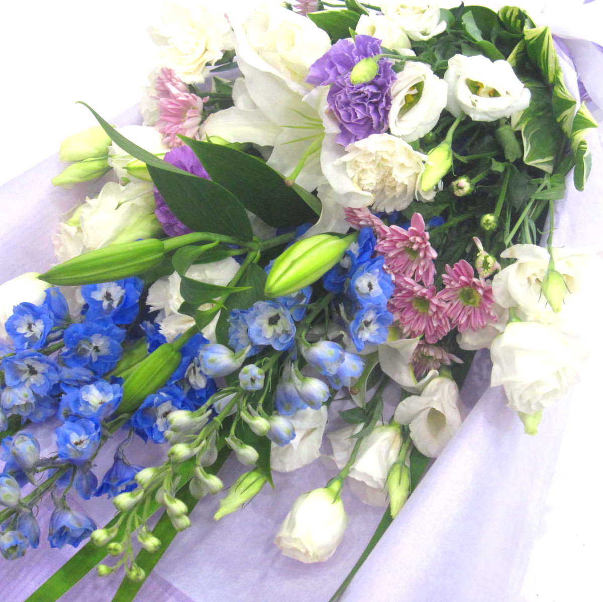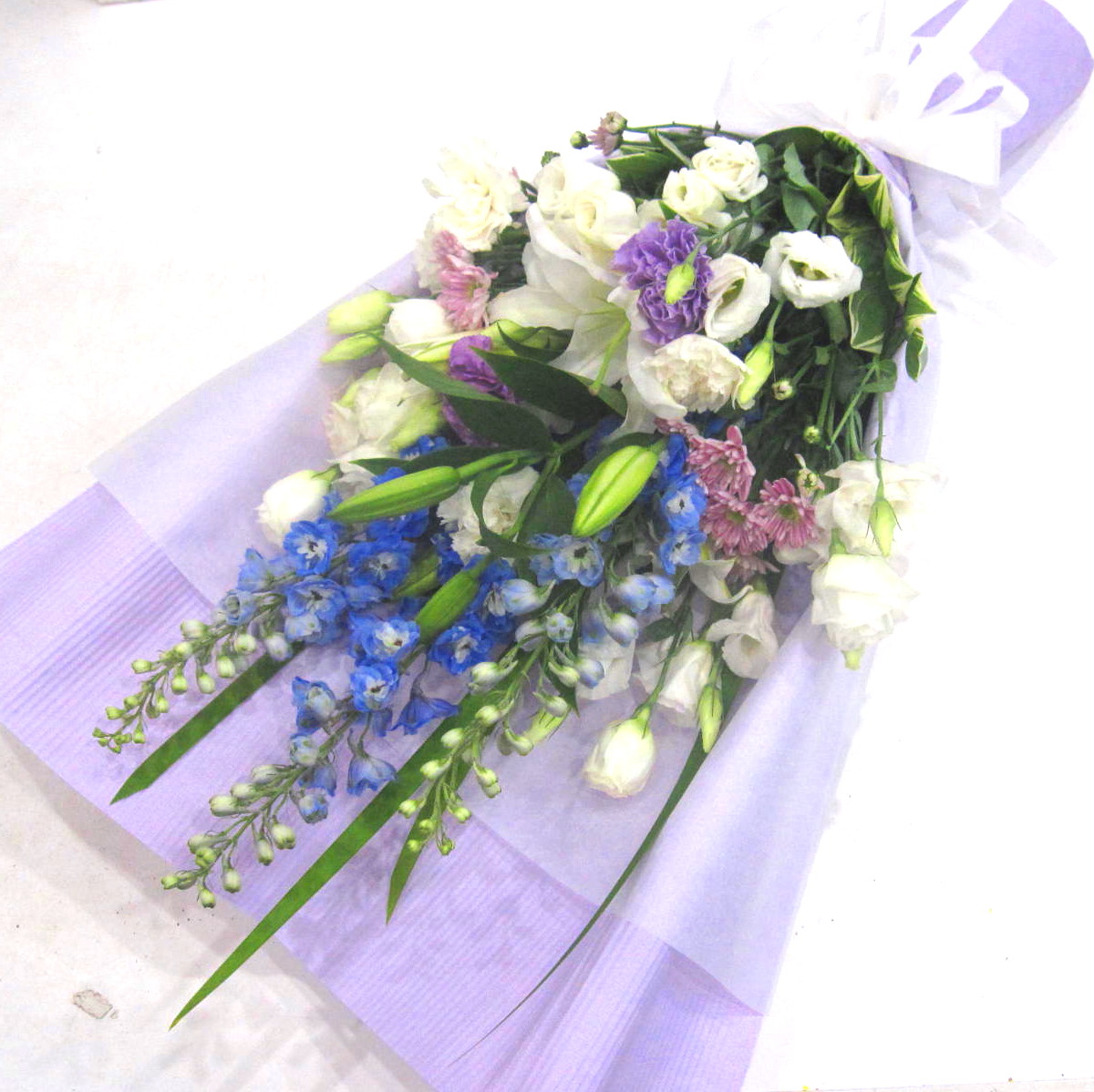 故人を偲ぶ御供用の花束です。ユリを入れて洋花でお色を入れて涼しげにお作りします。当店ではお客様の想い大切に【こころを込めて】お作りいたします。静岡県長泉町から手渡しお届けまたは宅急便で全国にお届けします。故人を偲ぶさまざまなシーンでお使い頂けます。