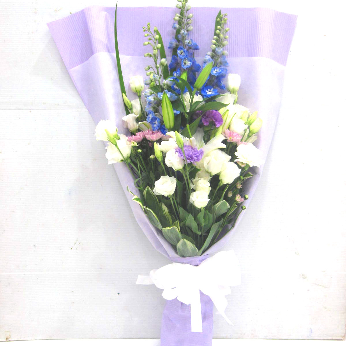 花材: メイン ユリ、トルコギキョウ、デルフィニューム、季節のお花など その他 葉物類など