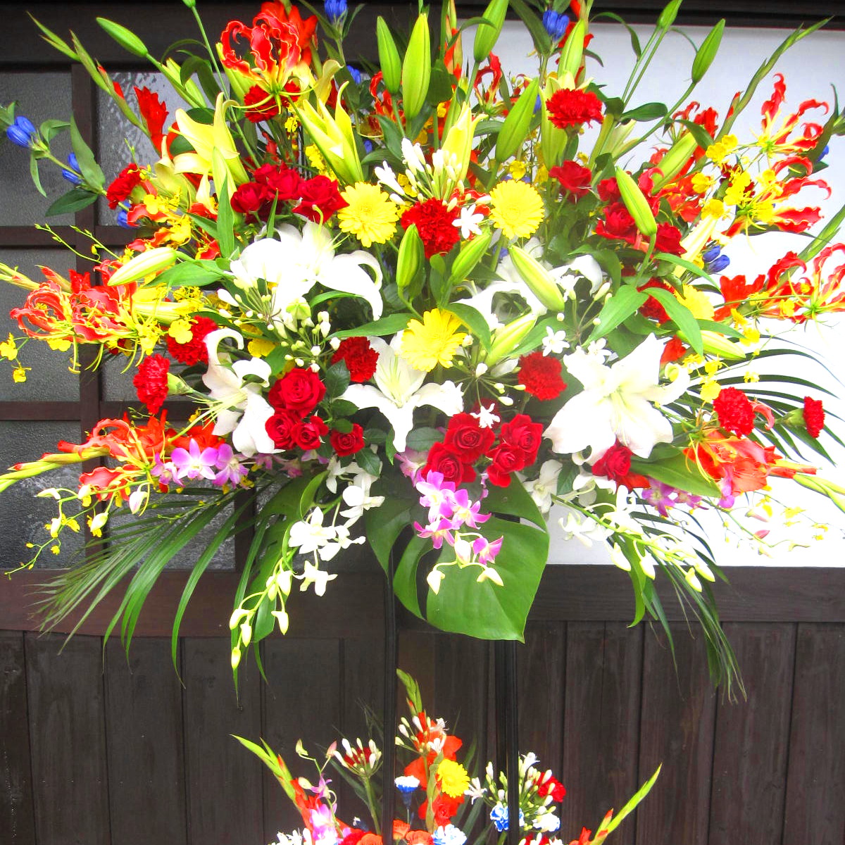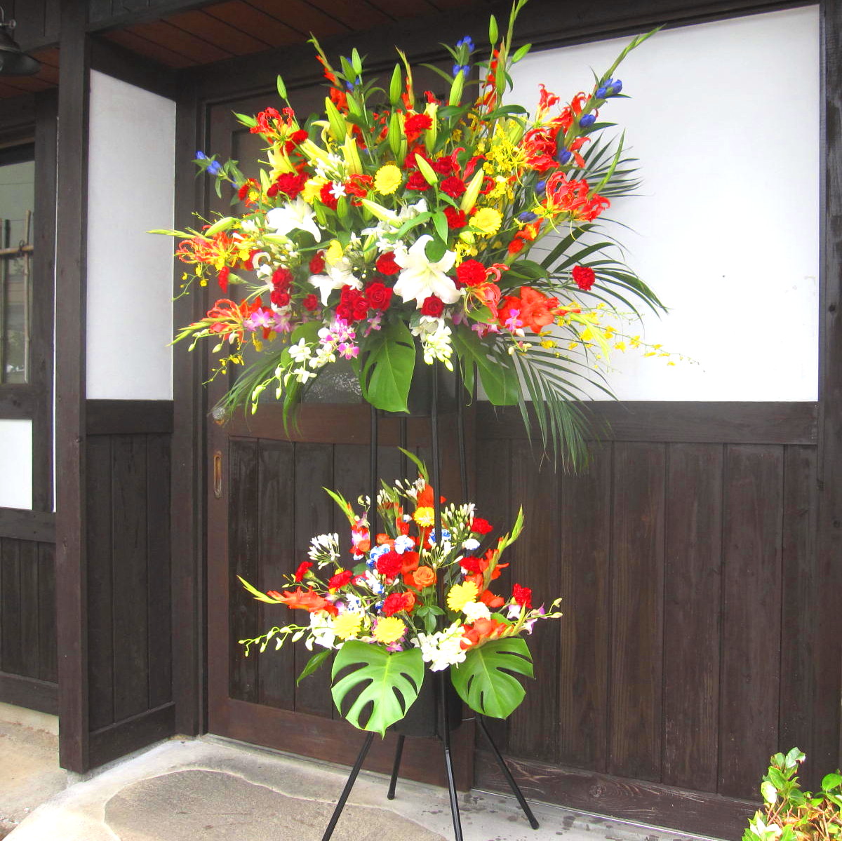 華やかな御祝いスタンド花2段になります。開店祝・発表会・個展・イベントなどパッと目を惹く花のオブジェそれぞれのシーンに合わせてお作り致します。どんな場所にもシンプルに飾れて、それぞれのシーンを華やかに彩ります。また、ご利用されたお客様から「大変花持ちが良い」と好評をいただいております。静岡県長泉町から日本全国【真心】込めてお届けいたします。さまざまなご用途に贈る贈り物としてオススメです。大切な方へ贈るフラワーギフトやプレゼントなら「花樹園オンラインドットコム」に是非、お任せ下さいませ。「当日配達可能地域」北海道・青森県・秋田県・岩手県・宮城県・山形県・福島県・茨城県・栃木県・群馬県・埼玉県・千葉県・東京都・神奈川県・山梨県・新潟県・長野県・富山県・石川県・福井県・岐阜県・静岡県・愛知県・三重県・滋賀県・京都府・大阪府・兵庫県・奈良県・和歌山県・鳥取県・島根県・岡山県・広島県・山口県・徳島県・香川県・愛媛県・高知県・福岡県・佐賀県・長崎県・熊本県・大分県・宮崎県・鹿児島県・沖縄県 ※イベントが無事終わりましたら、スタンドの台と立て札を無料で回収に伺います。ご安心下さい。