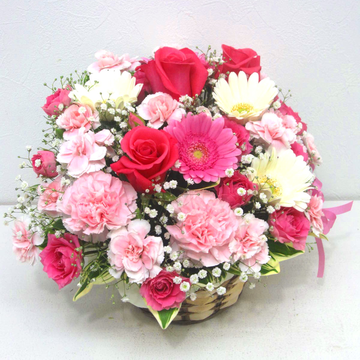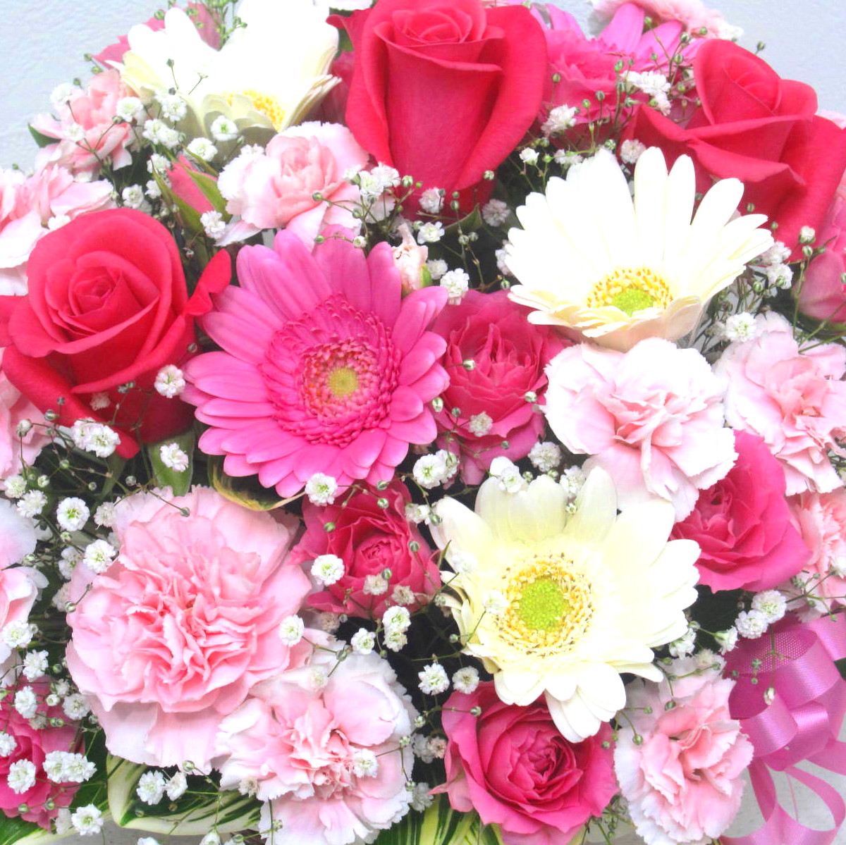 花材: メイン バラ、ガーベラ、ミニカーネーションなど その他 かすみ草、葉物類など